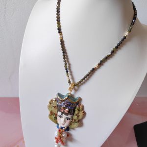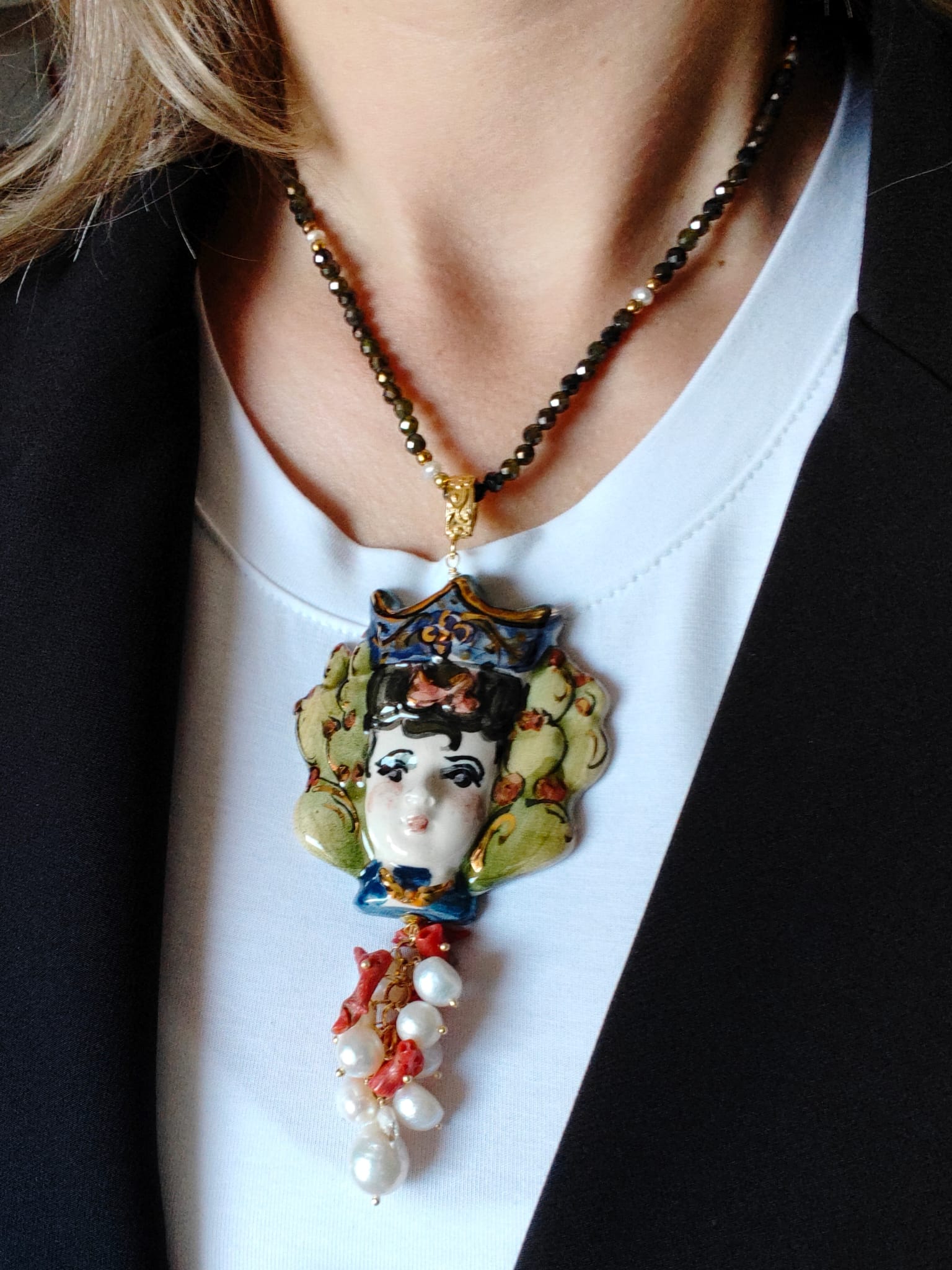 Questa collana testa di moro è un vero pezzo unico: un tributo alla Sicilia, alla sua luce e alla sua tradizione ceramica senza tempo.