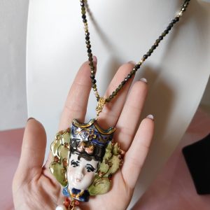 La collana testa di moro in ceramica è un gioiello che racchiude il fascino della tradizione siciliana e la raffinatezza dell’artigianato artistico. Ogni dettaglio è realizzato a mano con passione, rendendo questa creazione un’espressione autentica di eleganza mediterranea.