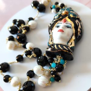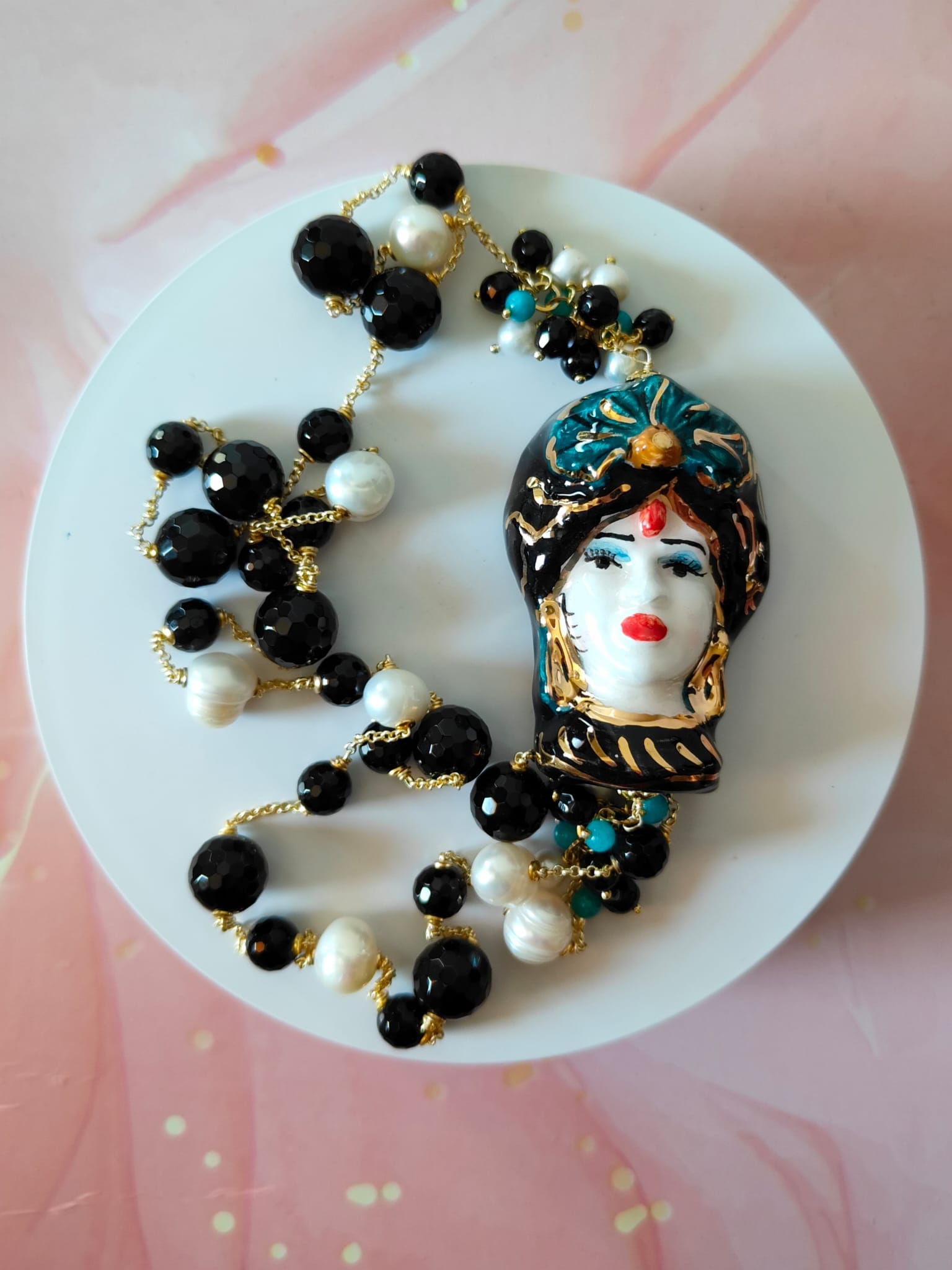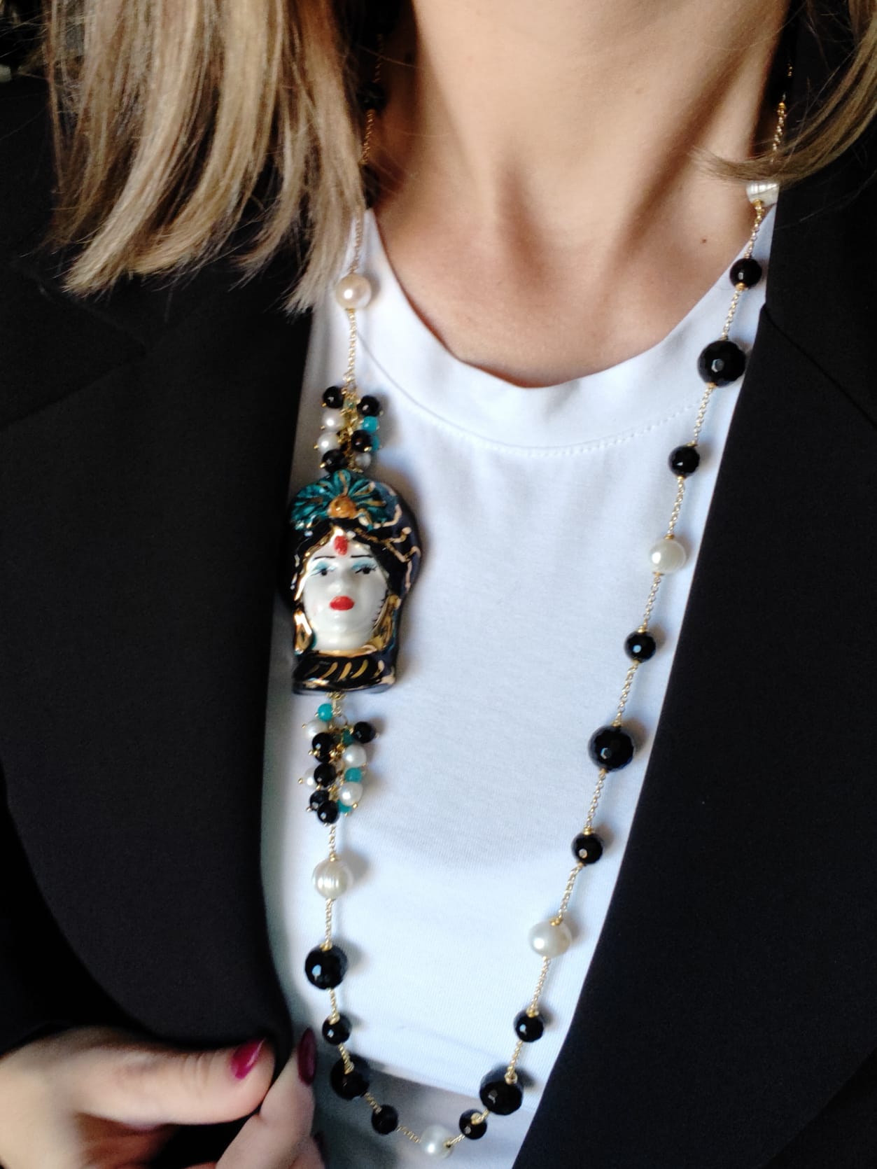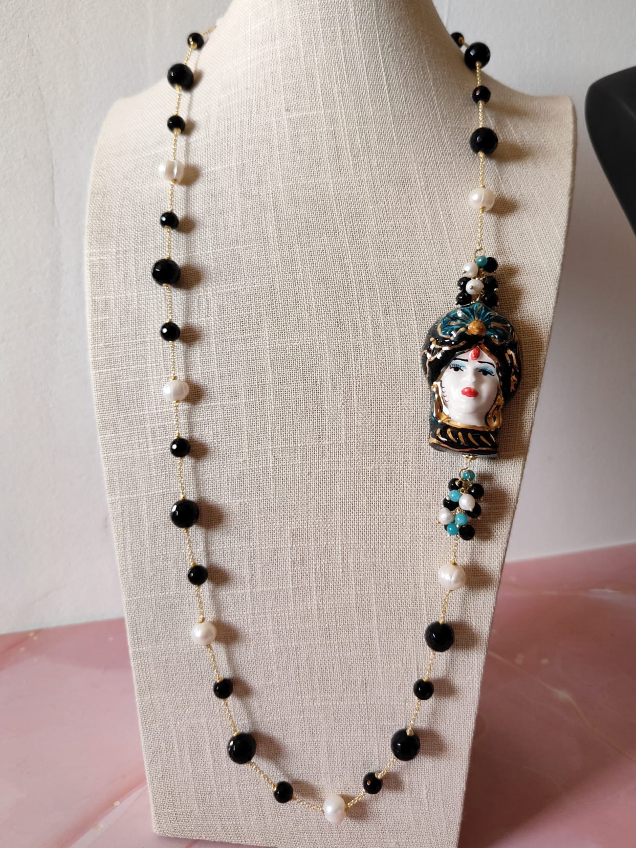 Materiali: ceramica di Caltagirone, onice nero, perle naturali, ottone dorato anallergico.
