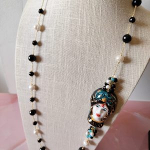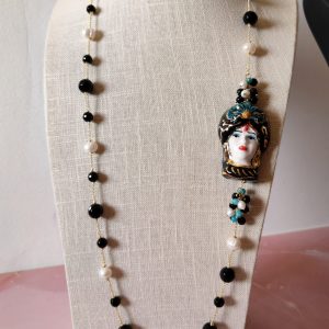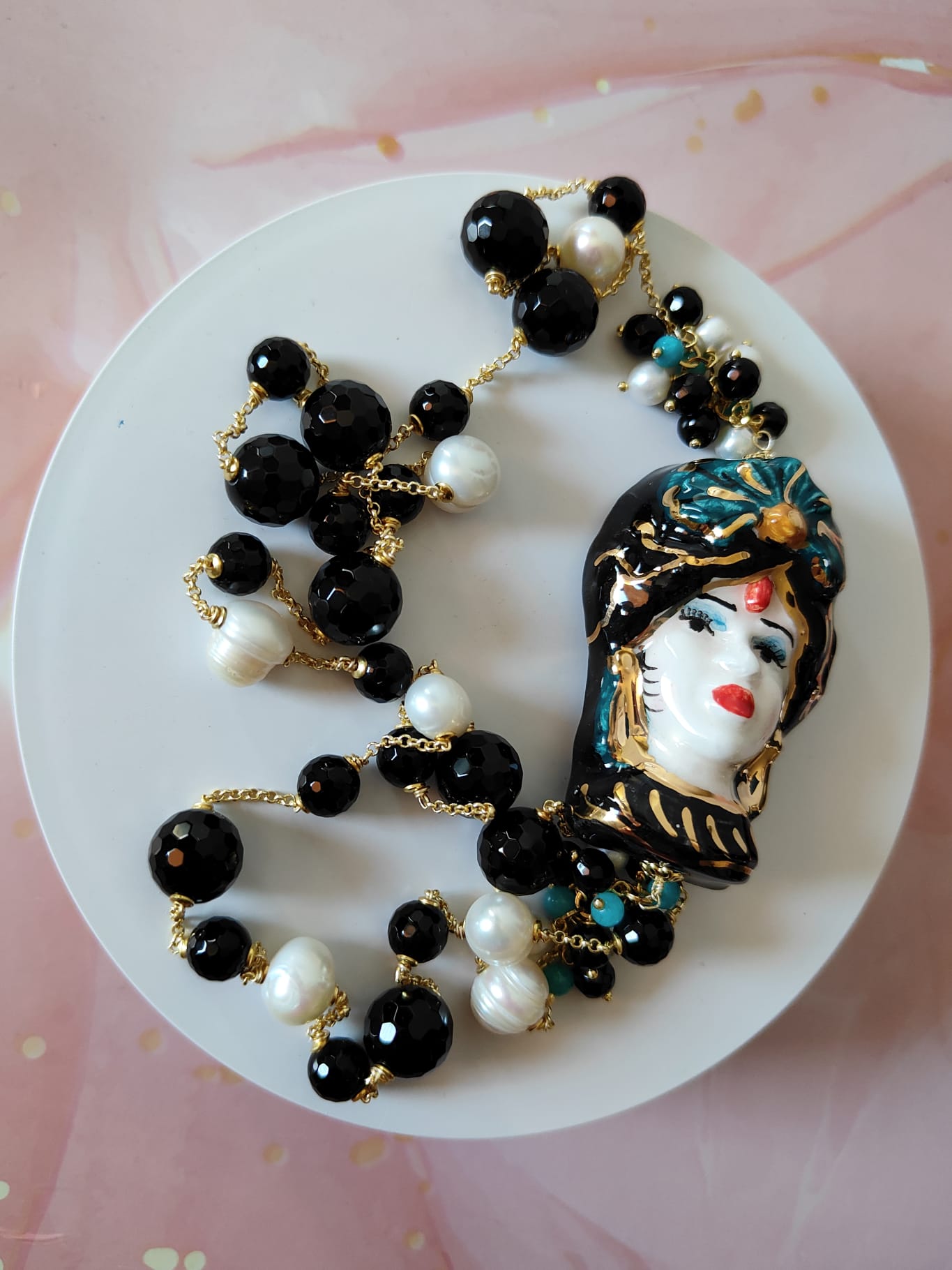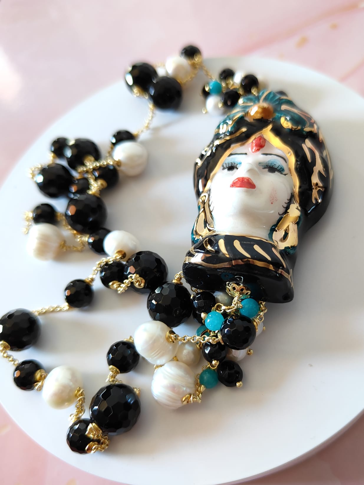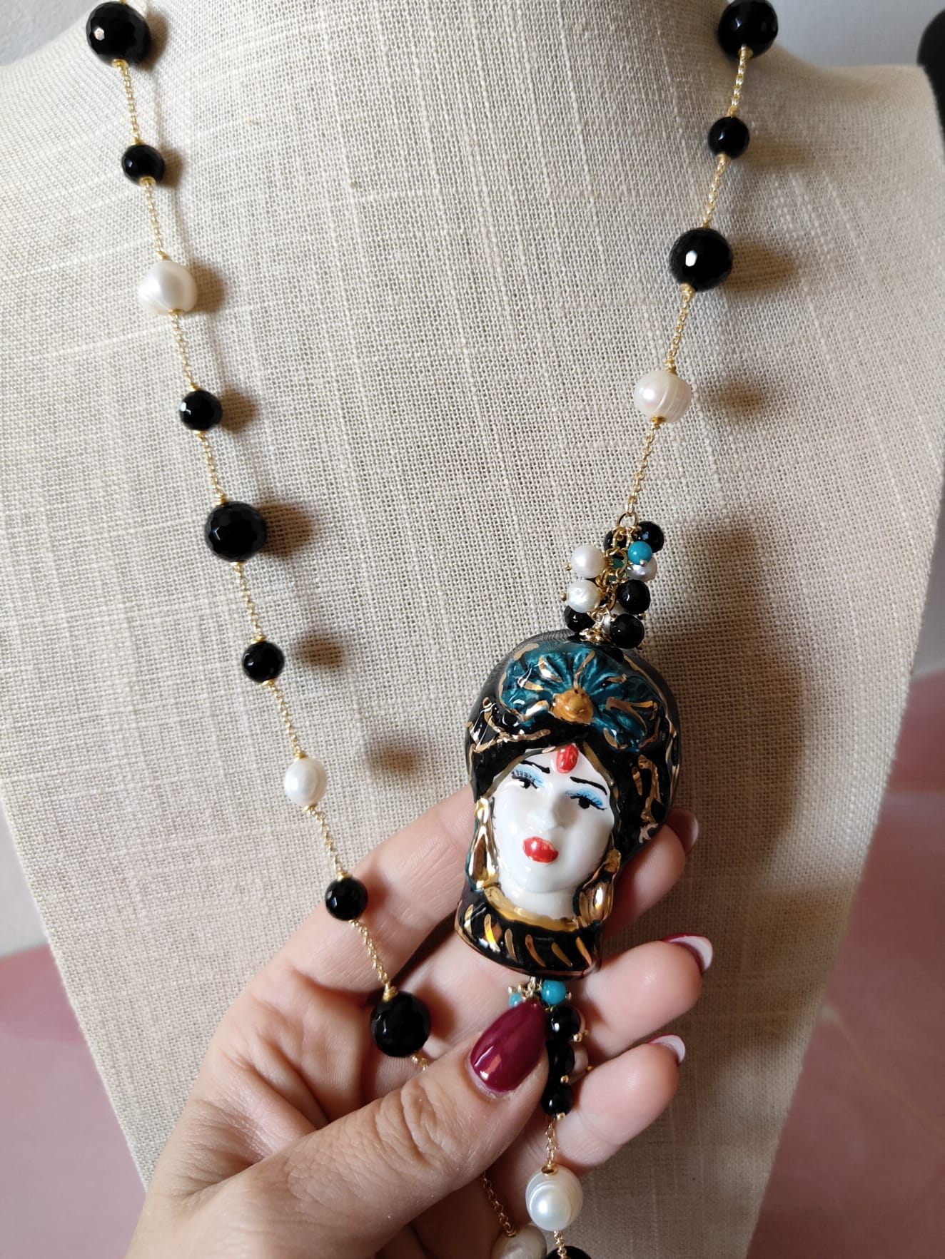 Materiali: ceramica di Caltagirone, onice nero, perle naturali, ottone dorato anallergico.