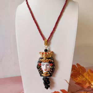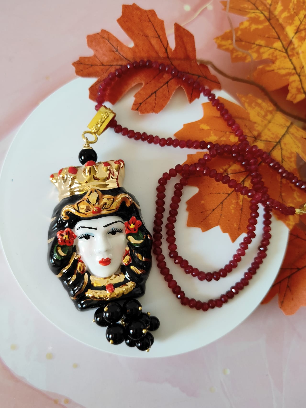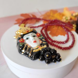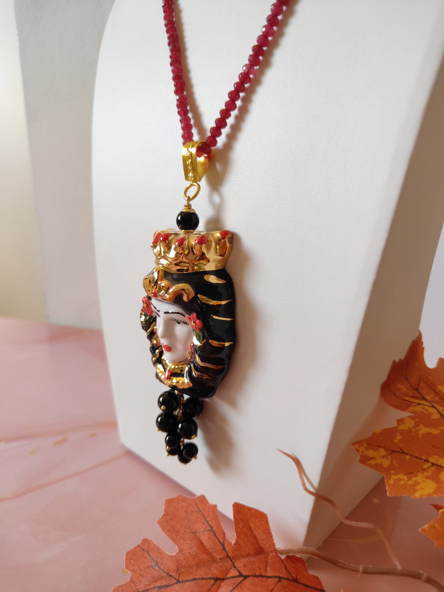 Il cuore della collana è il pendente: una magnifica testa di moro in ceramica di Caltagirone, interamente dipinta a mano. I tratti femminili sono resi con grande cura, mentre i dettagli dorati e i fiori rossi nel decoro richiamano la ricchezza della tradizione isolana. Ogni creazione è diversa, e proprio per questo porta con sé l’autenticità del lavoro artigianale.
