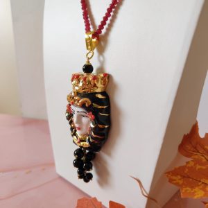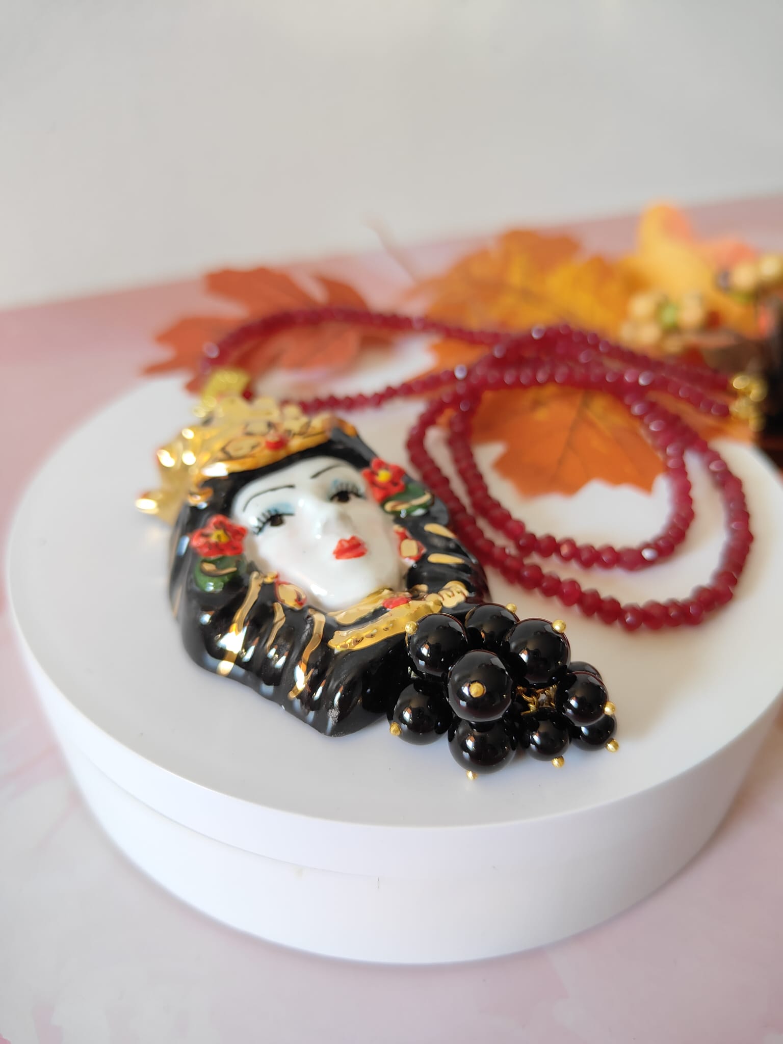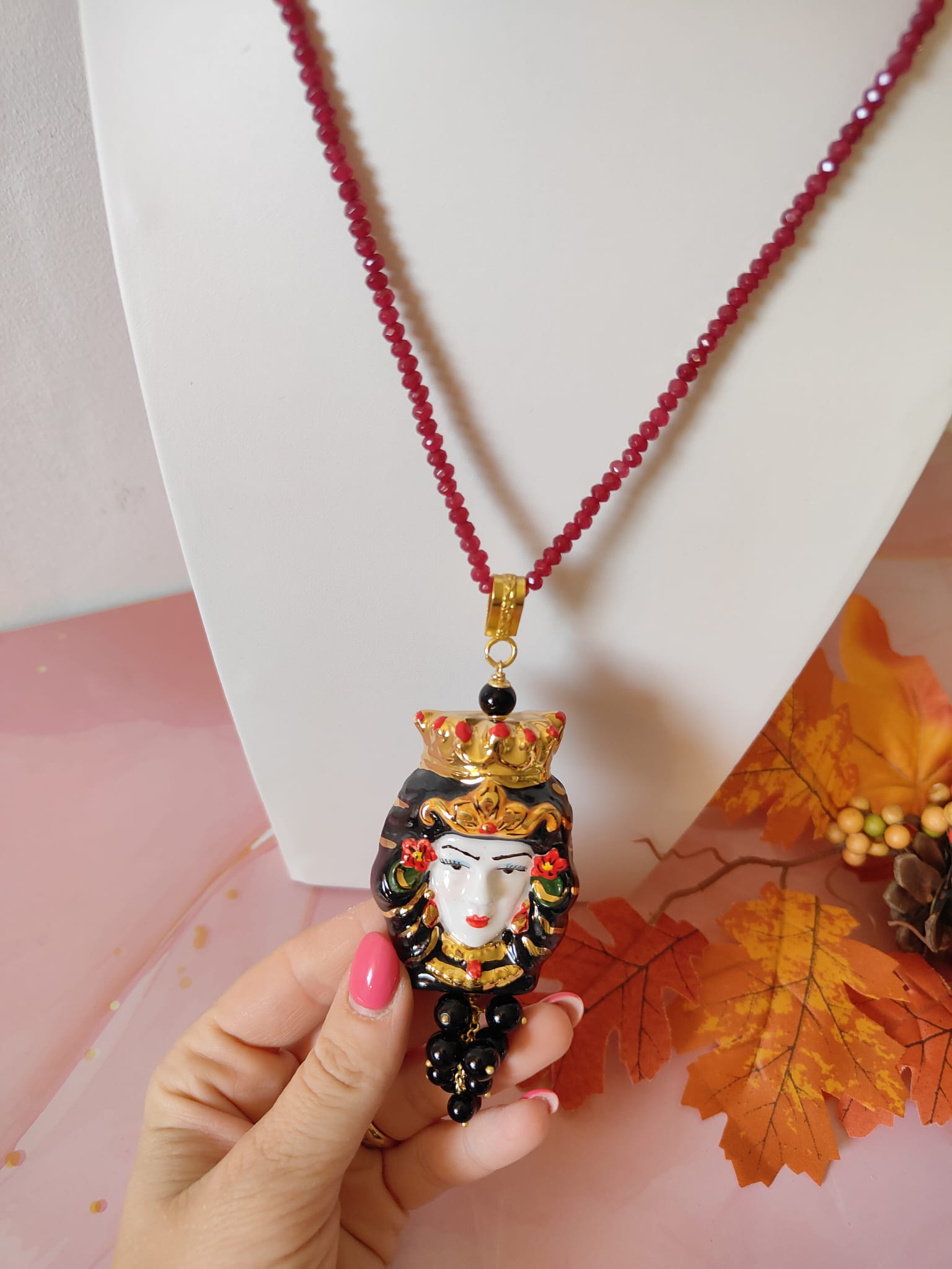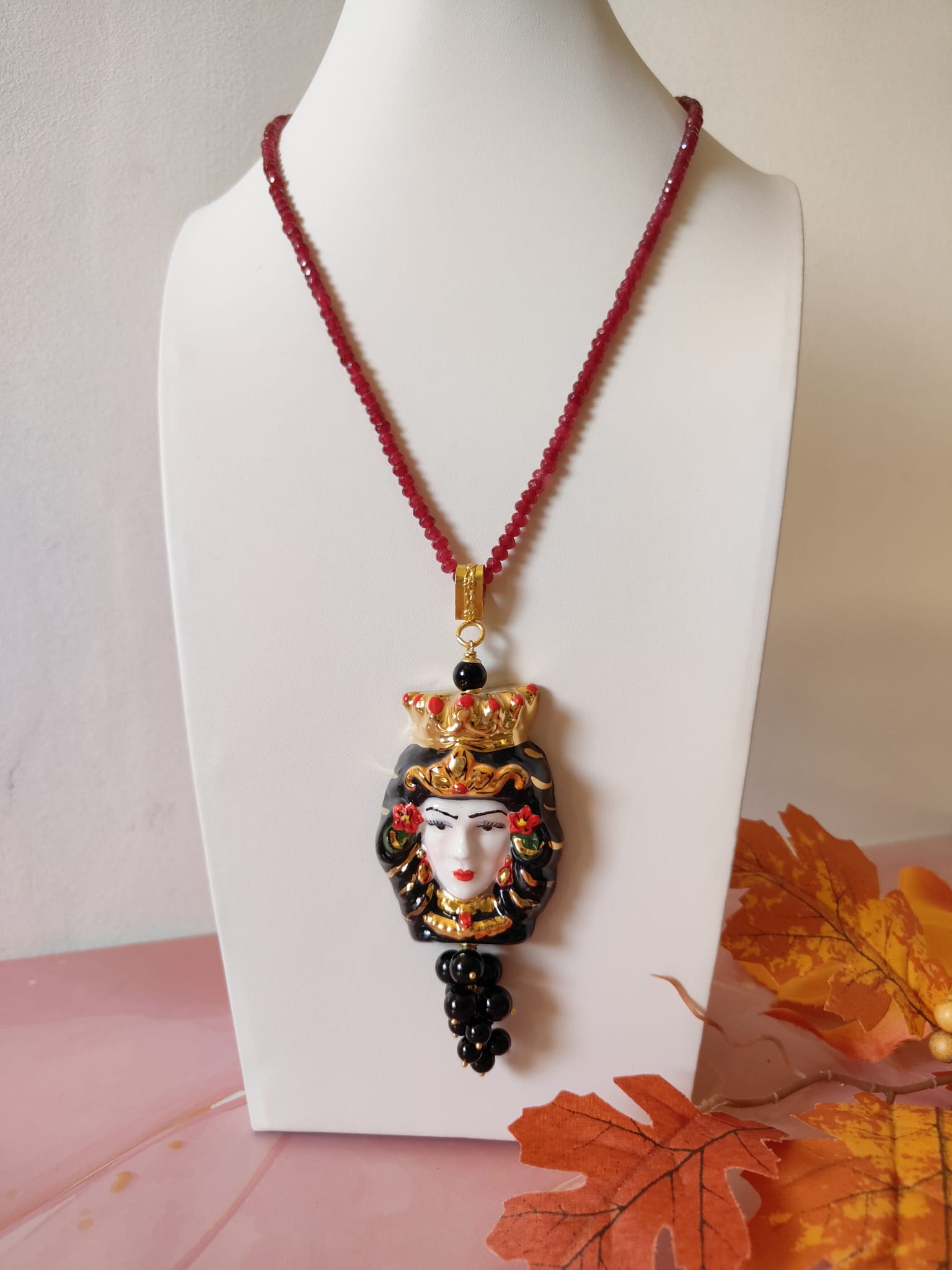 Il cuore della collana è il pendente: una magnifica testa di moro in ceramica di Caltagirone, interamente dipinta a mano. I tratti femminili sono resi con grande cura, mentre i dettagli dorati e i fiori rossi nel decoro richiamano la ricchezza della tradizione isolana. Ogni creazione è diversa, e proprio per questo porta con sé l’autenticità del lavoro artigianale.
