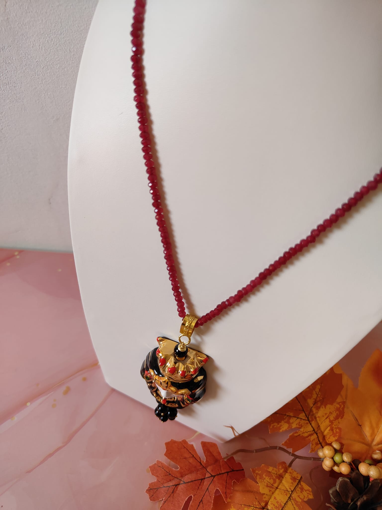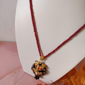 Alla base del pendente, un grappolo di sfere di onice nero completa la composizione. Queste pietre, lucide e profonde, aggiungono carattere al gioiello e creano un contrasto elegante con i colori vivaci della ceramica e della catenina. Così, la collana diventa un accessorio dal fascino intenso e originale.