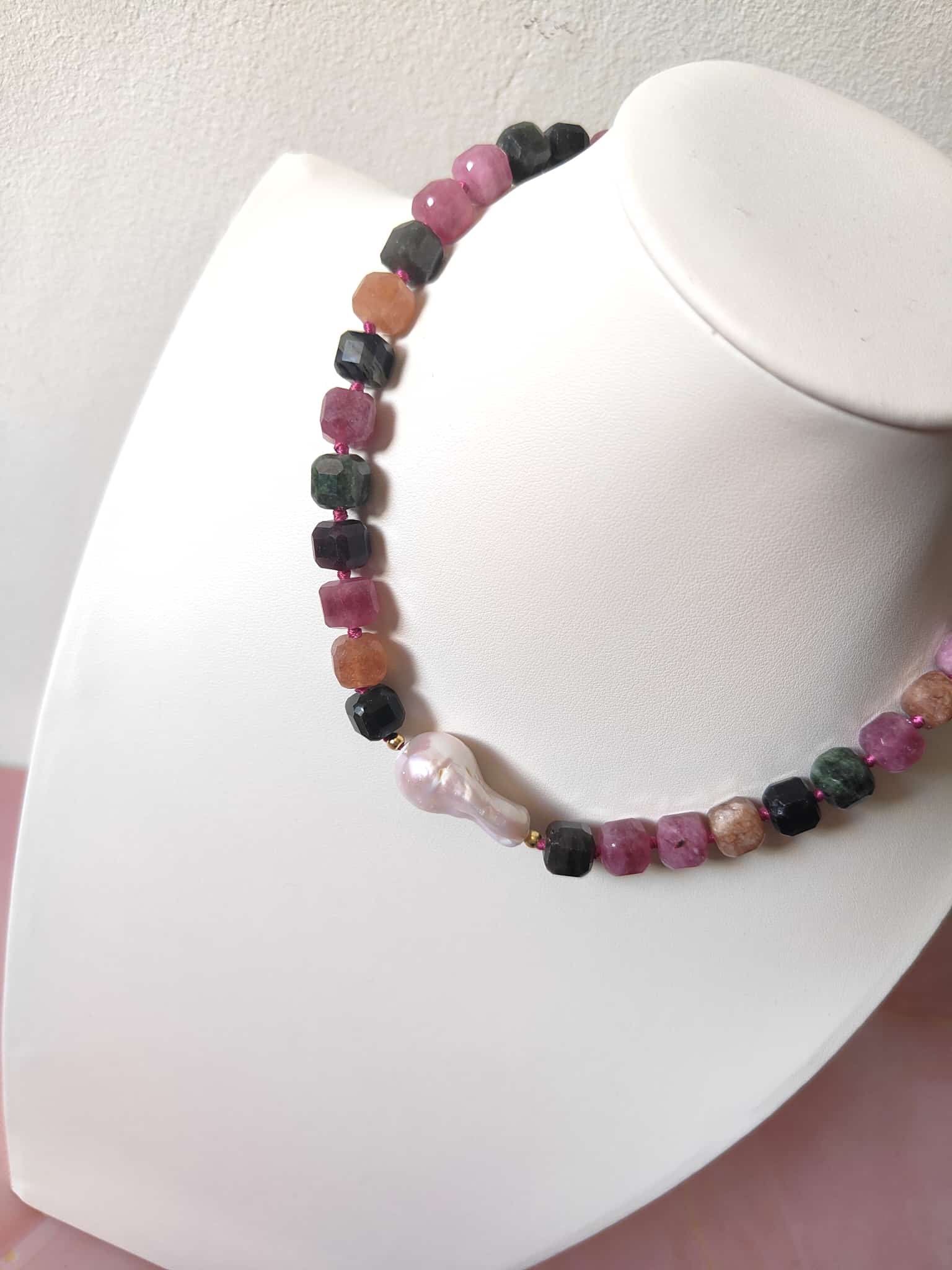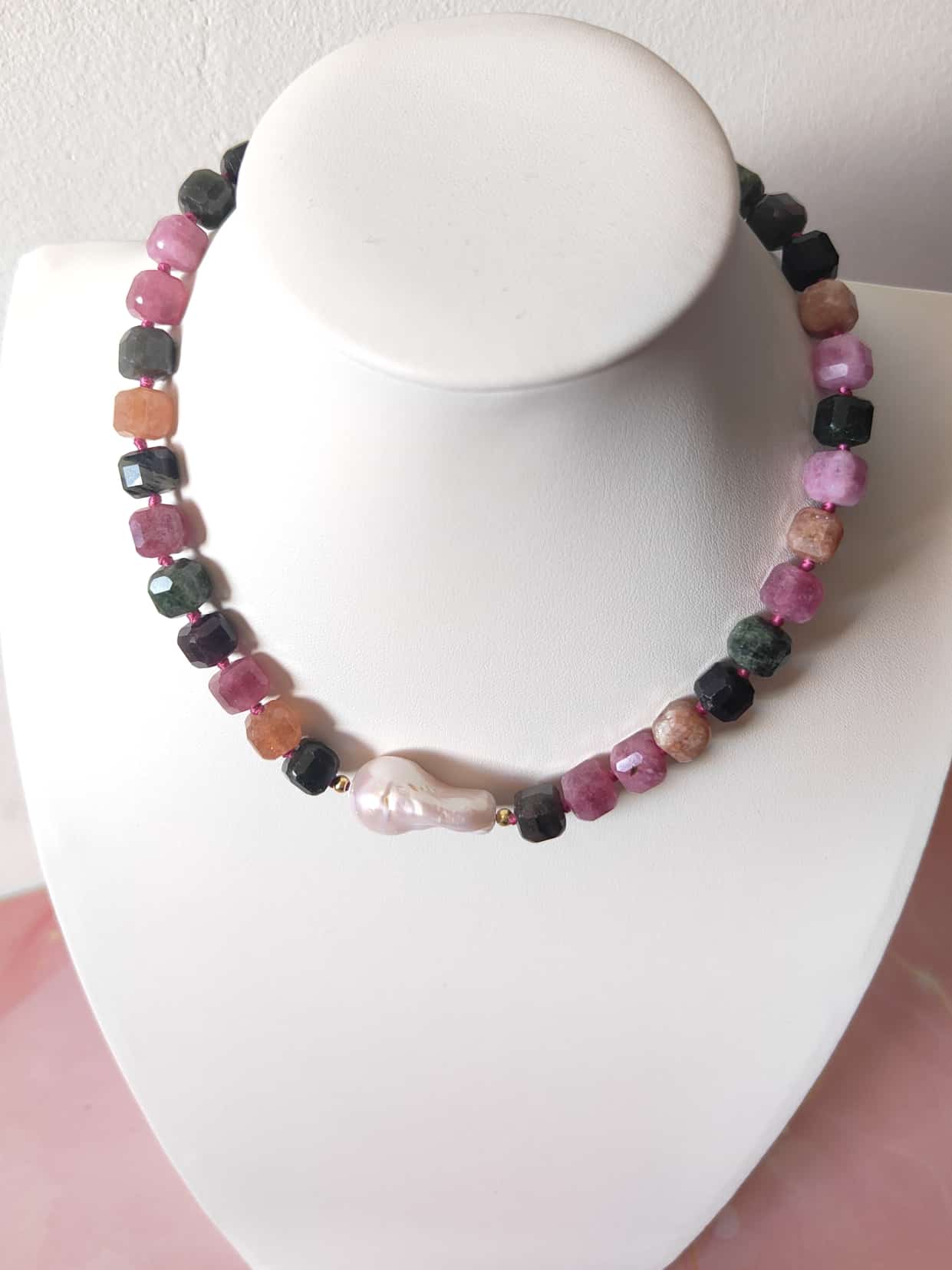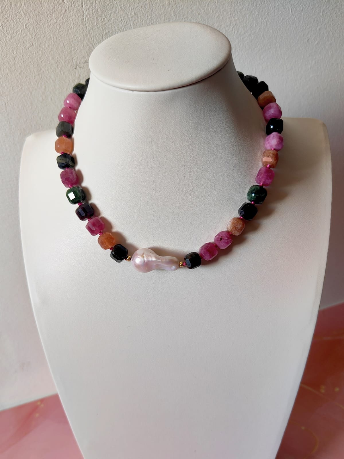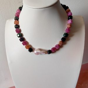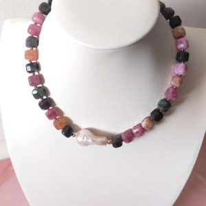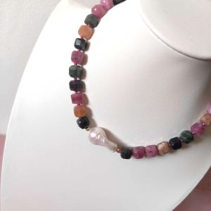 La collana è composta da tormaline naturali multicolore tagliate a cubetti sfaccettati, nelle tonalità del rosa, verde, arancio e nero, alternate da piccoli inserti dorati in argento che donano luce e ritmo alla composizione. Al centro, una splendida perla barocca dalle forme morbide e irregolari cattura lo sguardo con il suo candore cangiante. La chiusura è realizzata in argento 925 placcato oro, garanzia di qualità e durabilità.