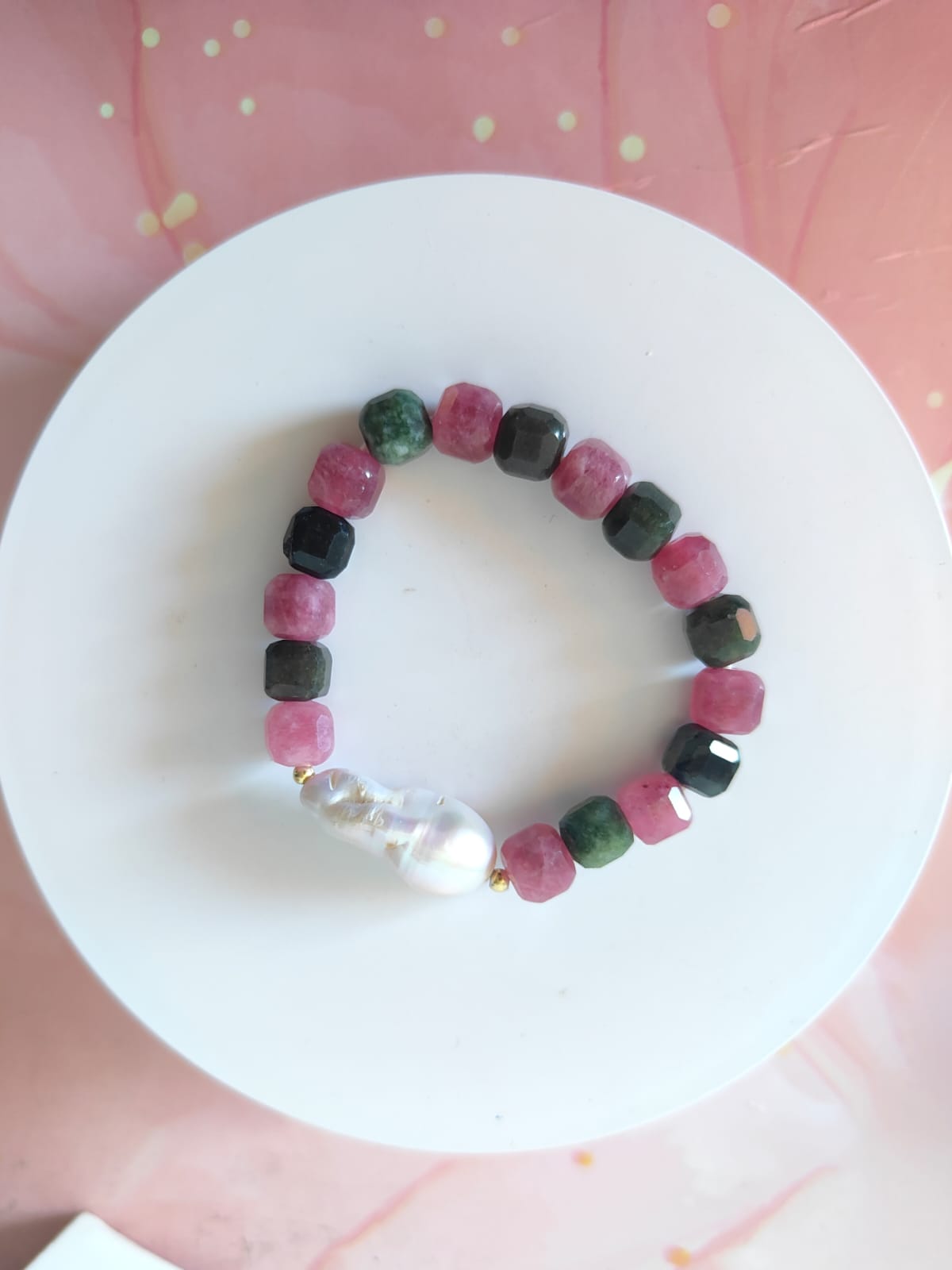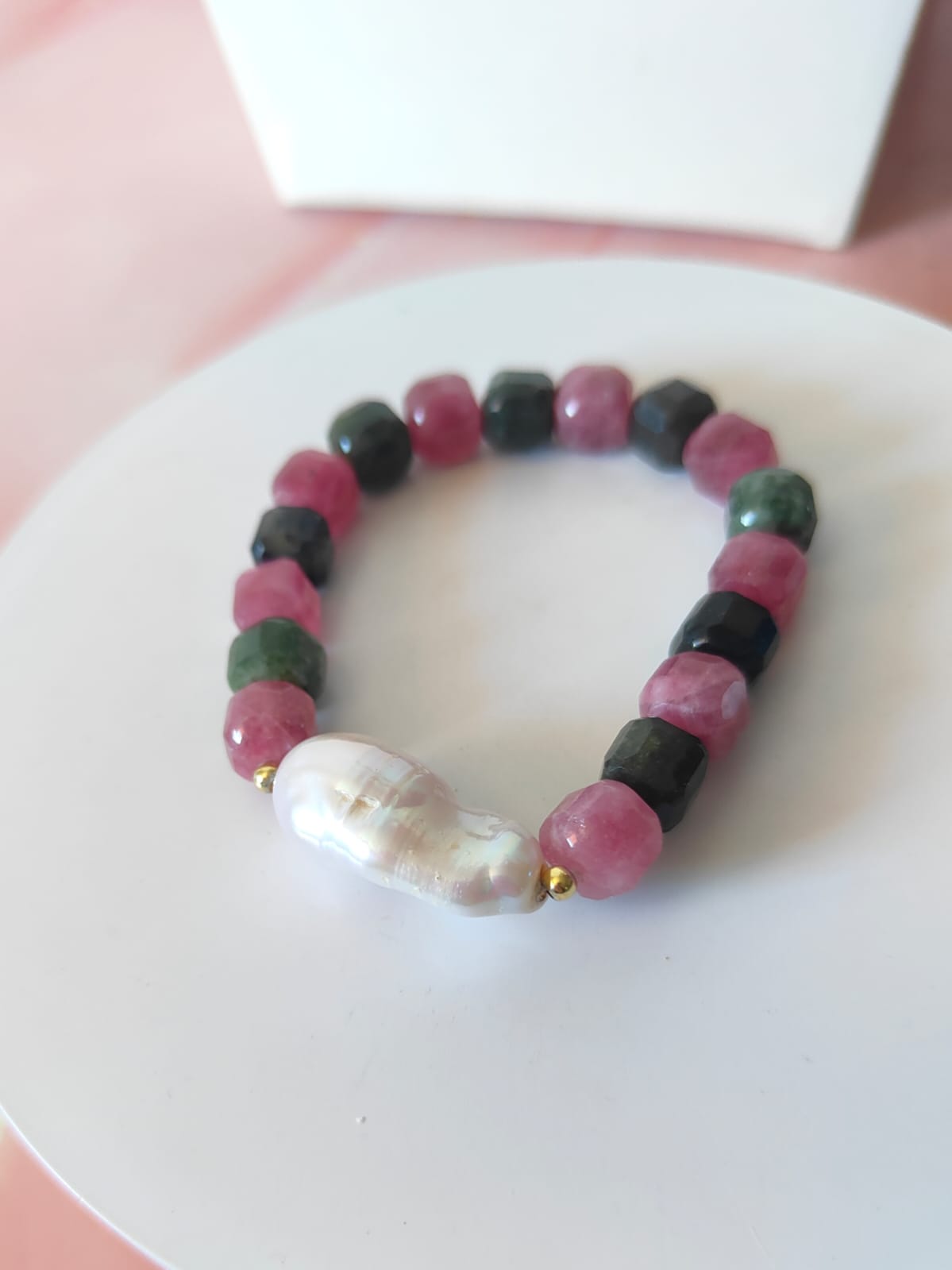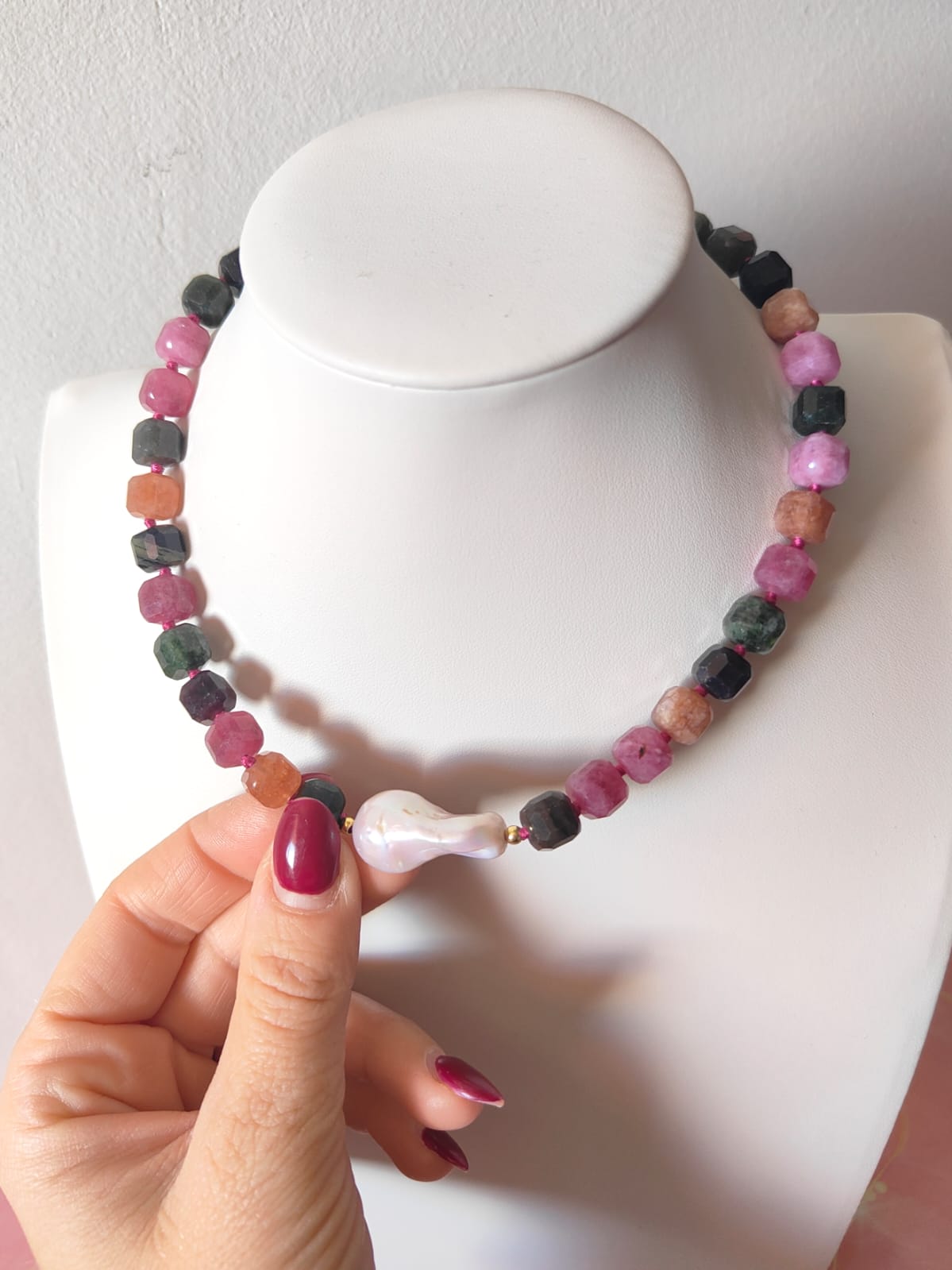 La collana è composta da tormaline naturali multicolore tagliate a cubetti sfaccettati, nelle tonalità del rosa, verde, arancio e nero, alternate da piccoli inserti dorati in argento che donano luce e ritmo alla composizione. Al centro, una splendida perla barocca dalle forme morbide e irregolari cattura lo sguardo con il suo candore cangiante. La chiusura è realizzata in argento 925 placcato oro, garanzia di qualità e durabilità.