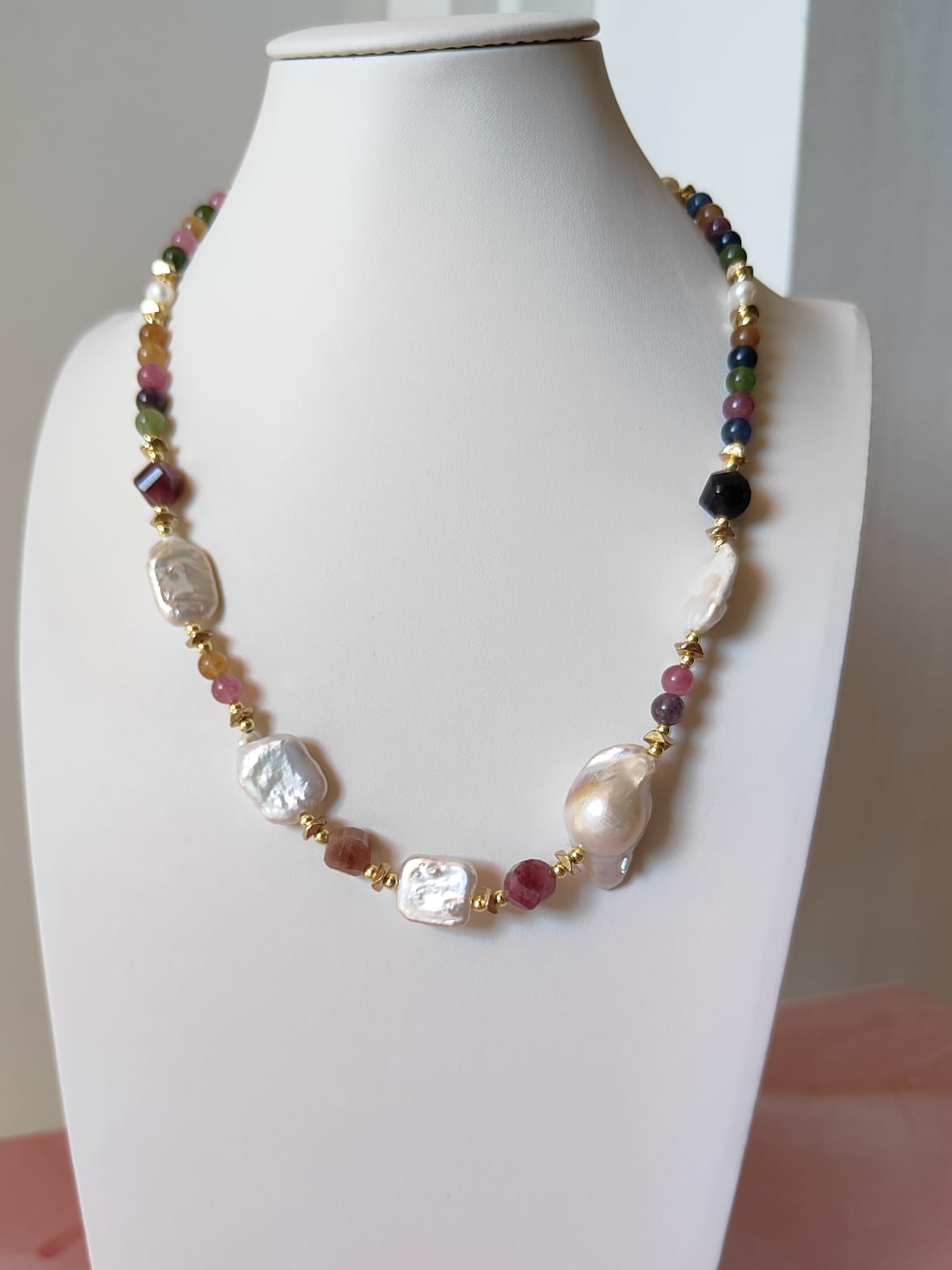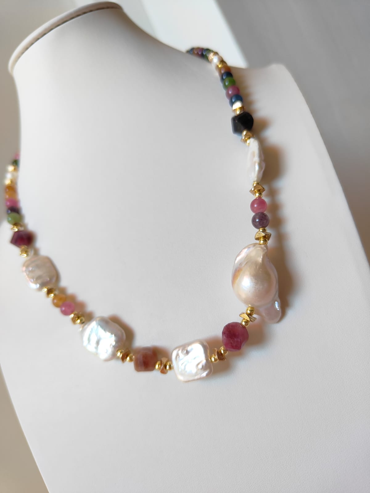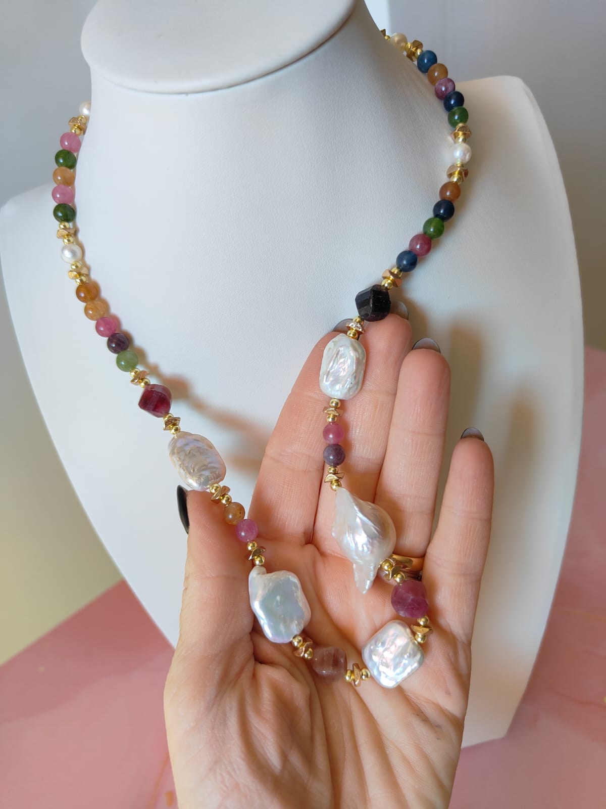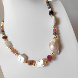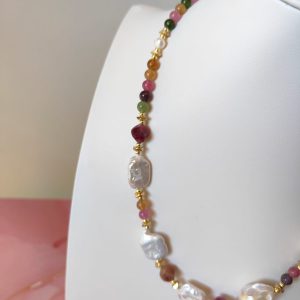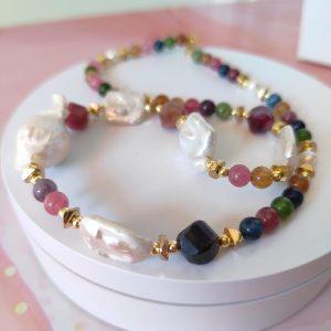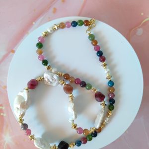 Materiali: tormalina naturale multicolor, perle barocche naturali, ematite dorata