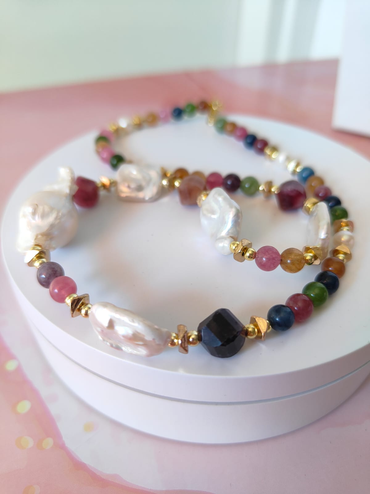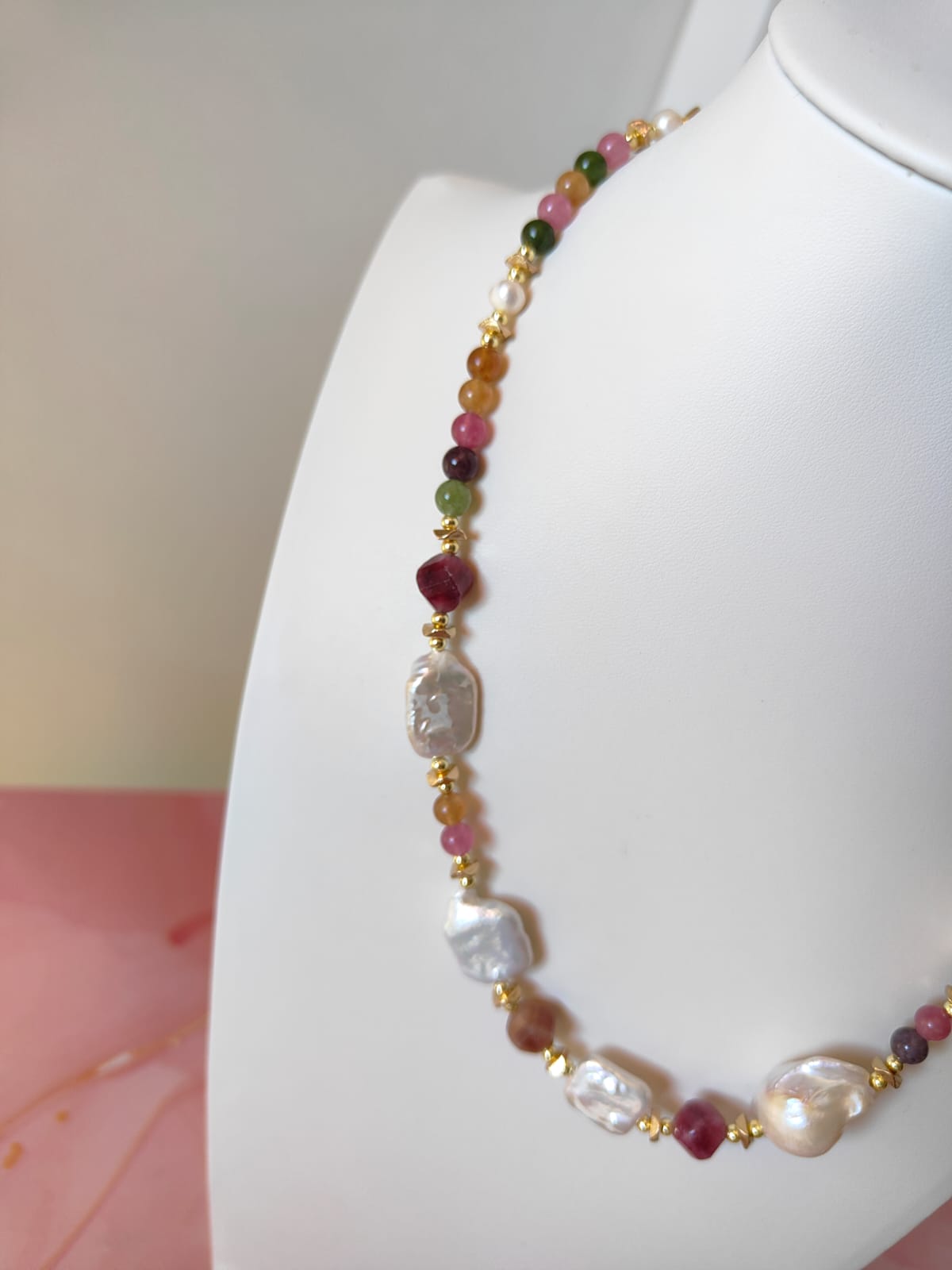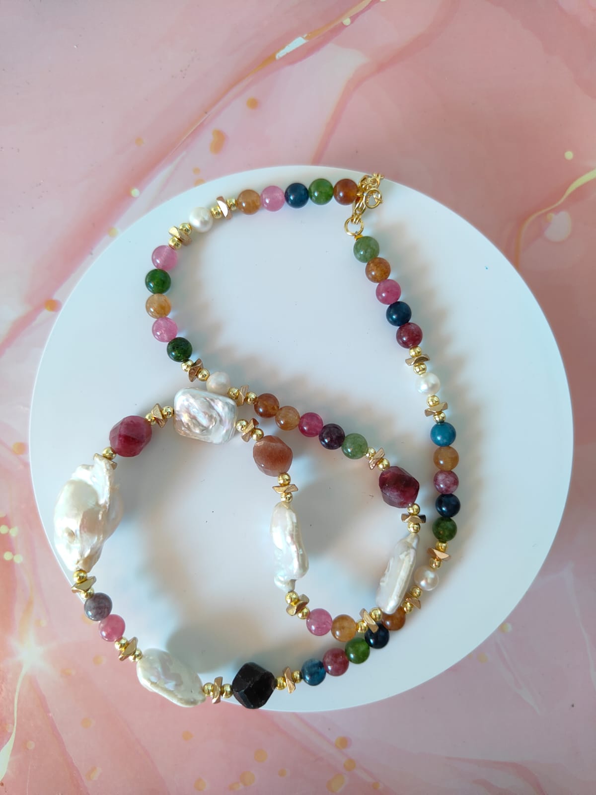Materiali: tormalina naturale multicolor, perle barocche naturali, ematite dorata