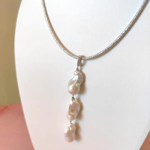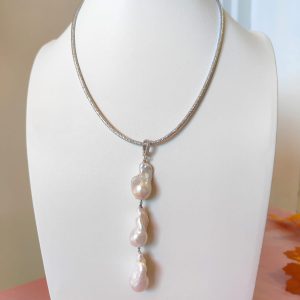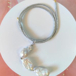 Il pendente centrale è composto da tre perle barocche naturali disposte in verticale, ognuna unica nella forma e nelle iridescenze. Le superfici morbide e organiche riflettono la luce creando bagliori madreperlacei che rendono il gioiello perfetto per occasioni eleganti, outfit serali, abiti minimal o styling bridal contemporanei. L’espressione collana tripla barocca descrive perfettamente l’essenza della creazione: una cascata di tre perle barocche protagoniste, sospese con equilibrio e leggerezza.