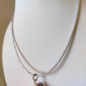 La chiusura magnetica integrata rende il gioiello pratico e confortevole, ideale per chi desidera una collana elegante ma facile da indossare. Il gancio con zirconi aggiunge un tocco di brillantezza che richiama la luce metallica del cordoncino, creando armonia visiva e coerenza stilistica. Il mix tra elementi morbidi e organici (le perle) e materiali moderni e luminosi (il cordoncino argentato) rende questa collana trasversale, adatta sia a look quotidiani chic, sia a eventi raffinati.