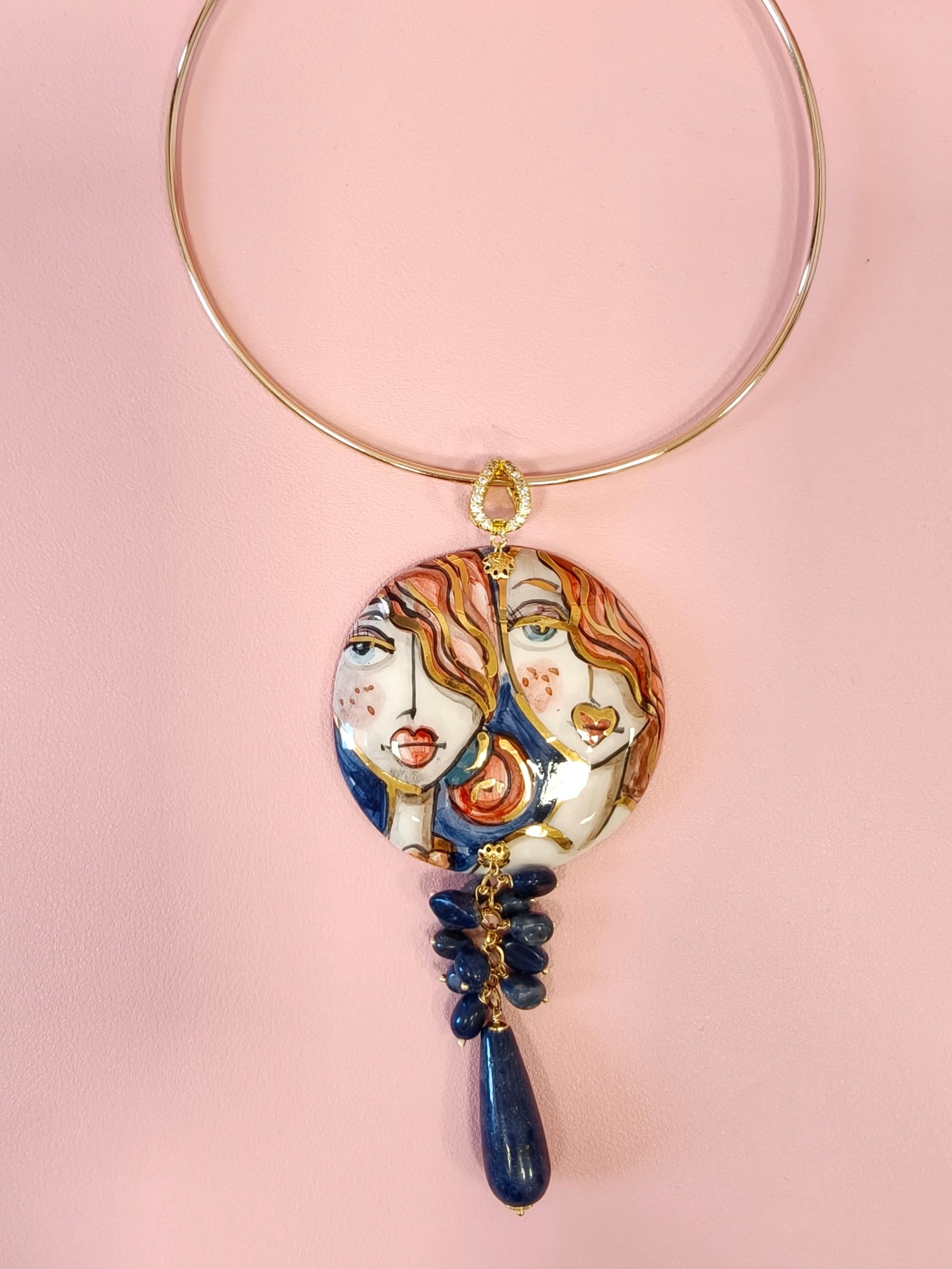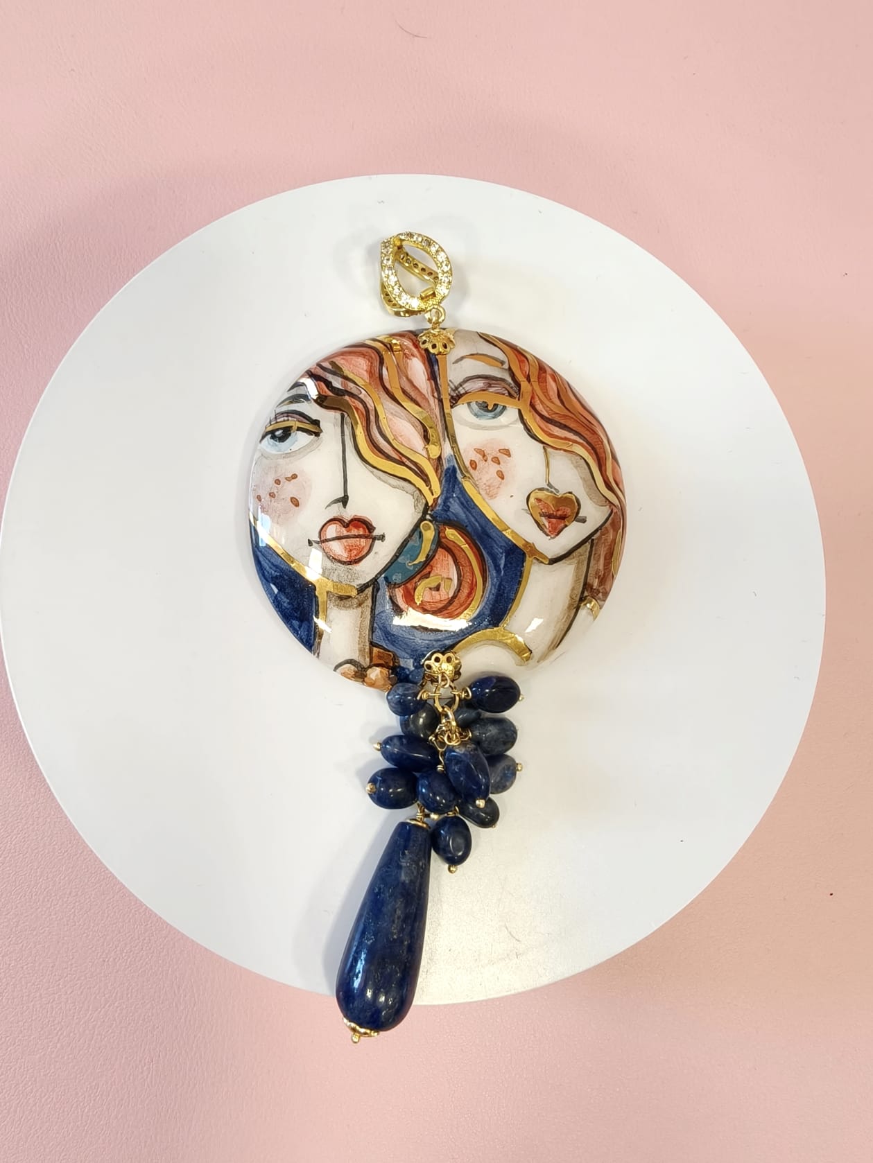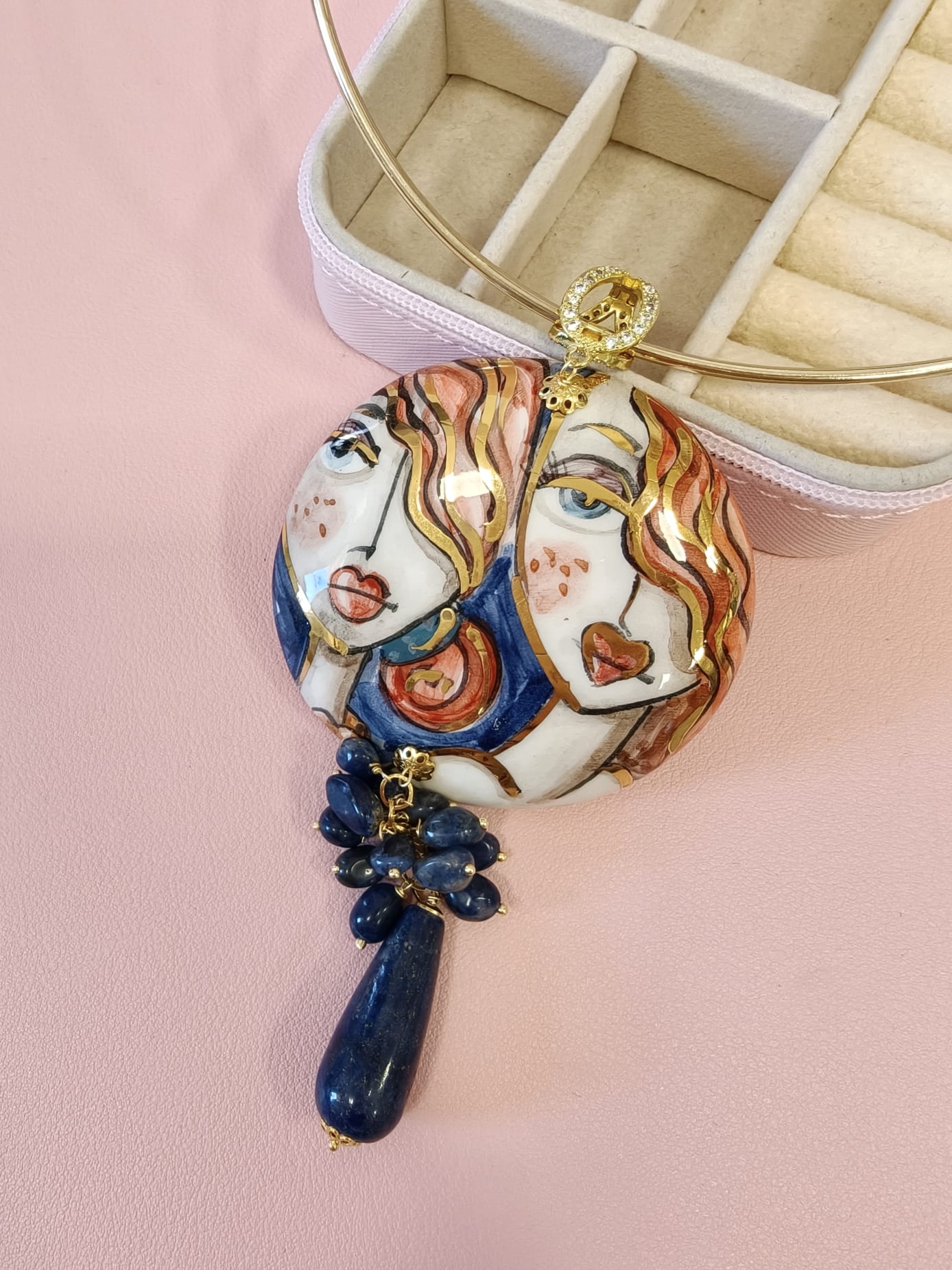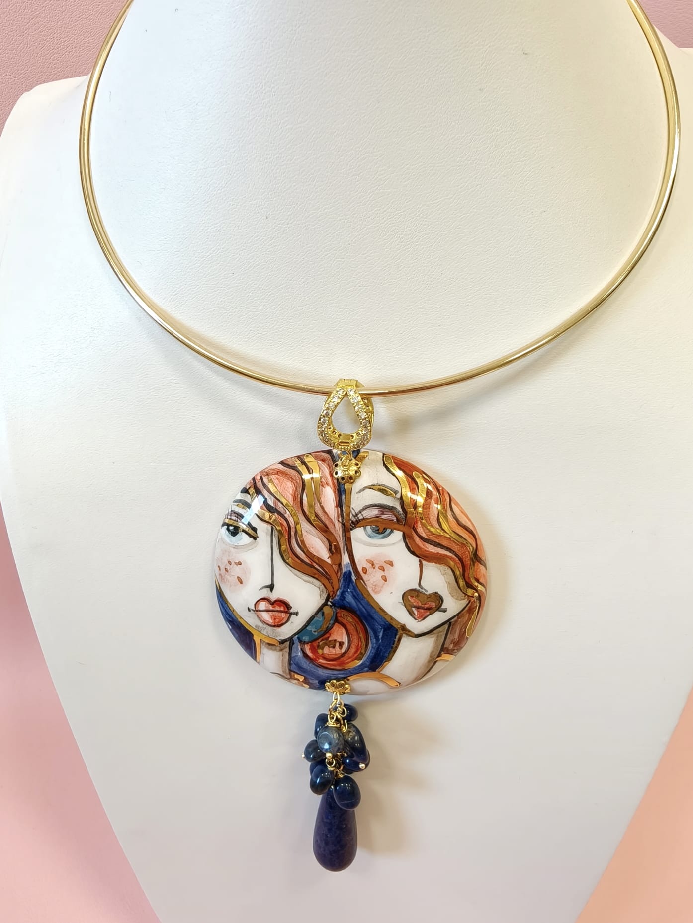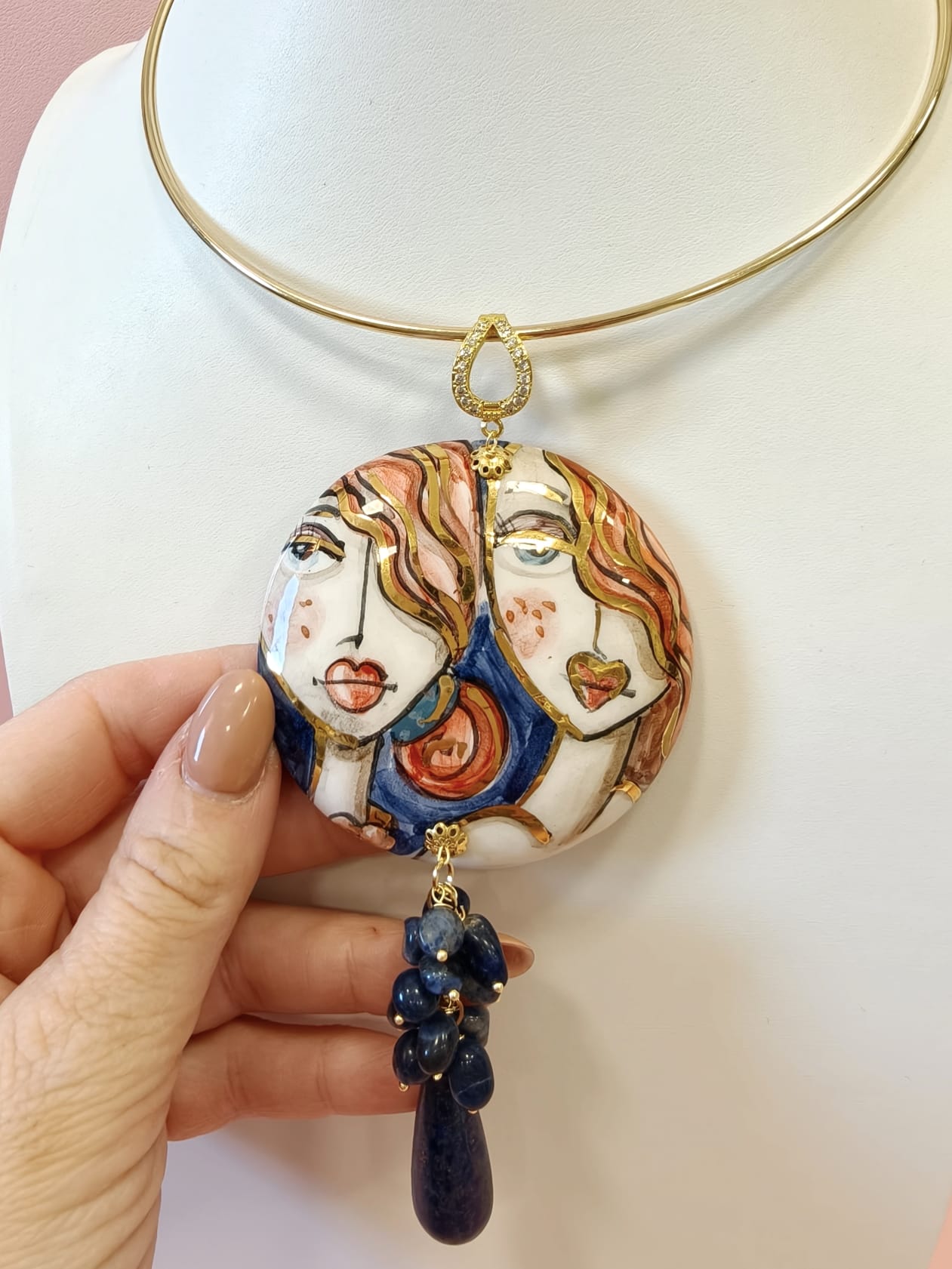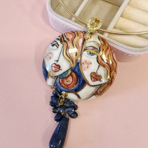 Al centro del gioiello si trova un importante ciondolo in ceramica di Caltagirone dipinta a mano. Il decoro raffigura due volti femminili stilizzati che si incontrano in una composizione armoniosa e suggestiva. Inoltre la pittura manuale rende ogni dettaglio ricco di carattere e di personalità.