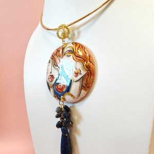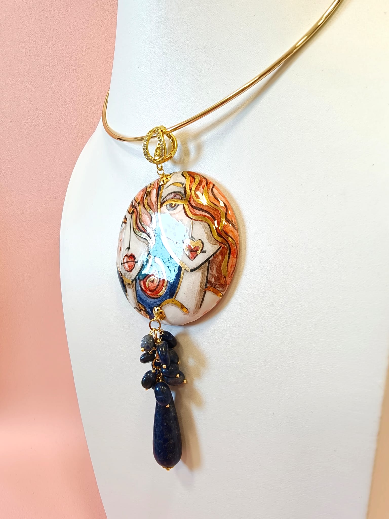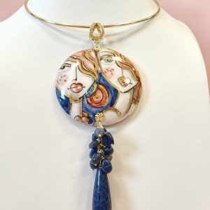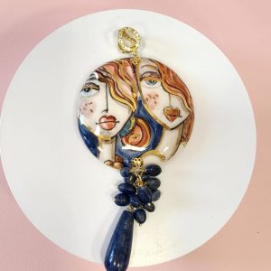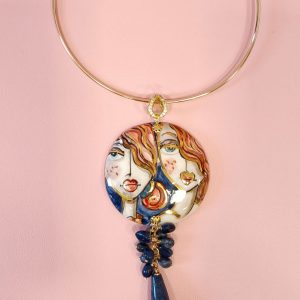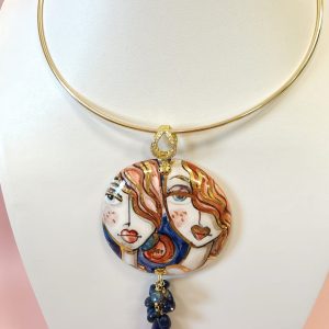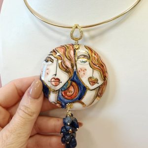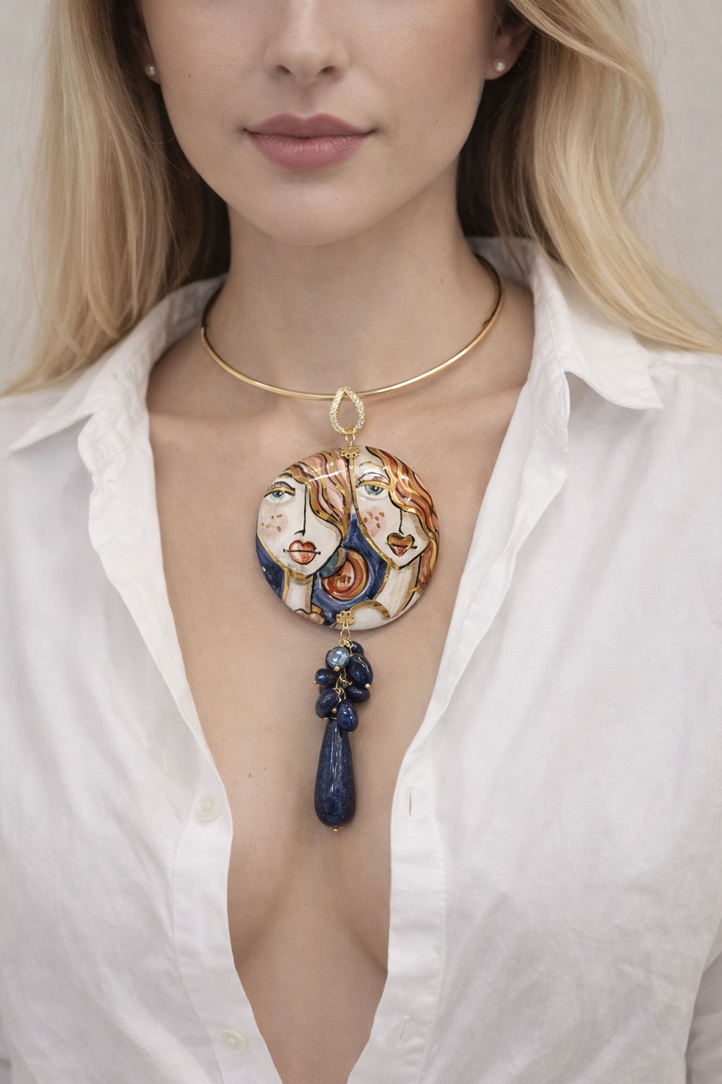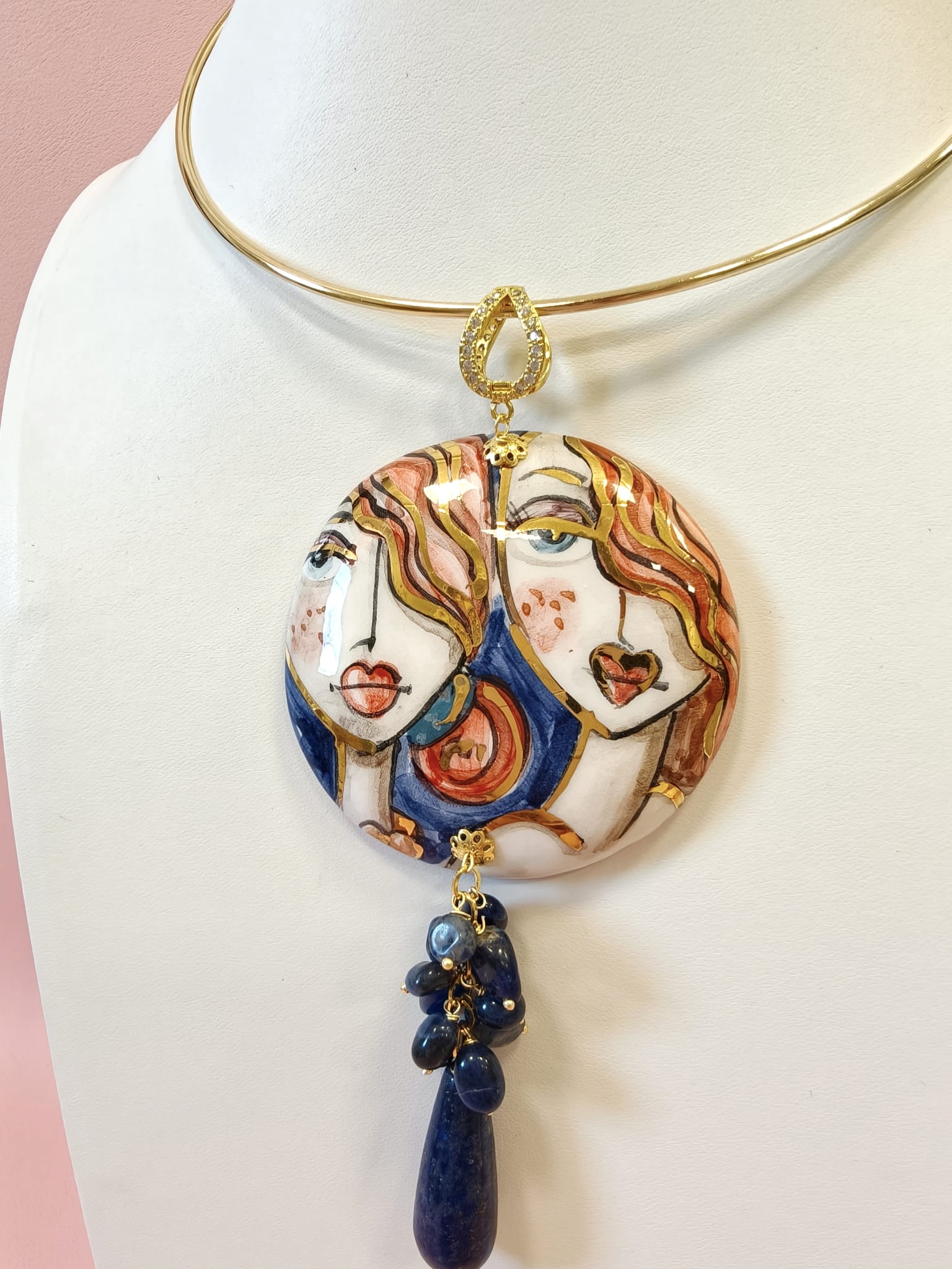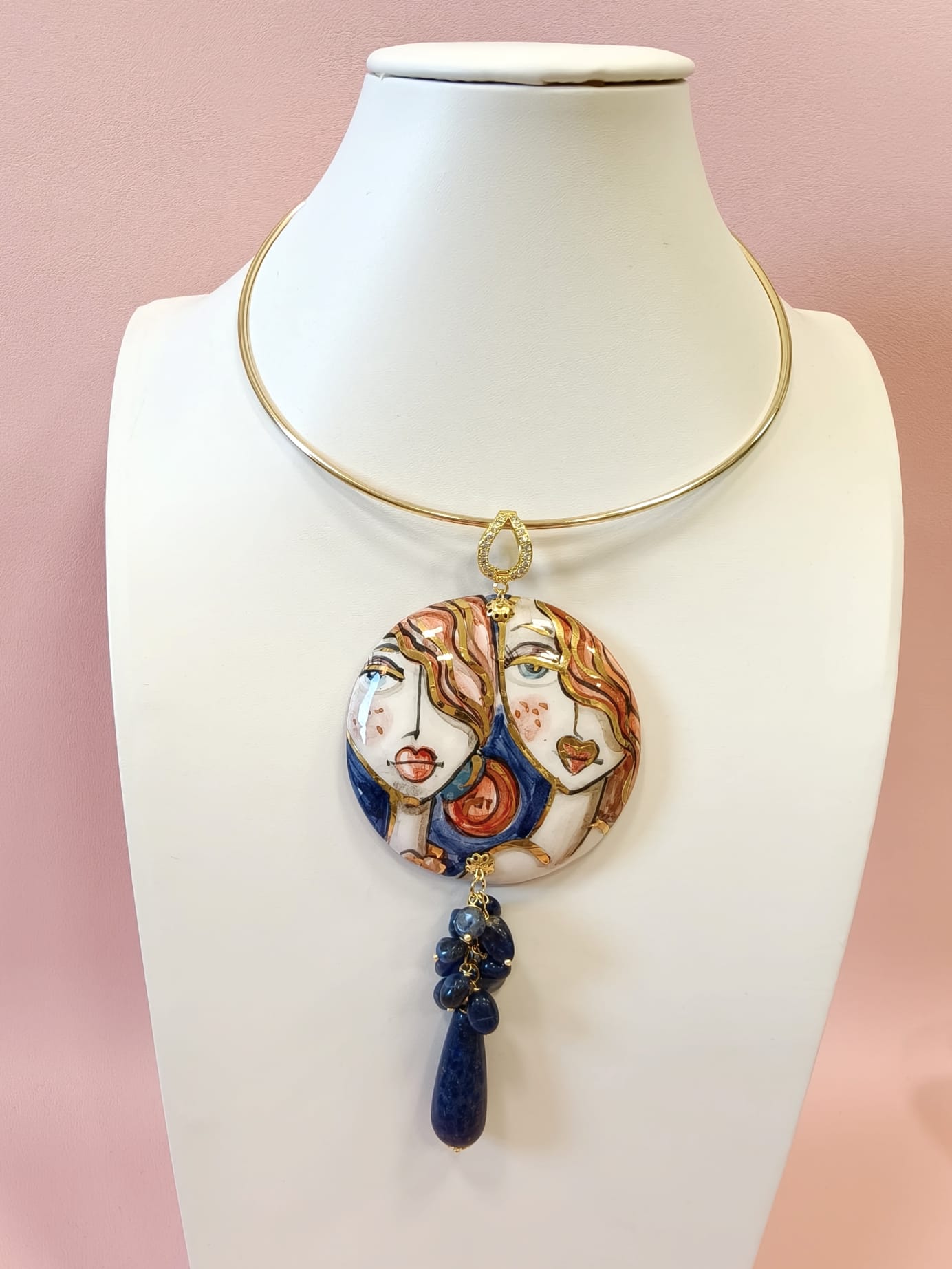 Al centro del gioiello si trova un importante ciondolo in ceramica di Caltagirone dipinta a mano. Il decoro raffigura due volti femminili stilizzati che si incontrano in una composizione armoniosa e suggestiva. Inoltre la pittura manuale rende ogni dettaglio ricco di carattere e di personalità.