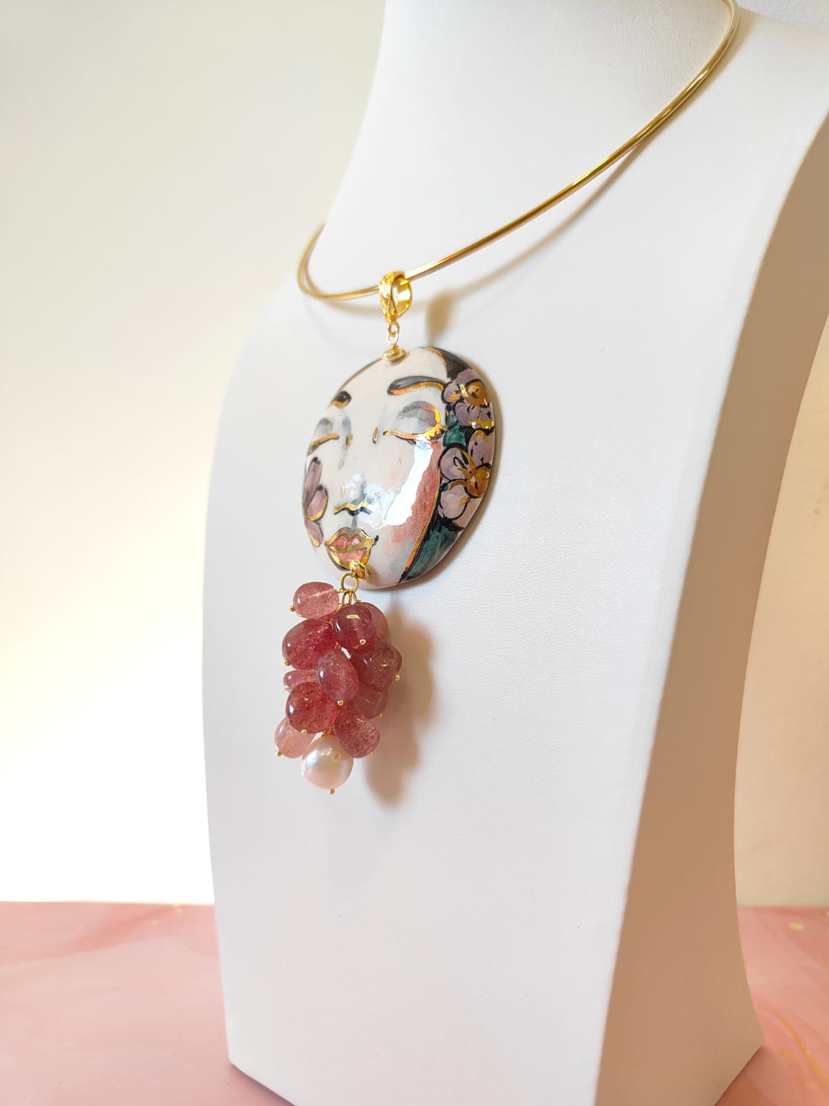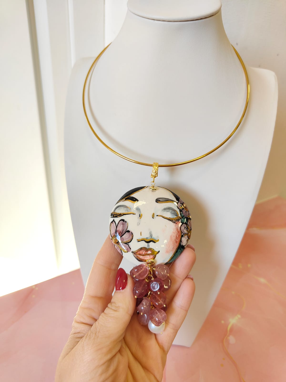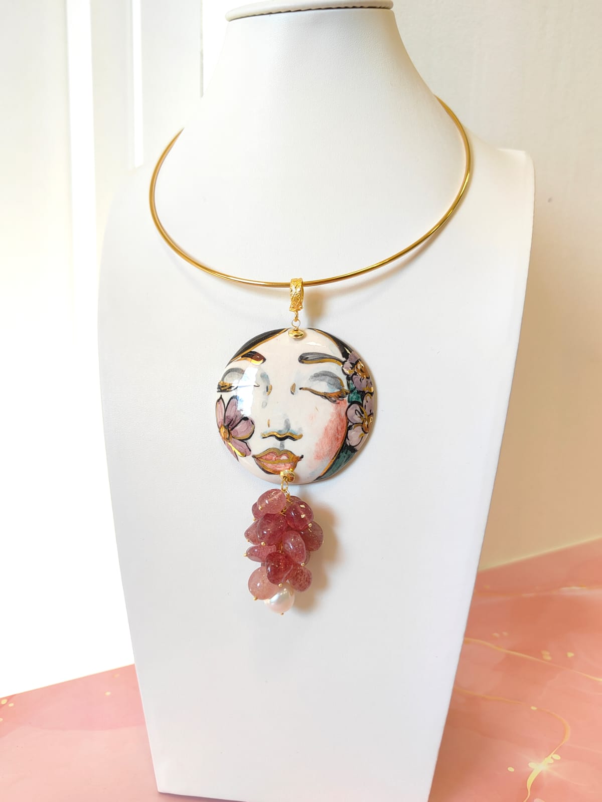 La collana volto e quarzo fragola è una creazione raffinata e artistica, pensata per chi ama indossare un gioiello capace di emozionare al primo sguardo. La struttura rigida in acciaio dorato offre un profilo pulito, moderno ed elegante, mentre il grande ciondolo in ceramica dipinta a mano rappresenta un volto femminile dagli occhi chiusi, avvolto da toni delicati e tocchi luminosi in oro. Ogni linea è tracciata con cura, e il risultato è un piccolo quadro da indossare: poetico, armonioso e ricco di personalità.