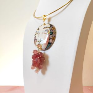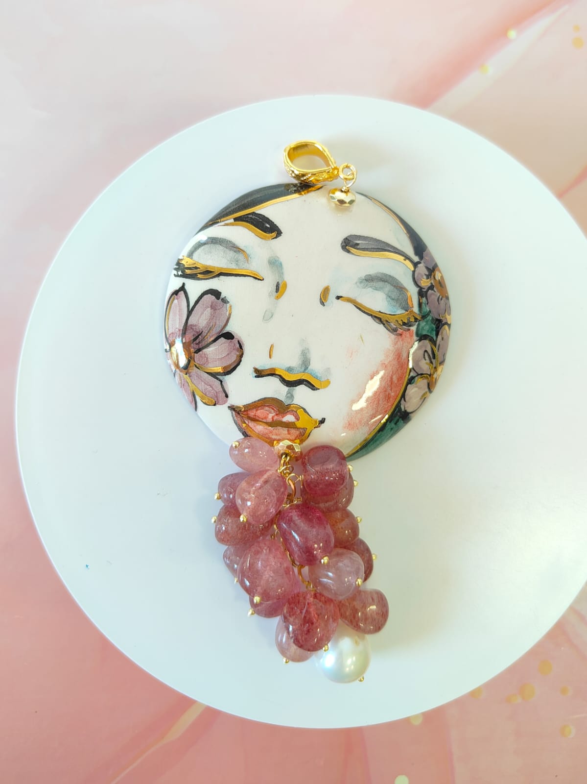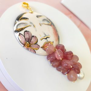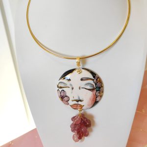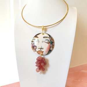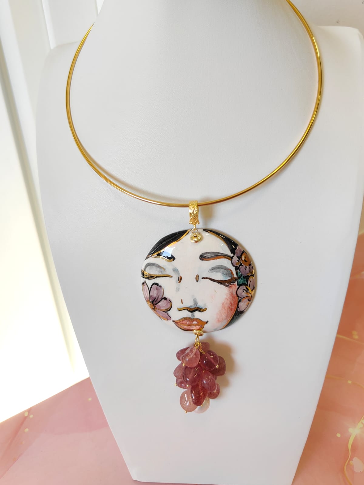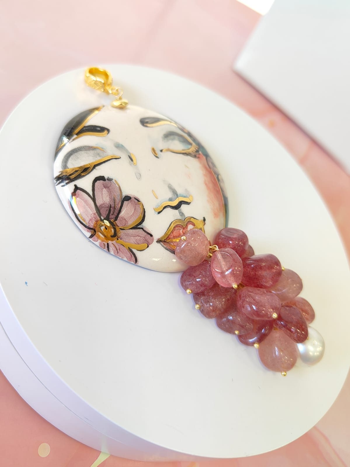 La collana volto e quarzo fragola è una creazione raffinata e artistica, pensata per chi ama indossare un gioiello capace di emozionare al primo sguardo. La struttura rigida in acciaio dorato offre un profilo pulito, moderno ed elegante, mentre il grande ciondolo in ceramica dipinta a mano rappresenta un volto femminile dagli occhi chiusi, avvolto da toni delicati e tocchi luminosi in oro. Ogni linea è tracciata con cura, e il risultato è un piccolo quadro da indossare: poetico, armonioso e ricco di personalità.