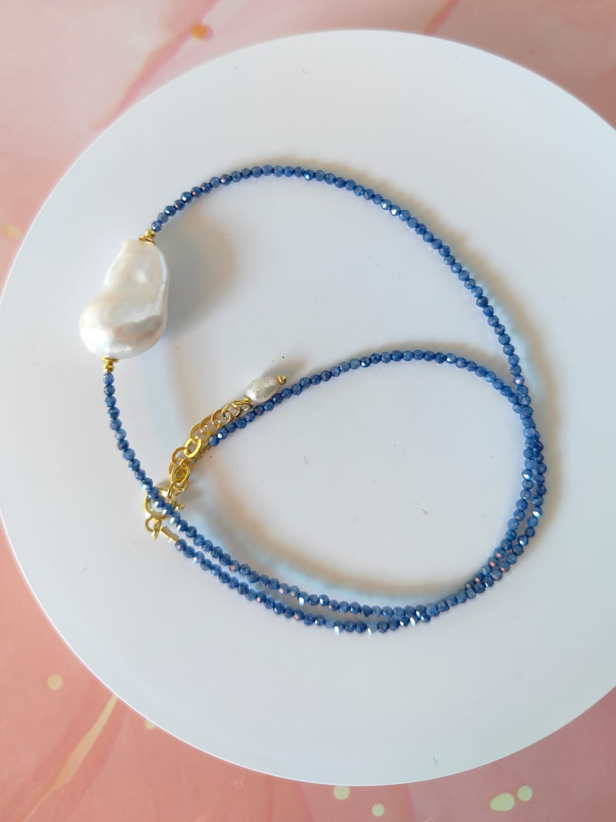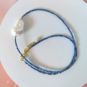 Gli zirconi blu che compongono la collana sono tagliati finemente per riflettere la luce con micro bagliori continui, accostati a piccoli inserti dorati che donano calore e contrasto al tono freddo della pietra. La chiusura è realizzata in argento 925 placcato oro, scelta ideale per garantire resistenza nell’uso quotidiano senza rinunciare a un’estetica preziosa. La Collana Zirconi Blu E Barocca si presta ad abbinamenti sia eleganti che casual: perfetta con una camicia bianca, un dolcevita scuro o un abito da sera, ma anche come layering con altre collane sottili.