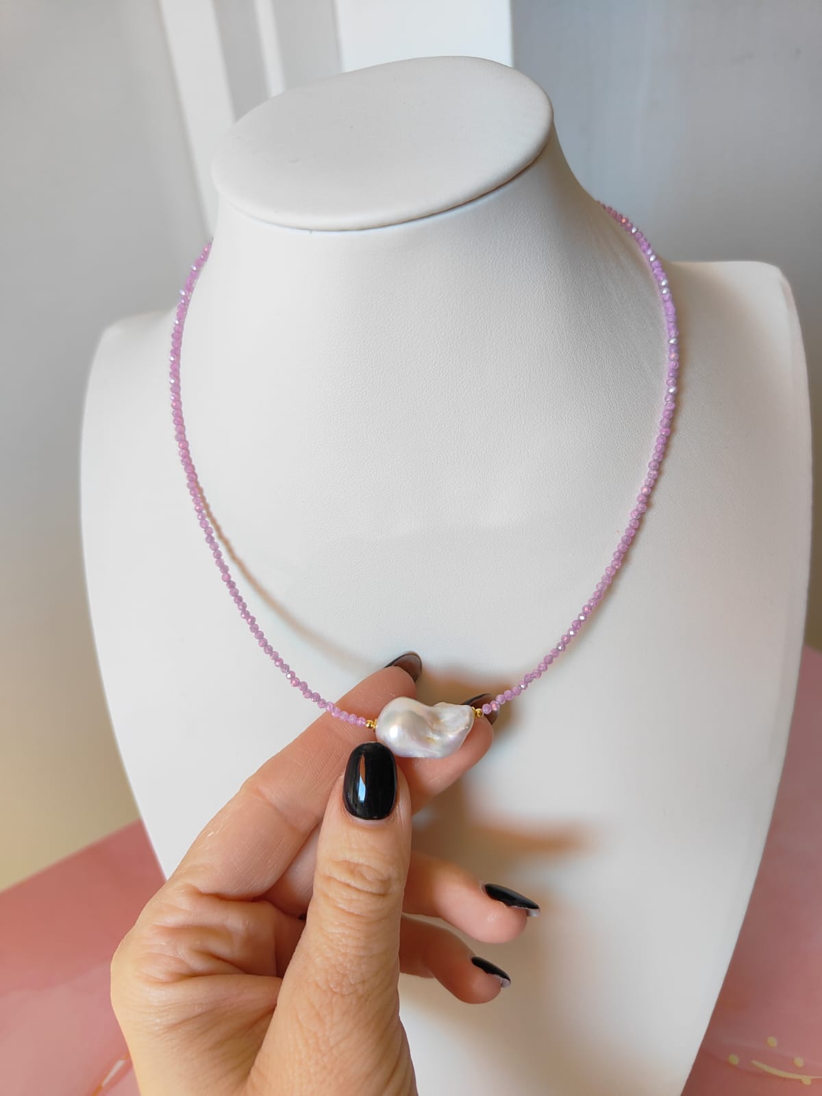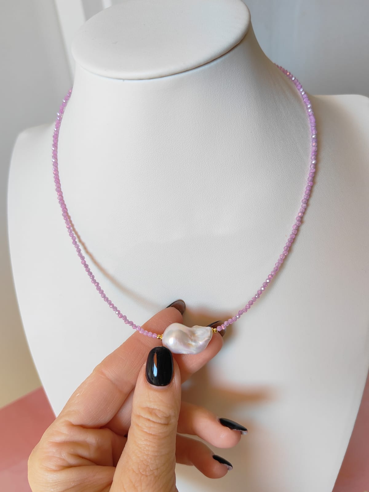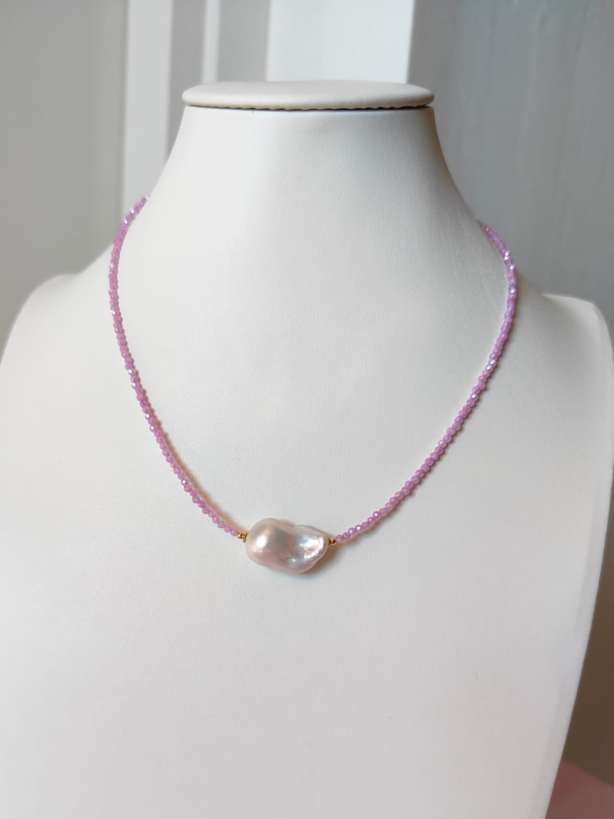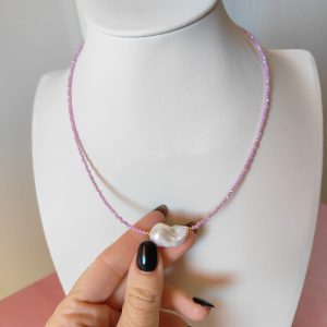 La collana zirconi rosa e barocca nasce con l’intento di unire leggerezza e lusso quotidiano, per abbracciare la bellezza di ogni donna in modo semplice ma ricercato. Si tratta di un girocollo sottile, composto da una serie di zirconi rosa sfaccettati che catturano la luce ad ogni movimento. La tonalità scelta, morbida e luminosa, richiama i fiori primaverili e una femminilità senza tempo.