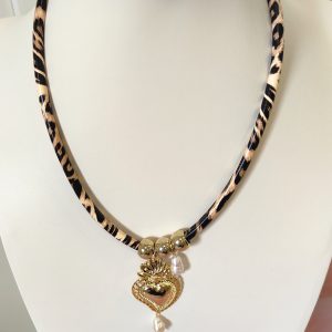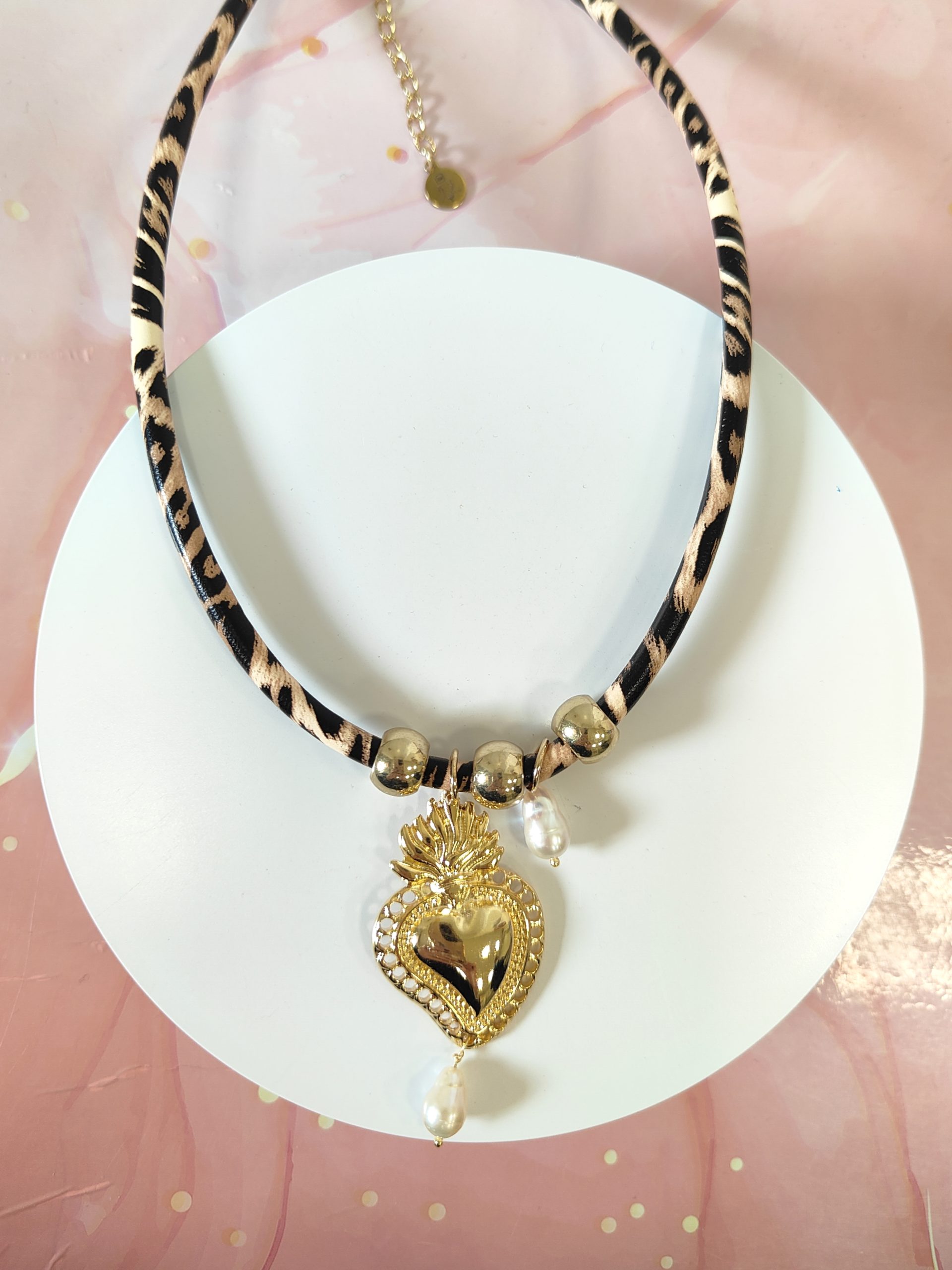 Al centro della composizione spicca un magnifico cuore sacro in ottone dorato, ricco di dettagli e caratterizzato da una lucentezza calda e intensa. La lavorazione preziosa del ciondolo richiama simboli di energia e passione, trasformando il gioiello in un elemento ricercato e dal forte impatto visivo. A impreziosire ulteriormente la creazione, una splendida perla naturale pendente dona equilibrio e delicatezza al design, creando un contrasto affascinante tra l’estetica animalier e la purezza del bianco perlaceo.