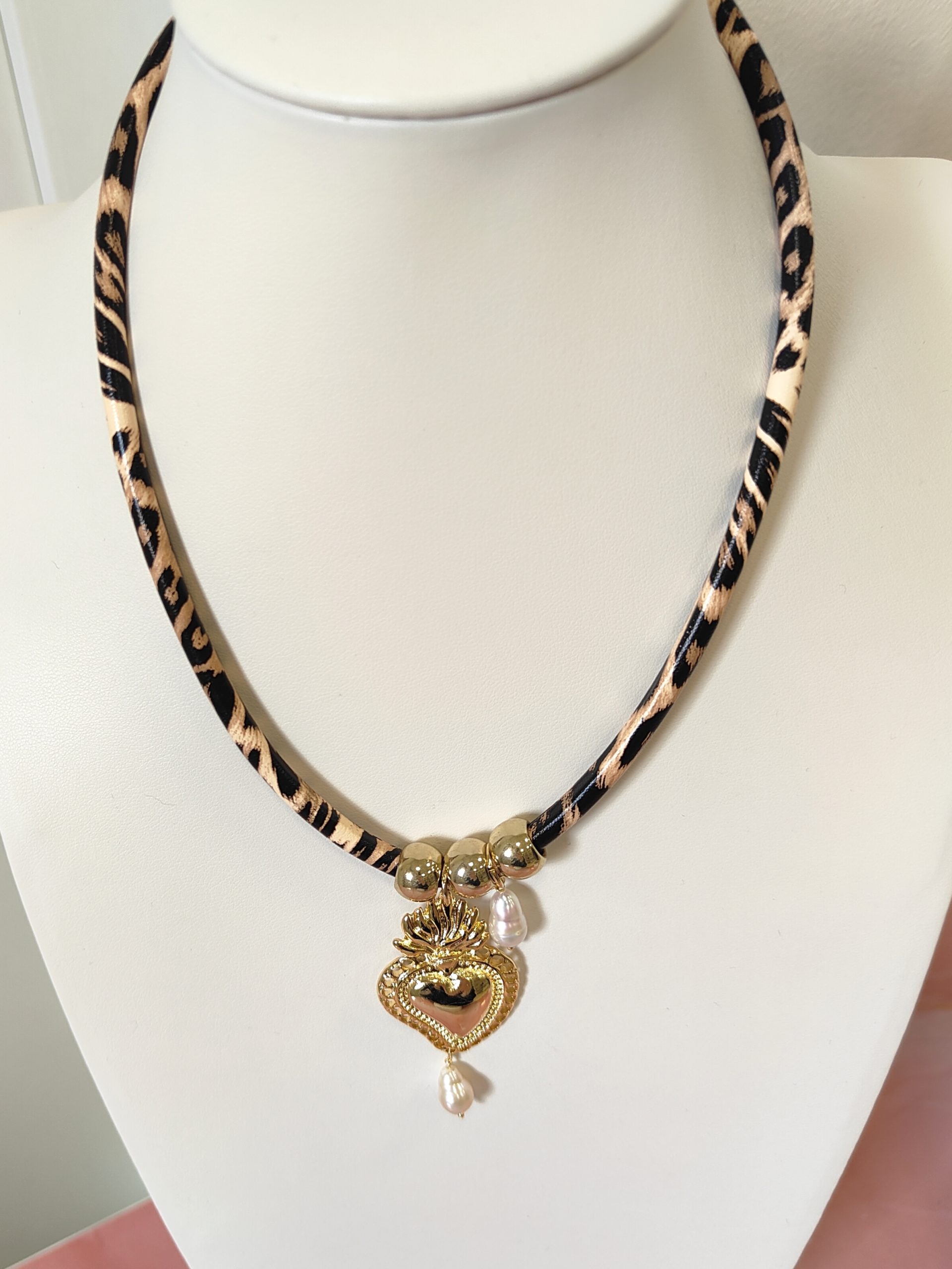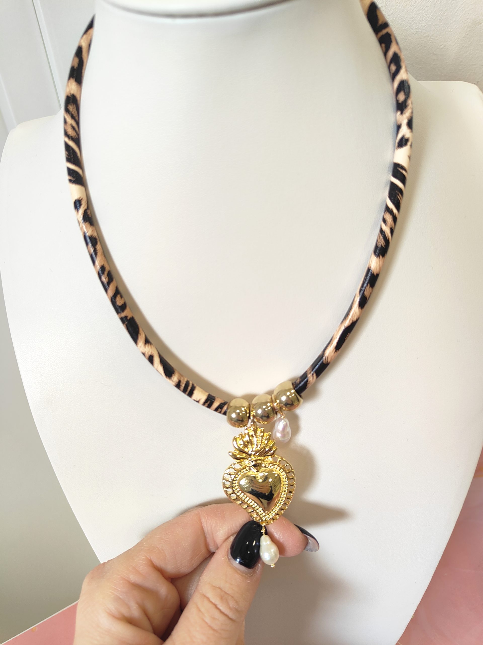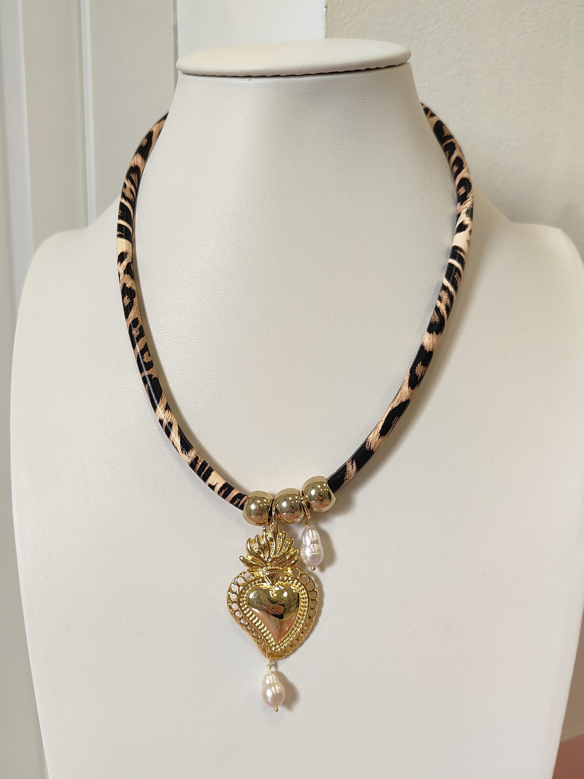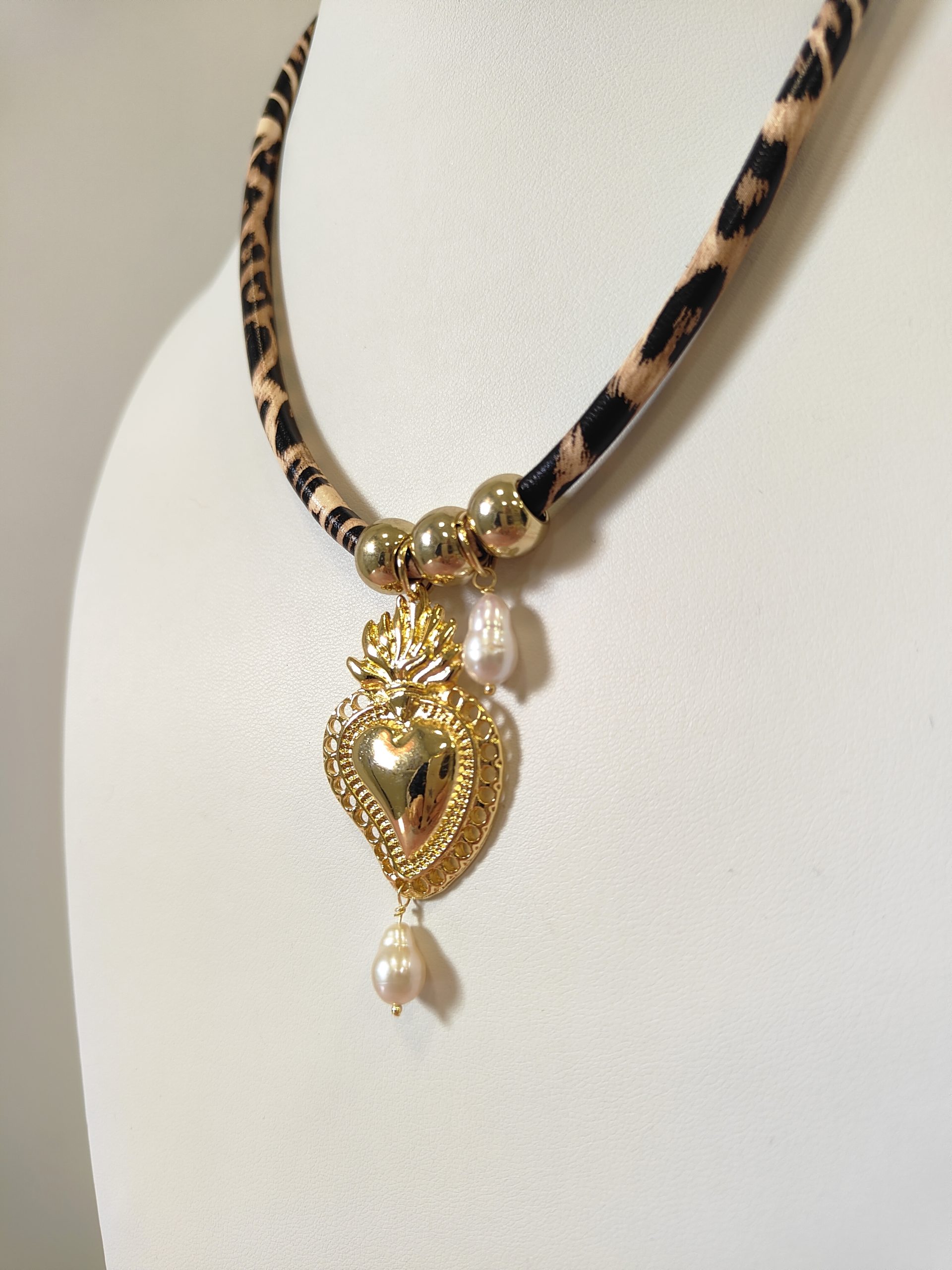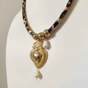 Materiali: similpelle leopardata, cuore in ottone dorato, perle naturali