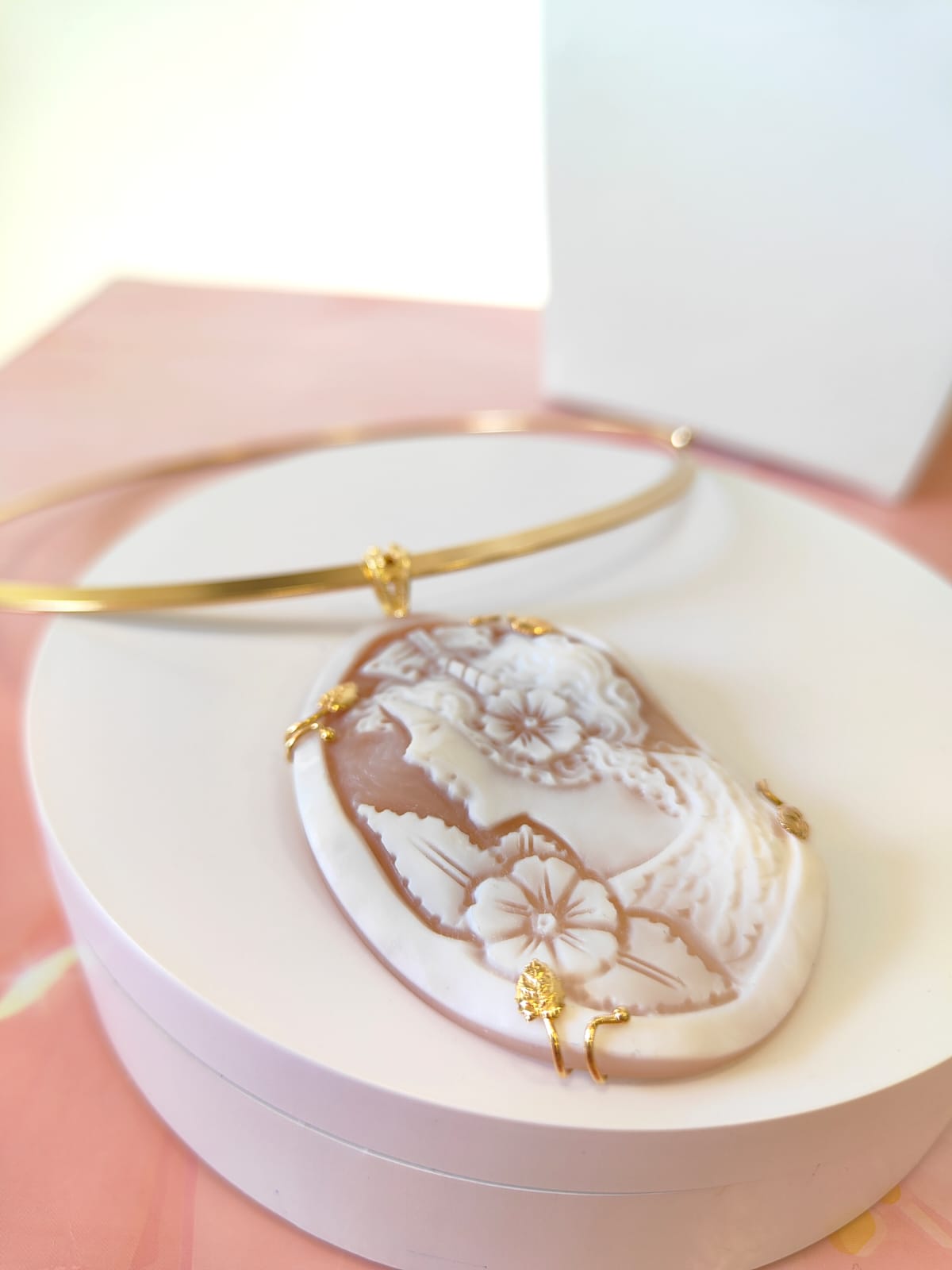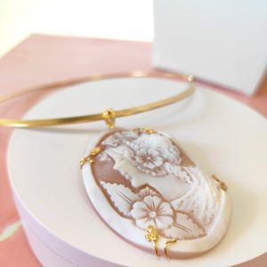Il girocollo cammeo donna è una creazione dal fascino antico e poetico, pensata per chi desidera indossare un gioiello che racconti una storia. La protagonista di questo pezzo unico è una figura femminile elegantemente scolpita su cammeo sardonico, con tratti delicati, fiori finemente incisi e un profilo classico che sembra emergere dalla conchiglia con grazia senza tempo. Ogni dettaglio è eseguito a mano, motivo per cui il cammeo possiede quella raffinata irregolarità tipica dell’artigianato autentico.