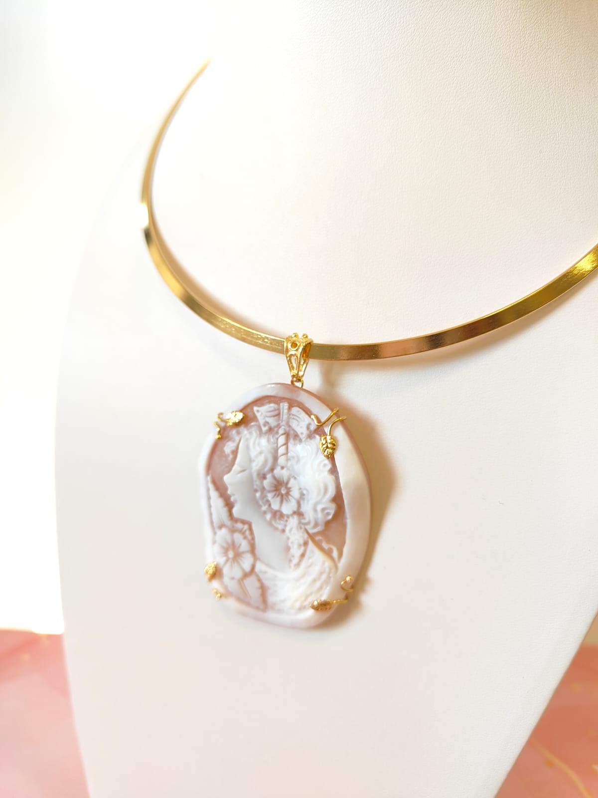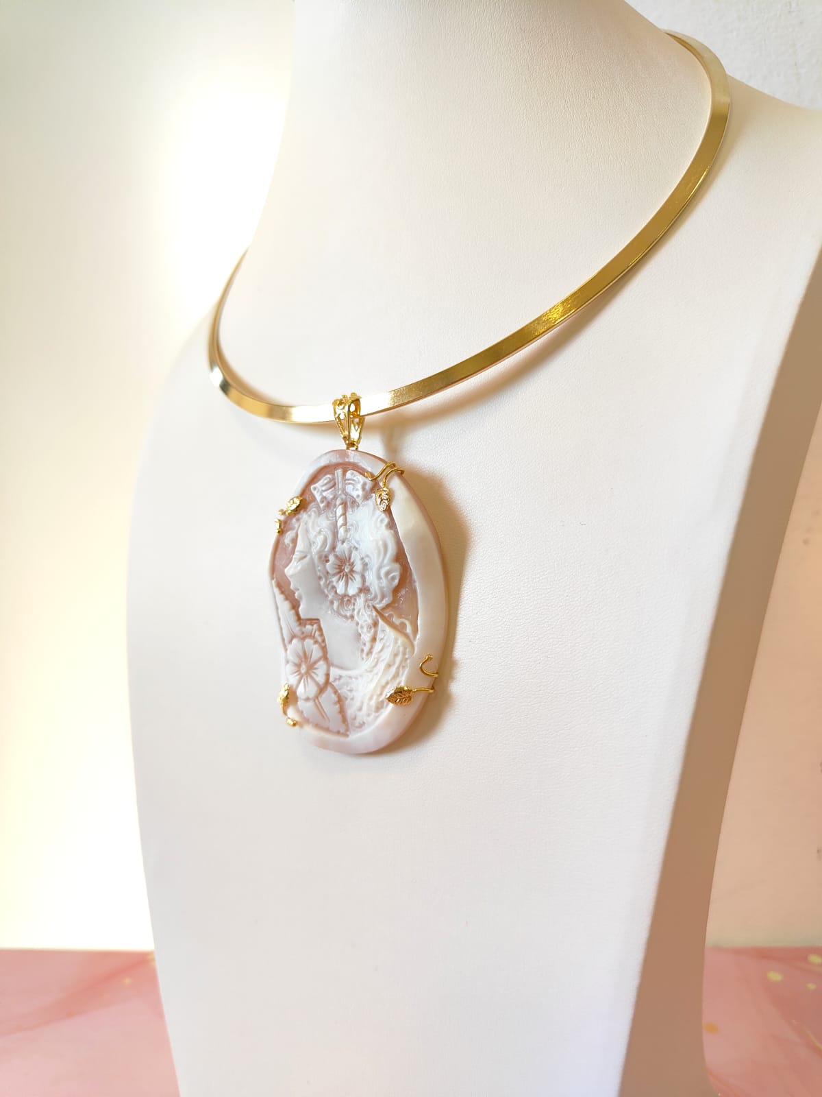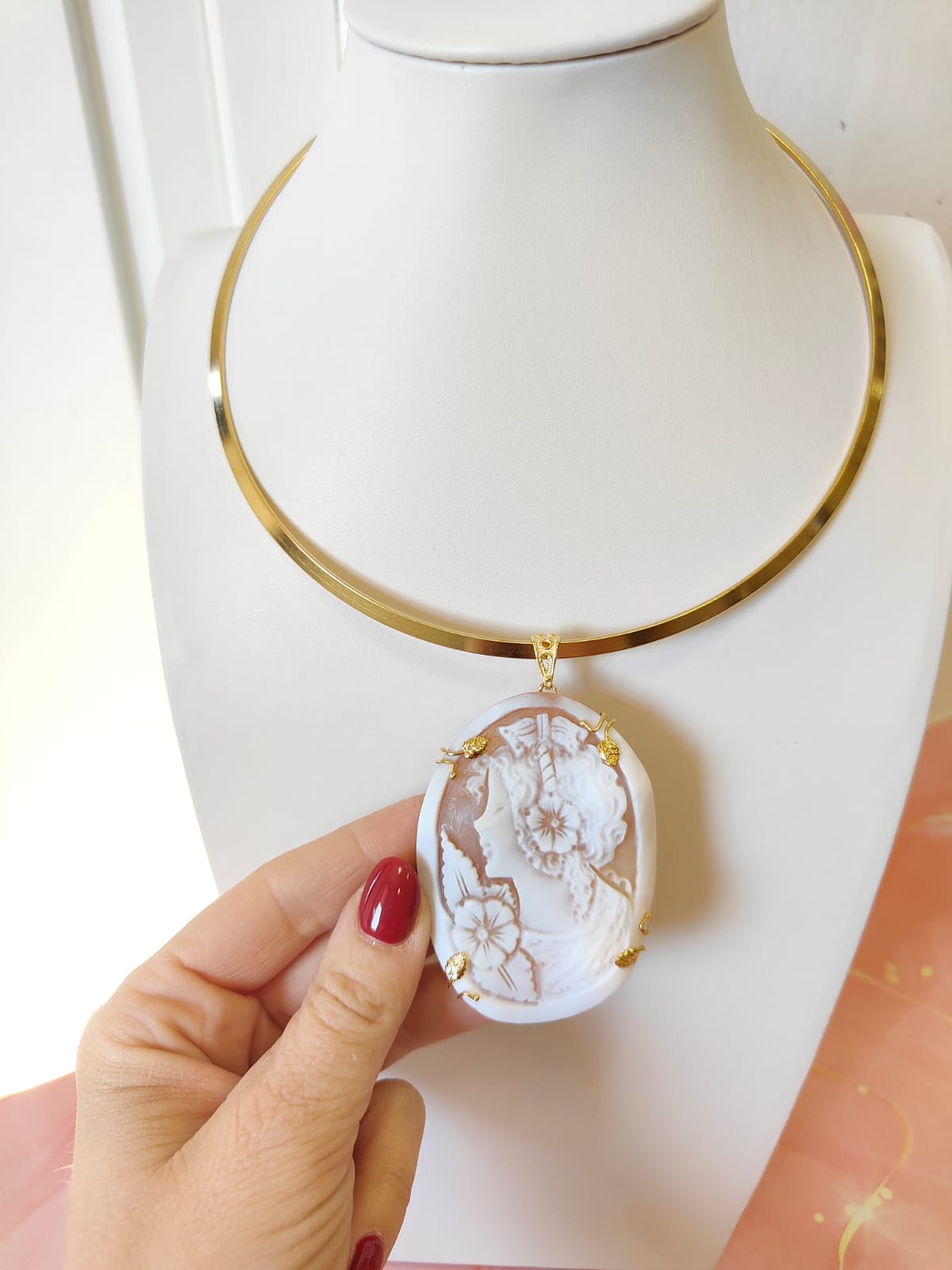 Il ciondolo è incastonato in una montatura in argento 925 placcato oro, arricchita da piccole foglie metalliche che abbracciano la superficie del cammeo creando un delicato intreccio. Il risultato è un equilibrio armonioso tra tradizione e stile contemporaneo. Il girocollo rigido piatto in acciaio dorato aggiunge luminosità e un design moderno che valorizza la verticalità del pendente.