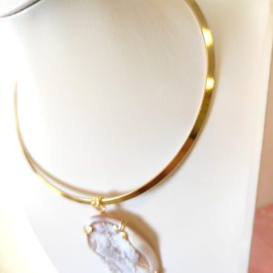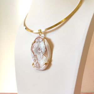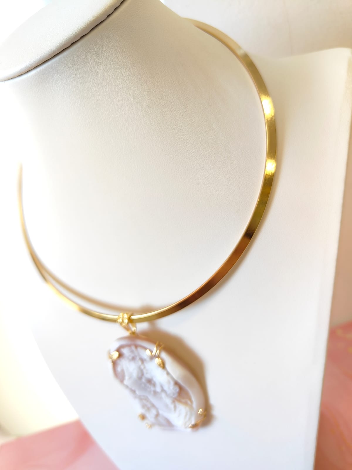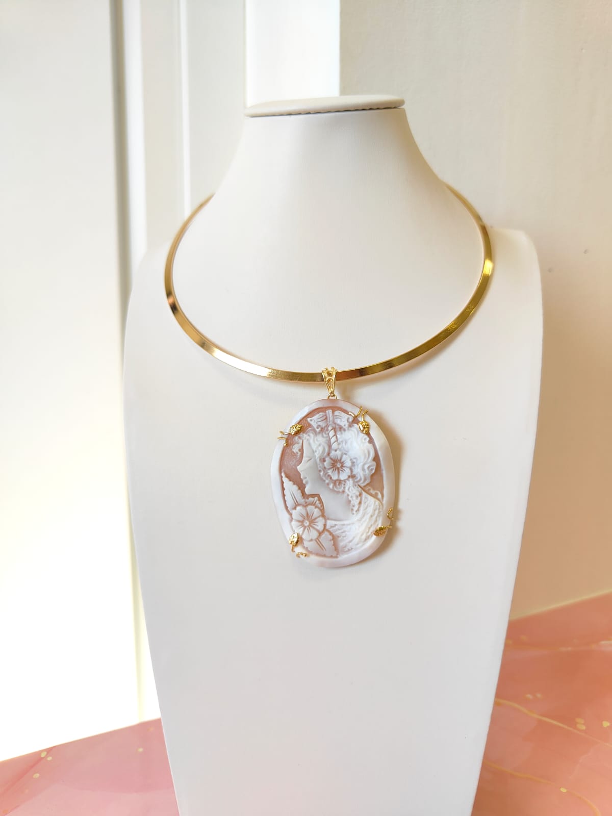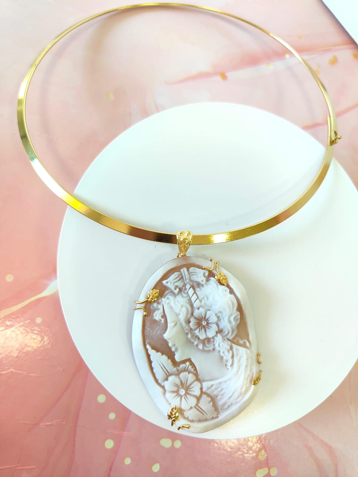 Il ciondolo è incastonato in una montatura in argento 925 placcato oro, arricchita da piccole foglie metalliche che abbracciano la superficie del cammeo creando un delicato intreccio. Il risultato è un equilibrio armonioso tra tradizione e stile contemporaneo. Il girocollo rigido piatto in acciaio dorato aggiunge luminosità e un design moderno che valorizza la verticalità del pendente.