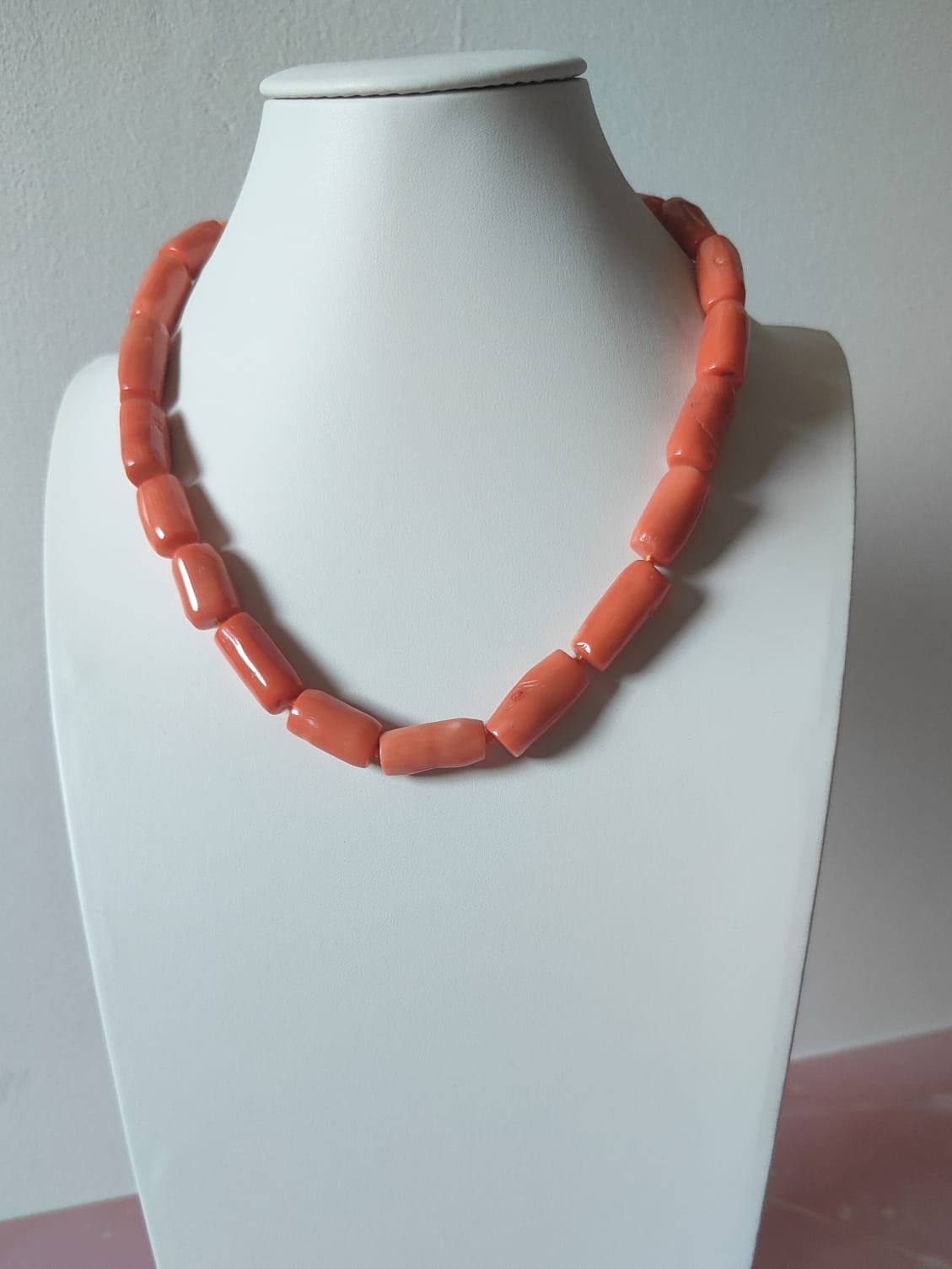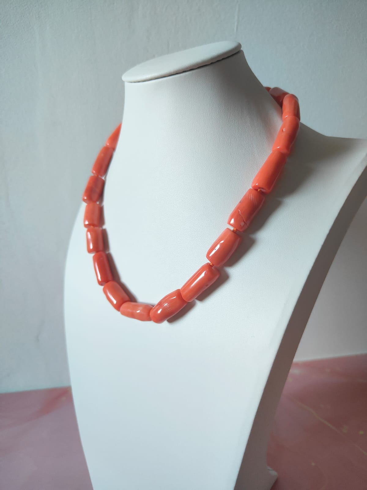 La chiusura a timone in acciaio completa la collana con un tocco di modernità e praticità, garantendo sicurezza e comodità nell’indosso. La sua struttura solida e raffinata si armonizza con la materia naturale del corallo, creando un contrasto di grande effetto tra tradizione e contemporaneità.