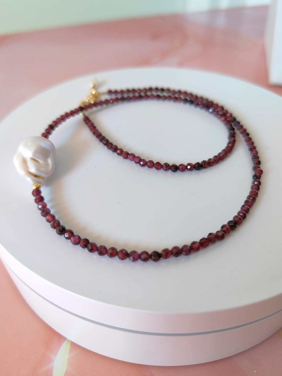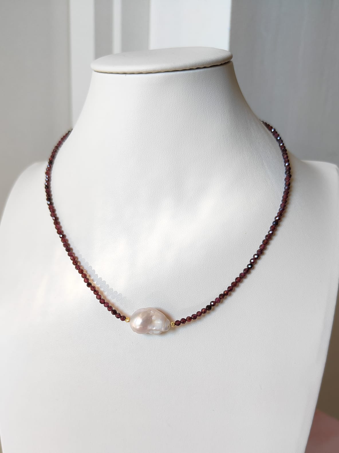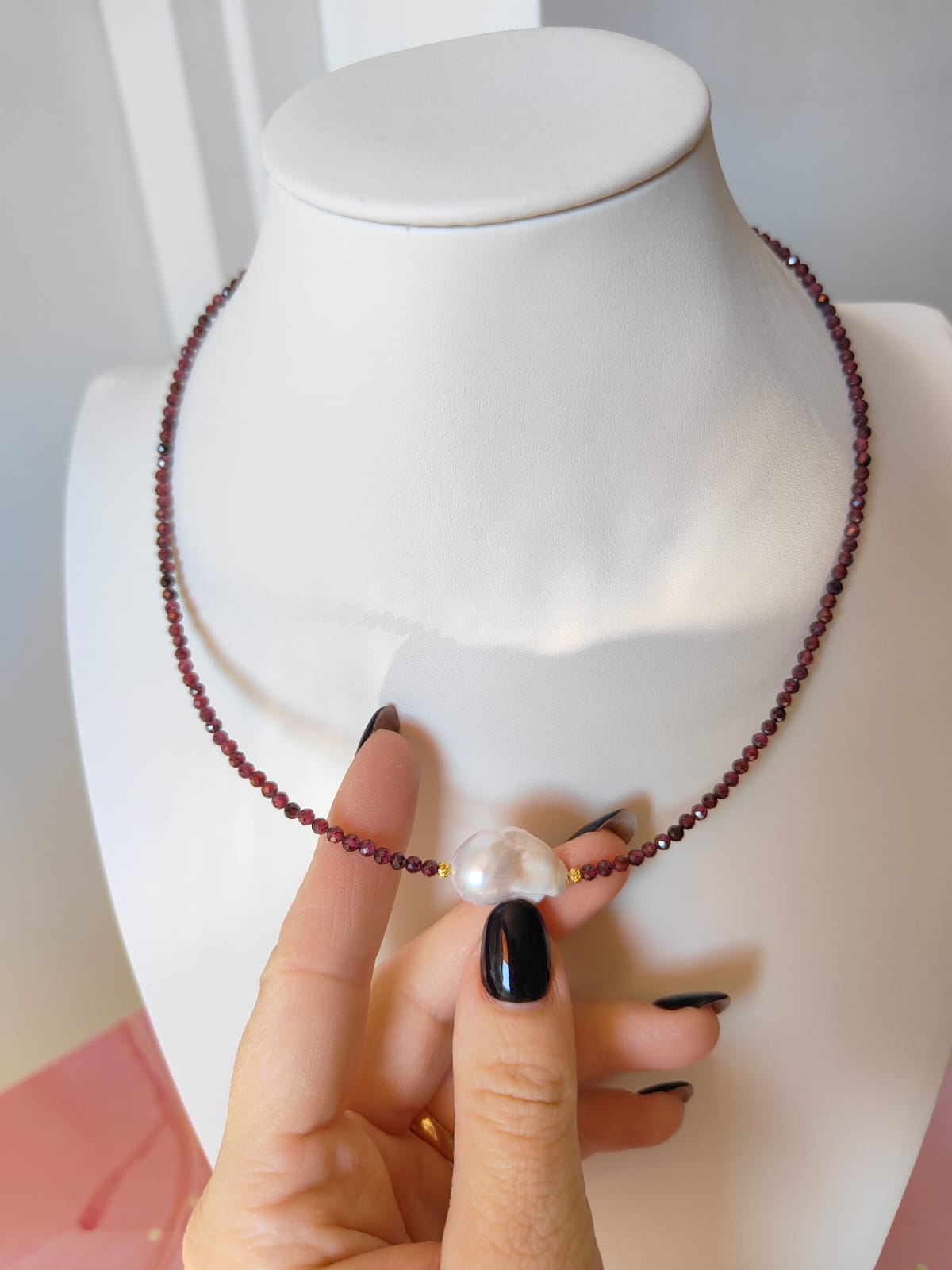 Il granatino presenta sfaccettature minute che catturano la luce in modo discreto, creando una brillantezza elegante senza risultare eccessiva. La perla barocca centrale è scelta per la sua forma unica e per il suo lustro morbido, rendendo ogni collana leggermente diversa dalle altre. Inoltre, piccoli inserti dorati aggiungono un dettaglio luminoso che valorizza i toni profondi delle gemme.