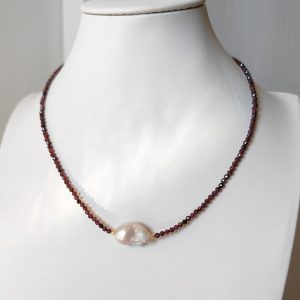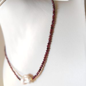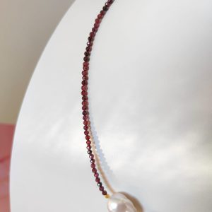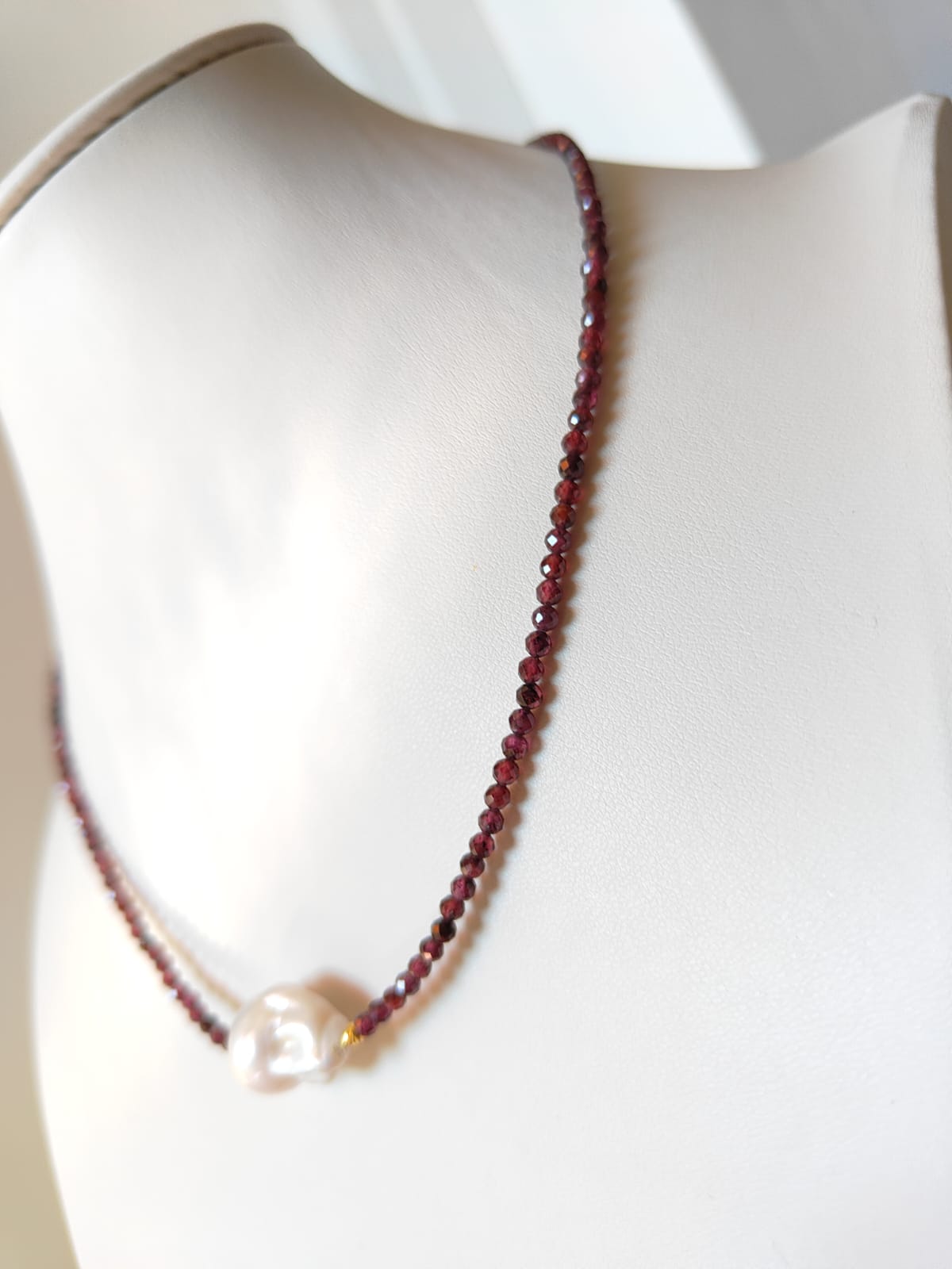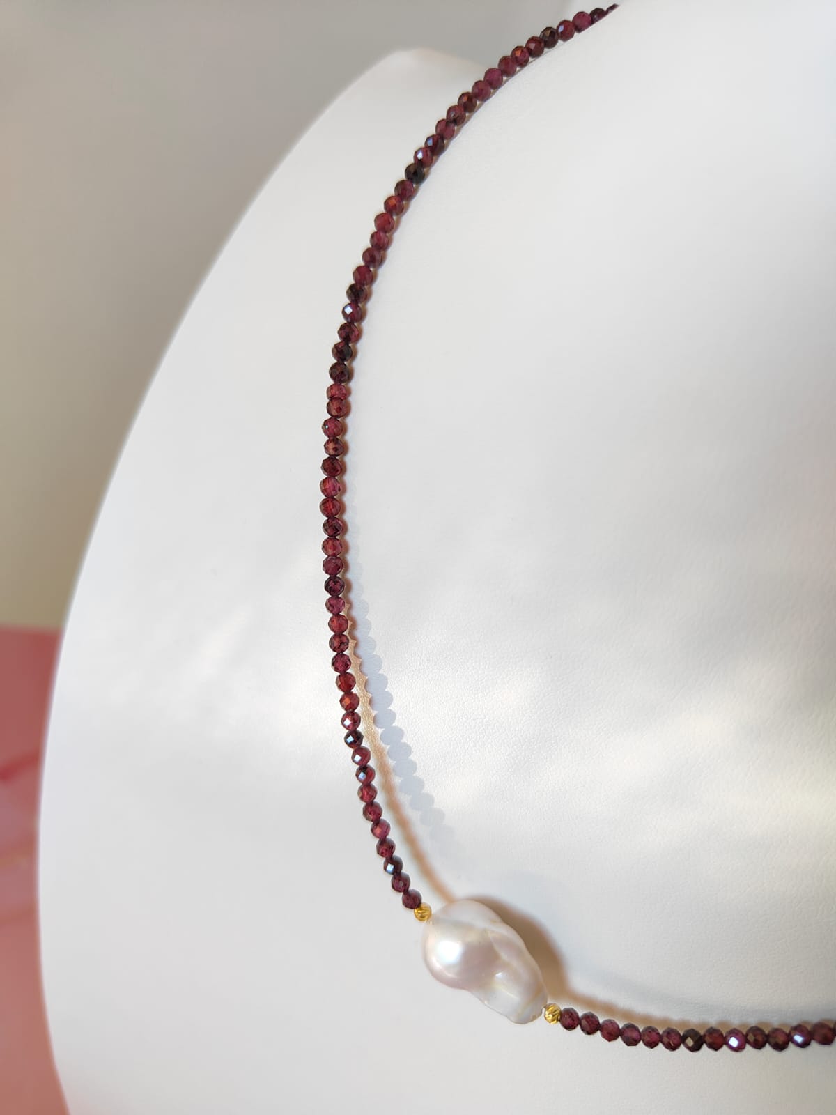Il granatino presenta sfaccettature minute che catturano la luce in modo discreto, creando una brillantezza elegante senza risultare eccessiva. La perla barocca centrale è scelta per la sua forma unica e per il suo lustro morbido, rendendo ogni collana leggermente diversa dalle altre. Inoltre, piccoli inserti dorati aggiungono un dettaglio luminoso che valorizza i toni profondi delle gemme.