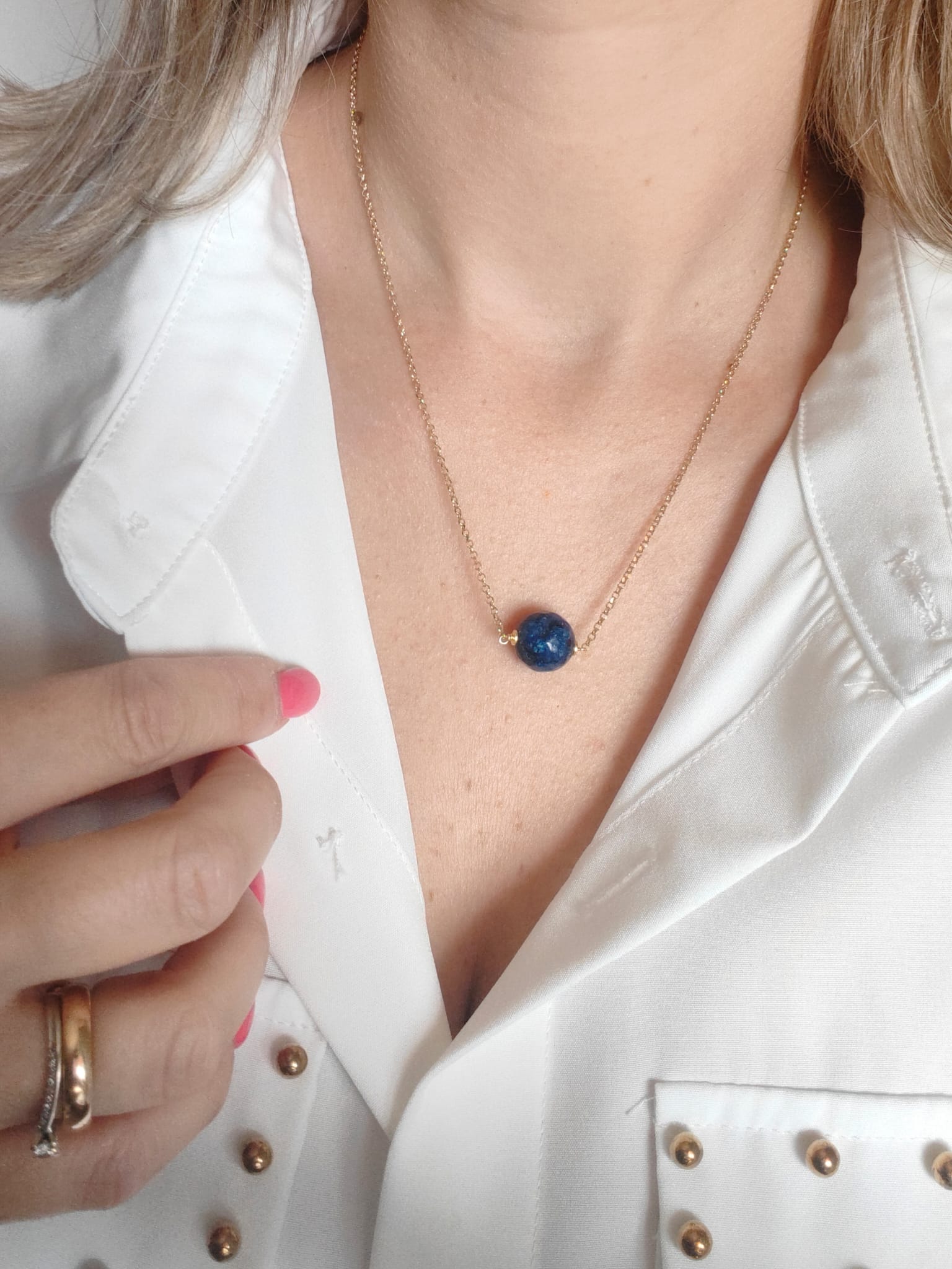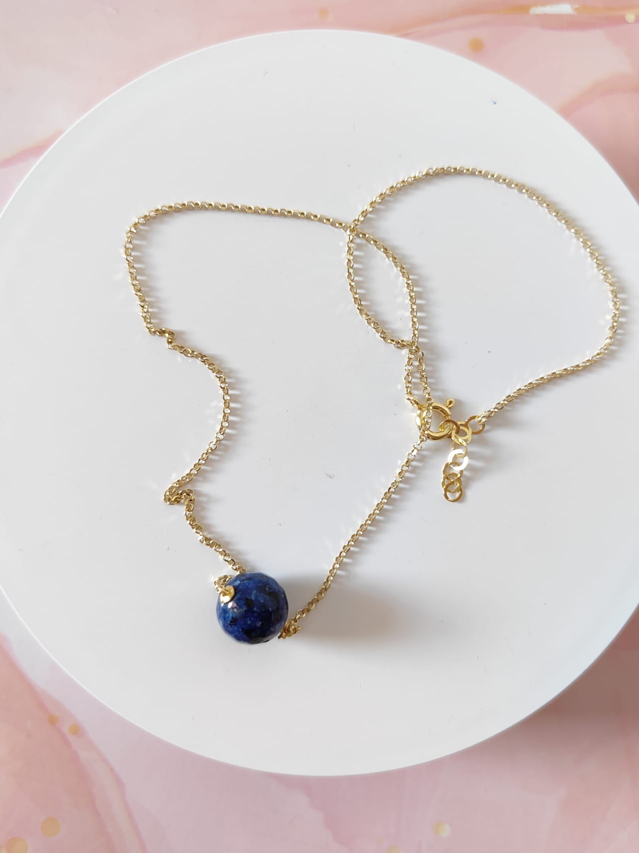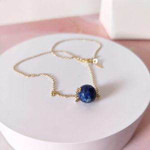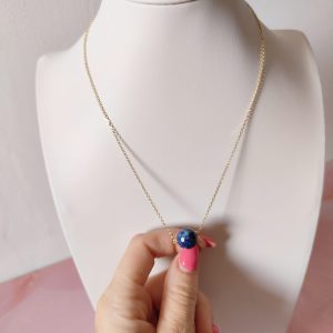 Girocollo lapislazzuli – un gioiello che racchiude il fascino delle pietre naturali e l’eleganza dell’argento 925 placcato oro. Questa collana artigianale presenta una catena rolò diamantata, luminosa e raffinata, che riflette la luce ad ogni movimento. Al centro, protagonista assoluta, una sfera di lapislazzuli naturale, una pietra preziosa dalle sfumature blu intenso con delicate inclusioni dorate che ricordano il cielo stellato.