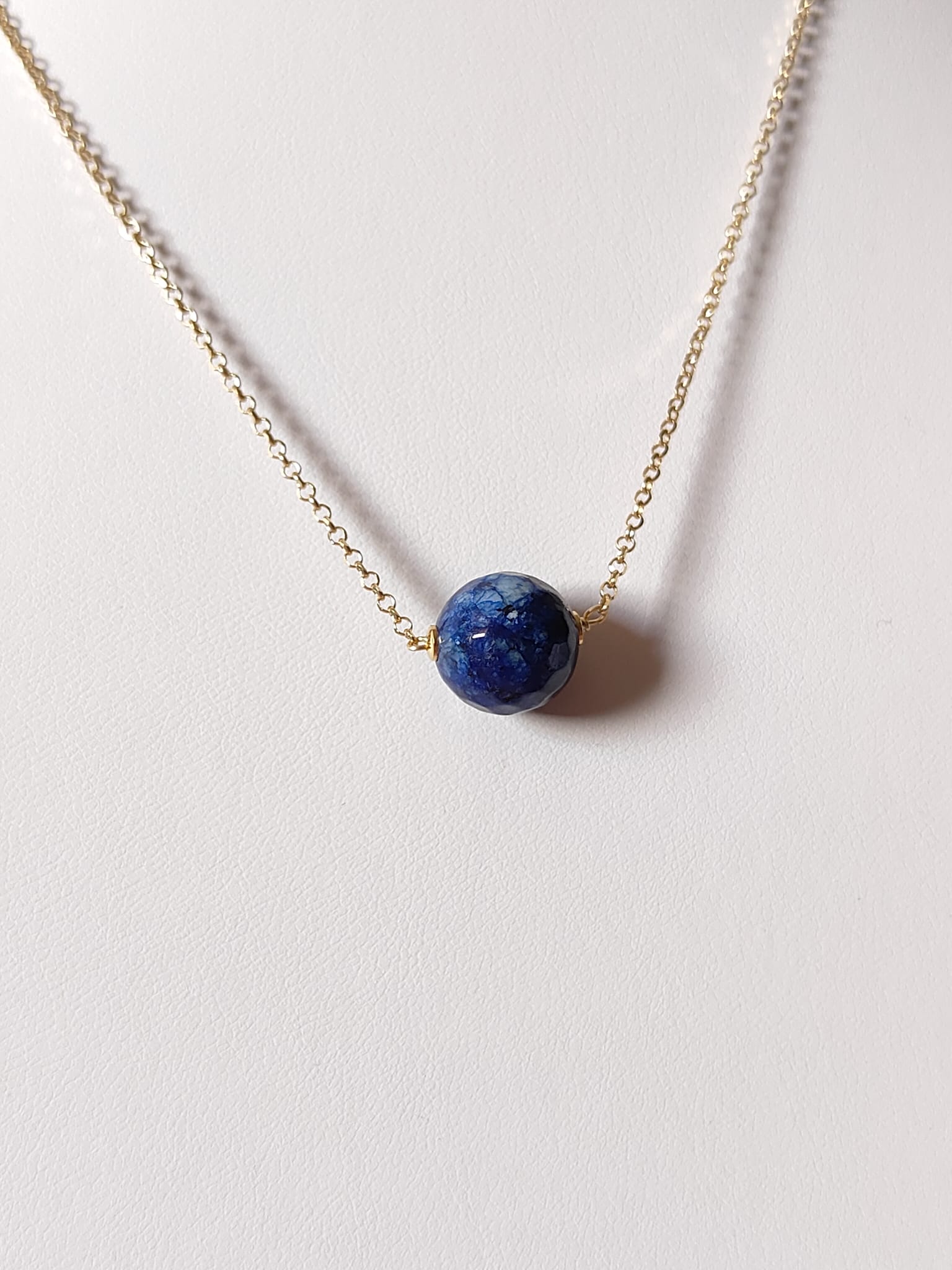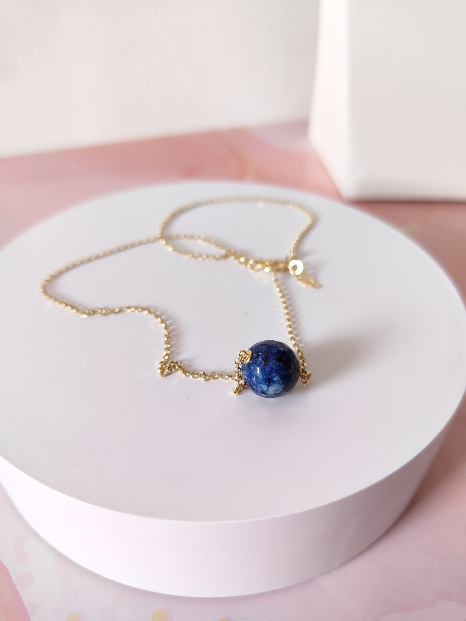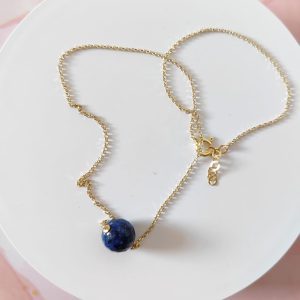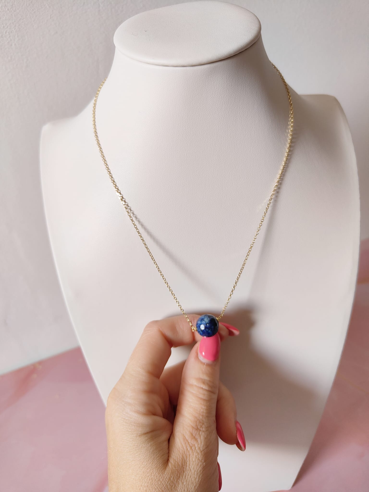 Girocollo lapislazzuli – un gioiello che racchiude il fascino delle pietre naturali e l’eleganza dell’argento 925 placcato oro. Questa collana artigianale presenta una catena rolò diamantata, luminosa e raffinata, che riflette la luce ad ogni movimento. Al centro, protagonista assoluta, una sfera di lapislazzuli naturale, una pietra preziosa dalle sfumature blu intenso con delicate inclusioni dorate che ricordano il cielo stellato.