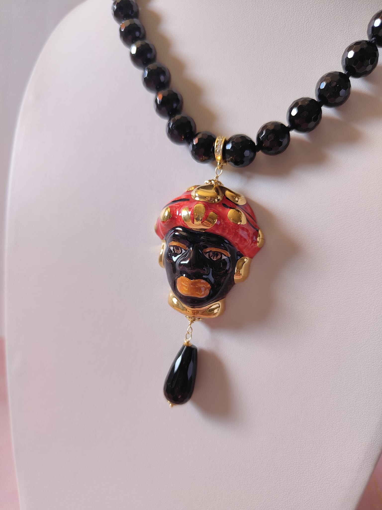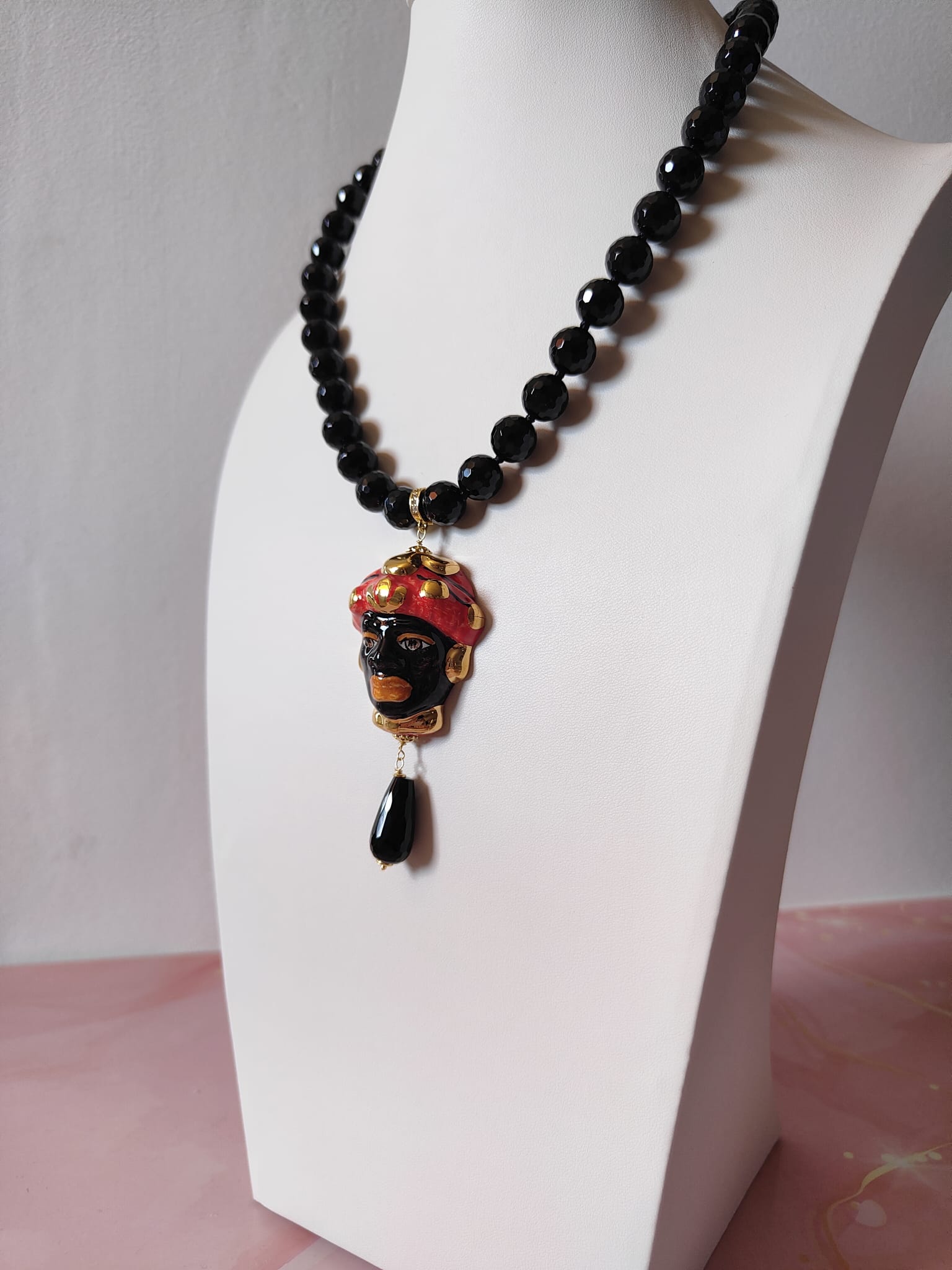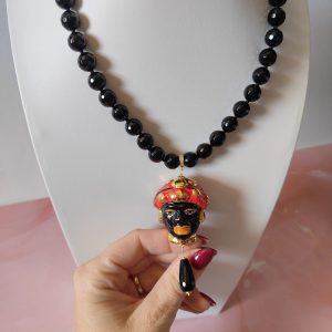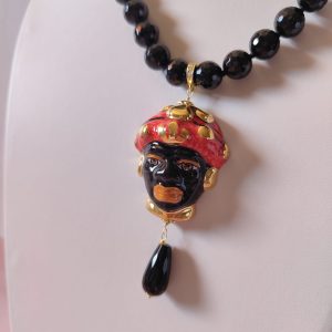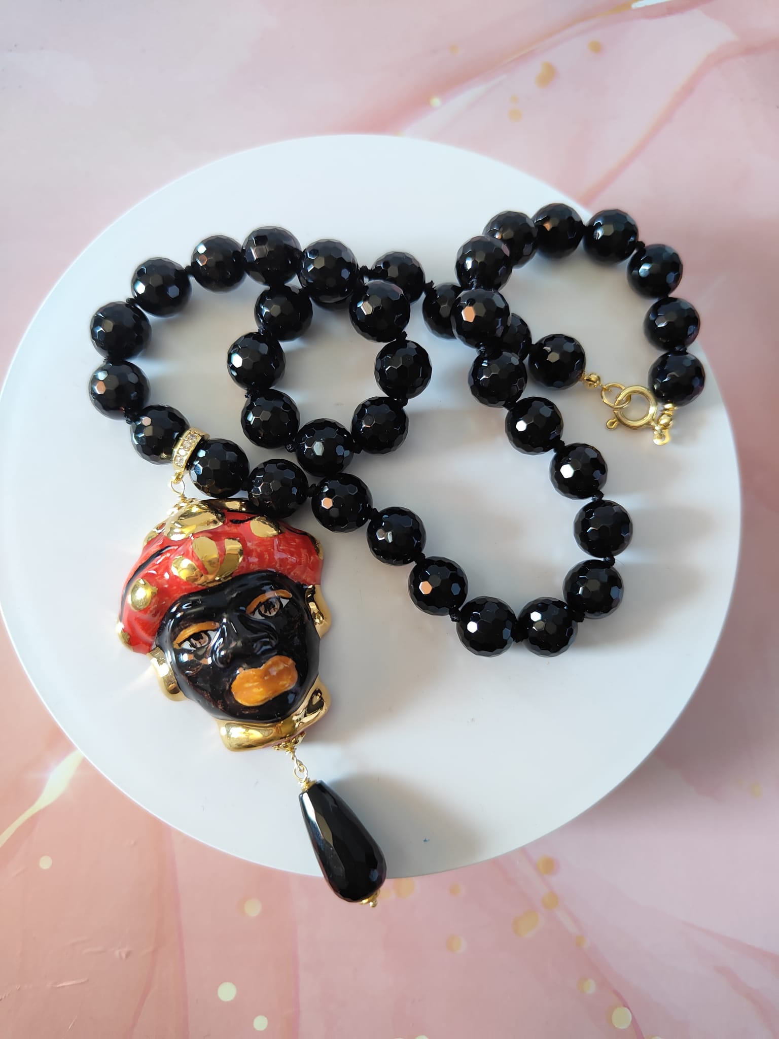 Realizzato con sfere di onice nero sfaccettato, questo girocollo cattura la luce con una brillantezza discreta ma intensa. Ogni perlina riflette la profondità e la protezione simbolica di questa pietra, da sempre considerata una custode di energia e forza interiore. Al centro, un maestoso ciondolo in ceramica di Caltagirone, interamente dipinto a mano, racchiude l’essenza della tradizione artistica siciliana, con dettagli dorati che esaltano il contrasto tra i toni caldi e l’intensità dell’onice.