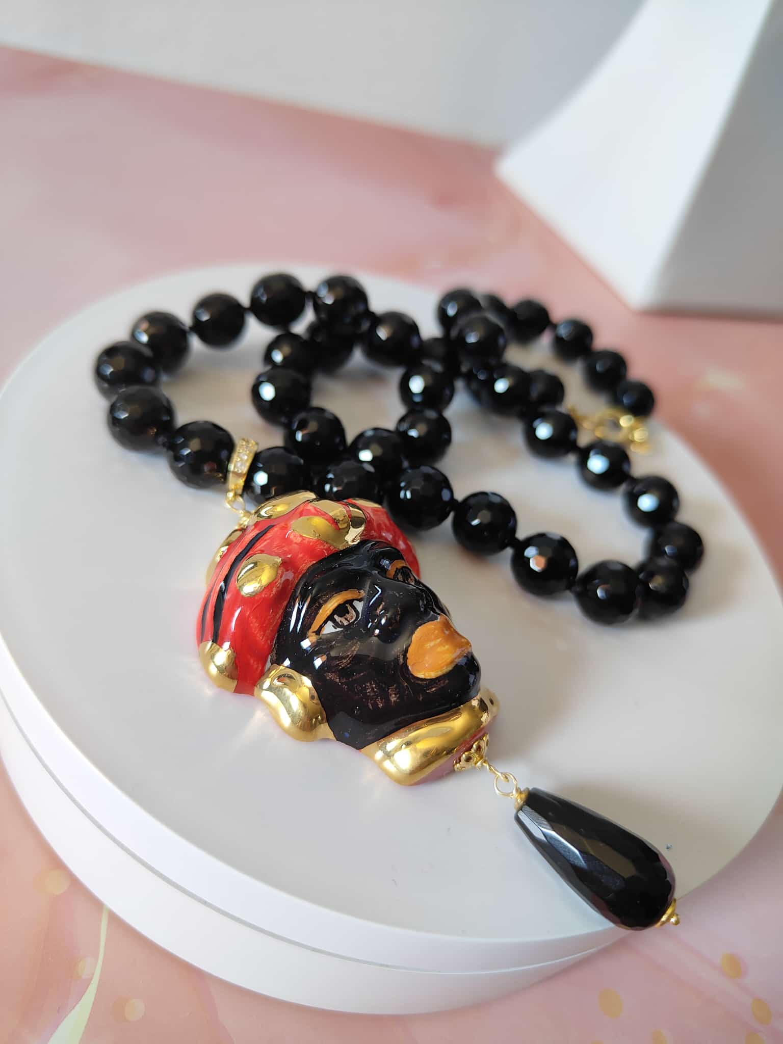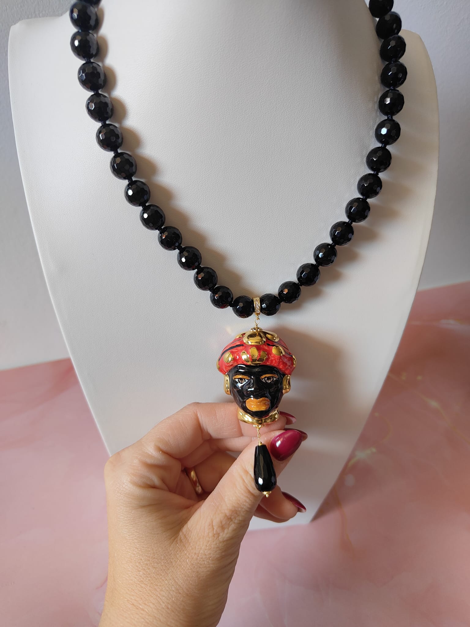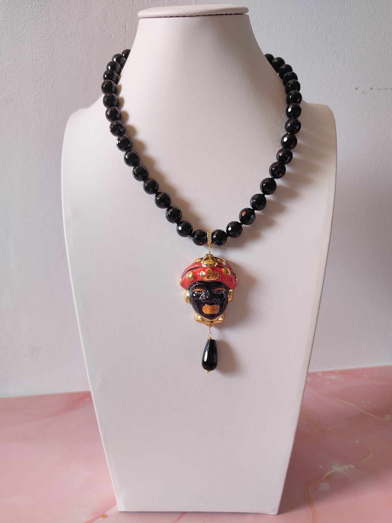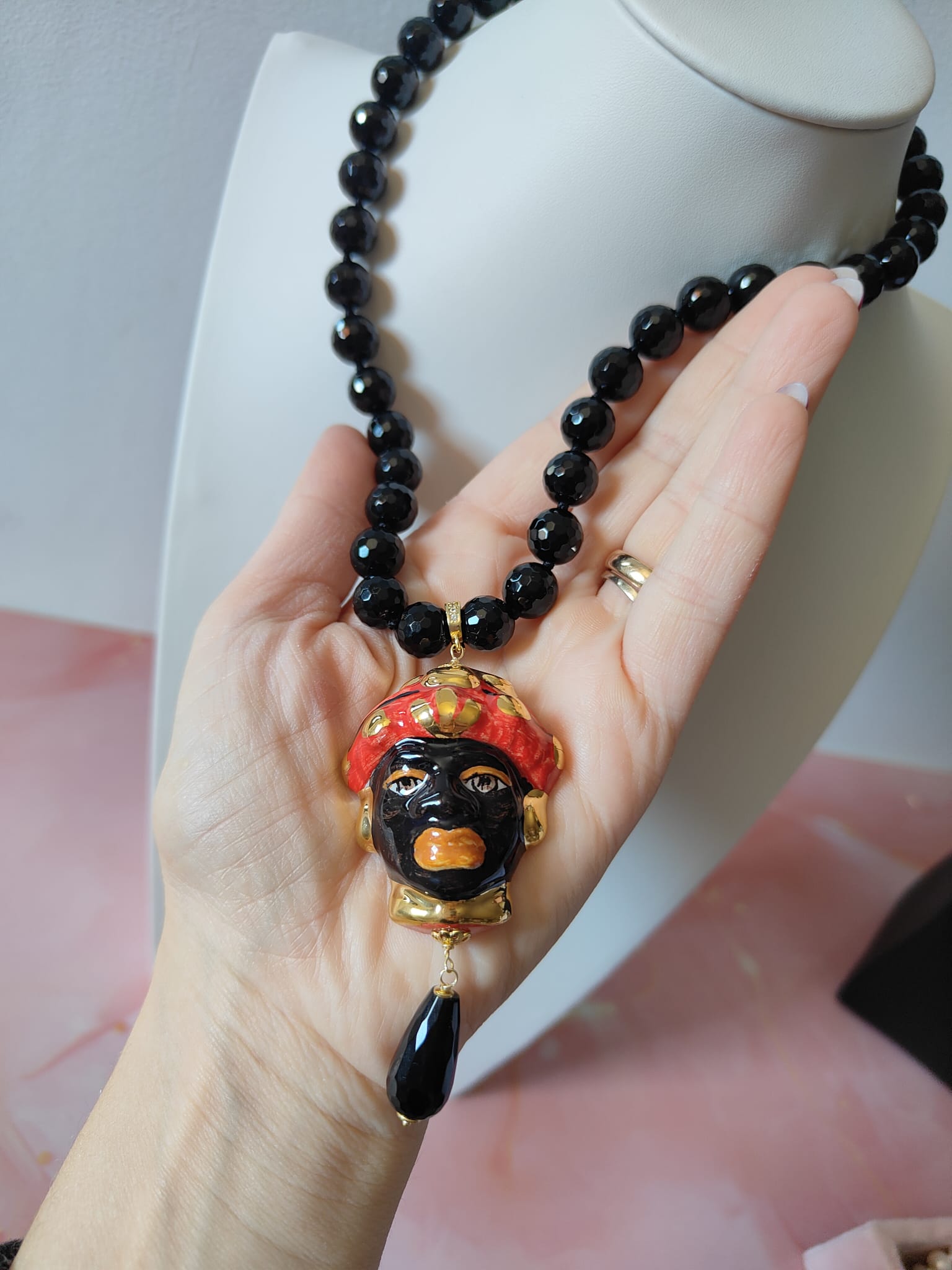 Realizzato con sfere di onice nero sfaccettato, questo girocollo cattura la luce con una brillantezza discreta ma intensa. Ogni perlina riflette la profondità e la protezione simbolica di questa pietra, da sempre considerata una custode di energia e forza interiore. Al centro, un maestoso ciondolo in ceramica di Caltagirone, interamente dipinto a mano, racchiude l’essenza della tradizione artistica siciliana, con dettagli dorati che esaltano il contrasto tra i toni caldi e l’intensità dell’onice.