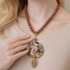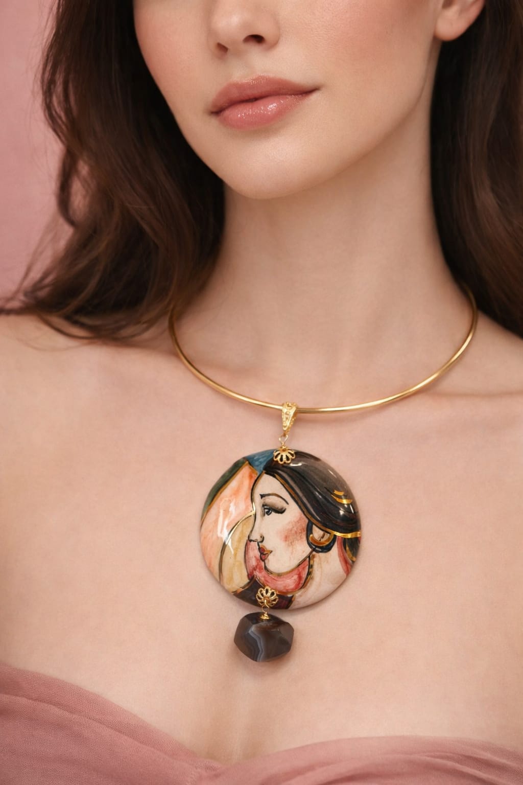 Questo girocollo rigido con volto dipinto è un pezzo unico, realizzato artigianalmente e fedele alle immagini. Ogni dettaglio, dalla ceramica dipinta a mano alla scelta delle pietre, corrisponde esattamente alla creazione fotografata, rendendo il gioiello esclusivo e irripetibile.