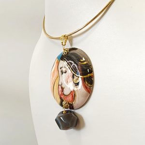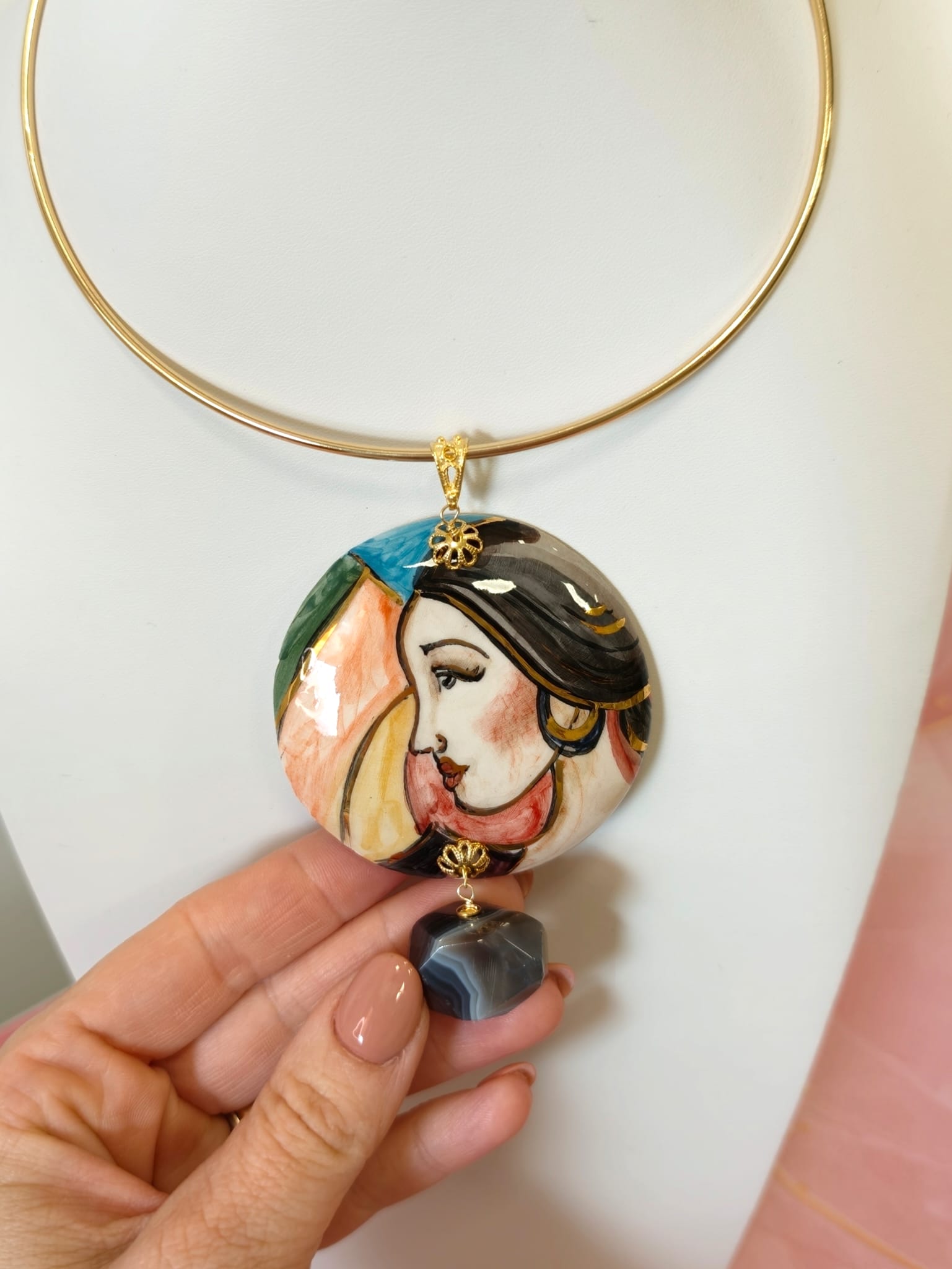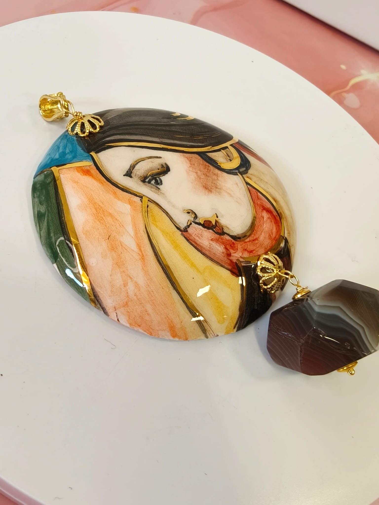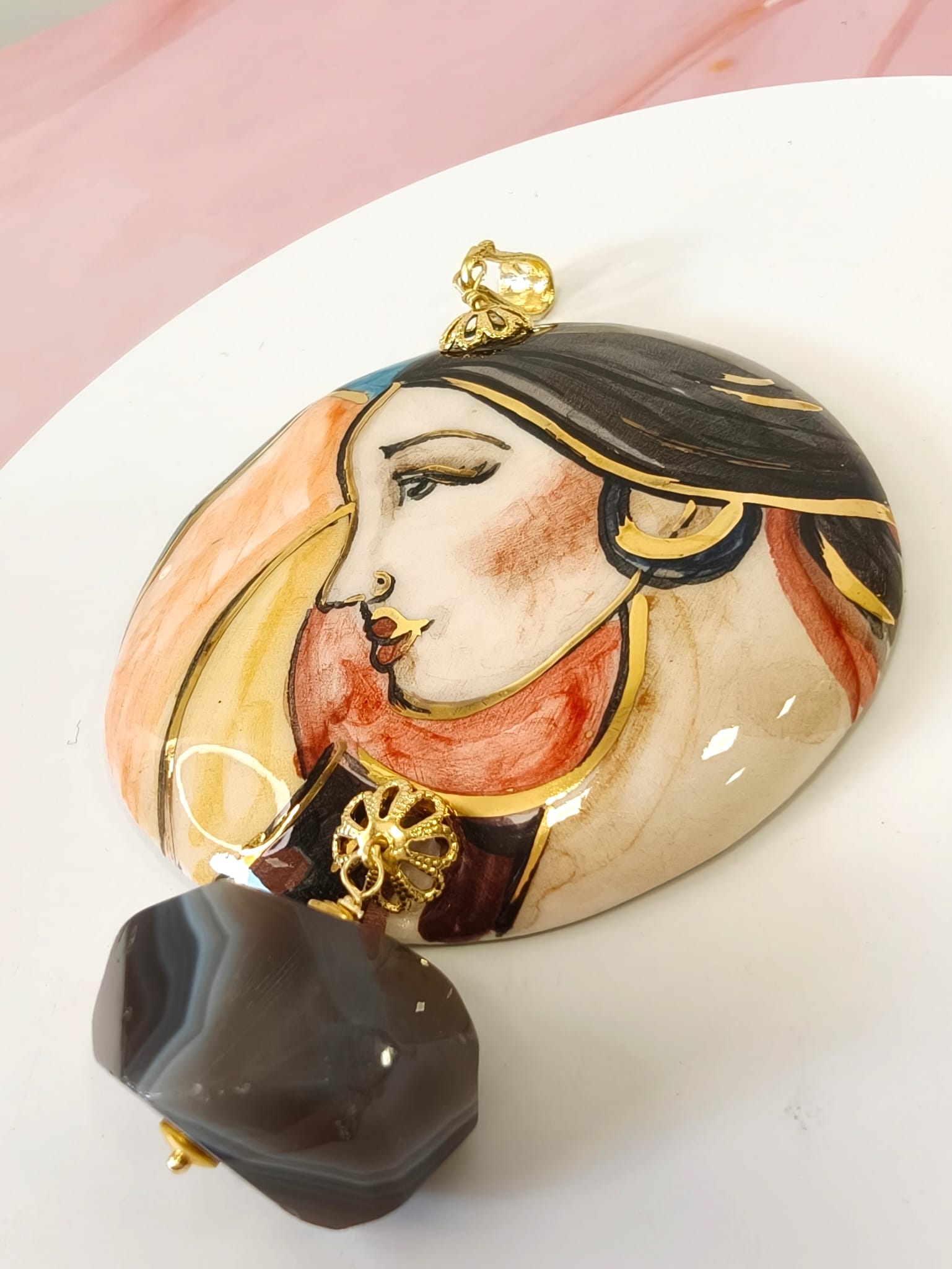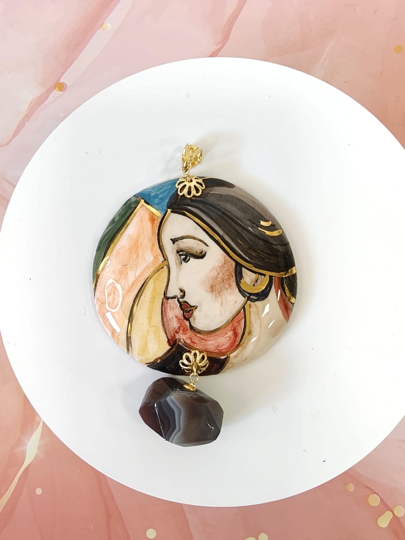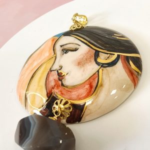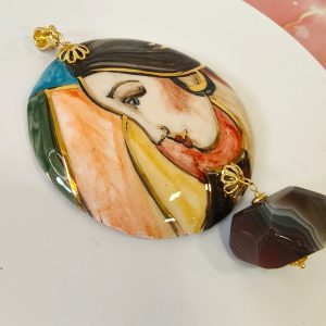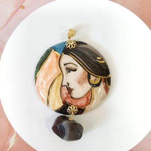 Il ciondolo è dotato di gancio in ottone dorato ed è impreziosito da un connettore in ceramica di Caltagirone dipinta a mano, raffigurante un volto femminile intenso e delicato. Le pennellate morbide, le sfumature calde e i dettagli dorati raccontano la maestria artigianale della ceramica, rendendo ogni espressione unica e carica di personalità.