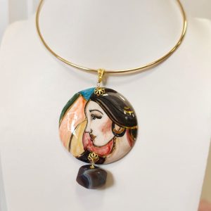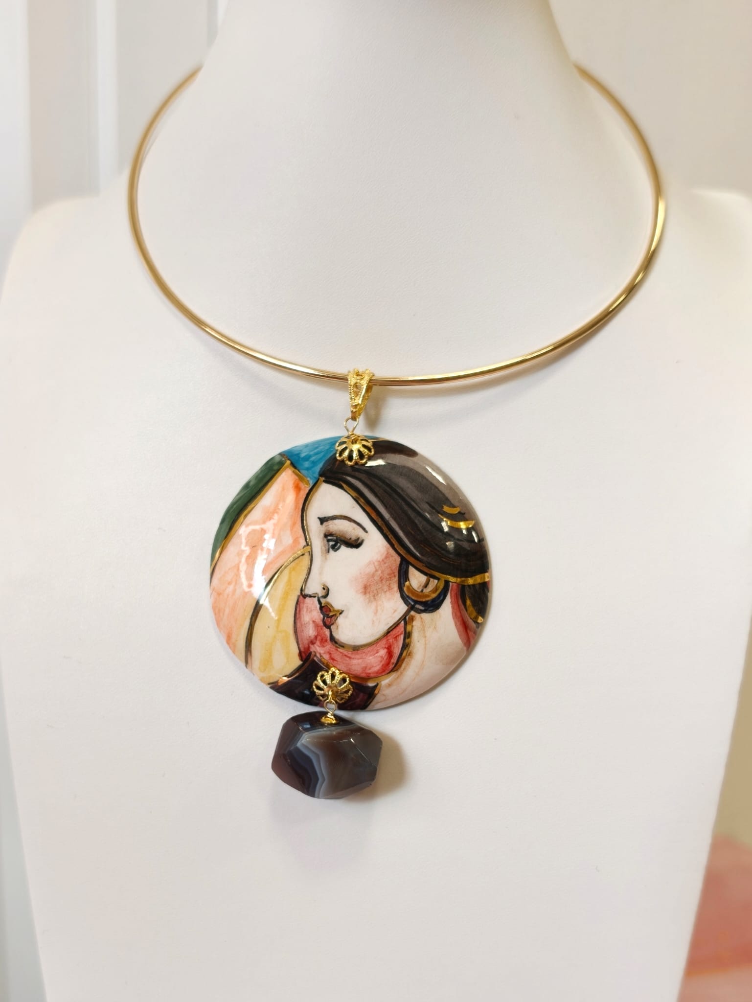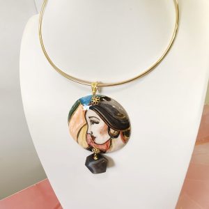 Questo girocollo rigido con volto dipinto è una creazione artigianale dal forte impatto artistico, pensata per chi desidera indossare un gioiello che unisce design essenziale e tradizione decorativa siciliana. Un pezzo distintivo, elegante e contemporaneo, capace di trasformare il ciondolo in un vero elemento narrativo.