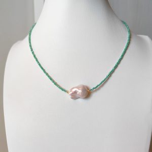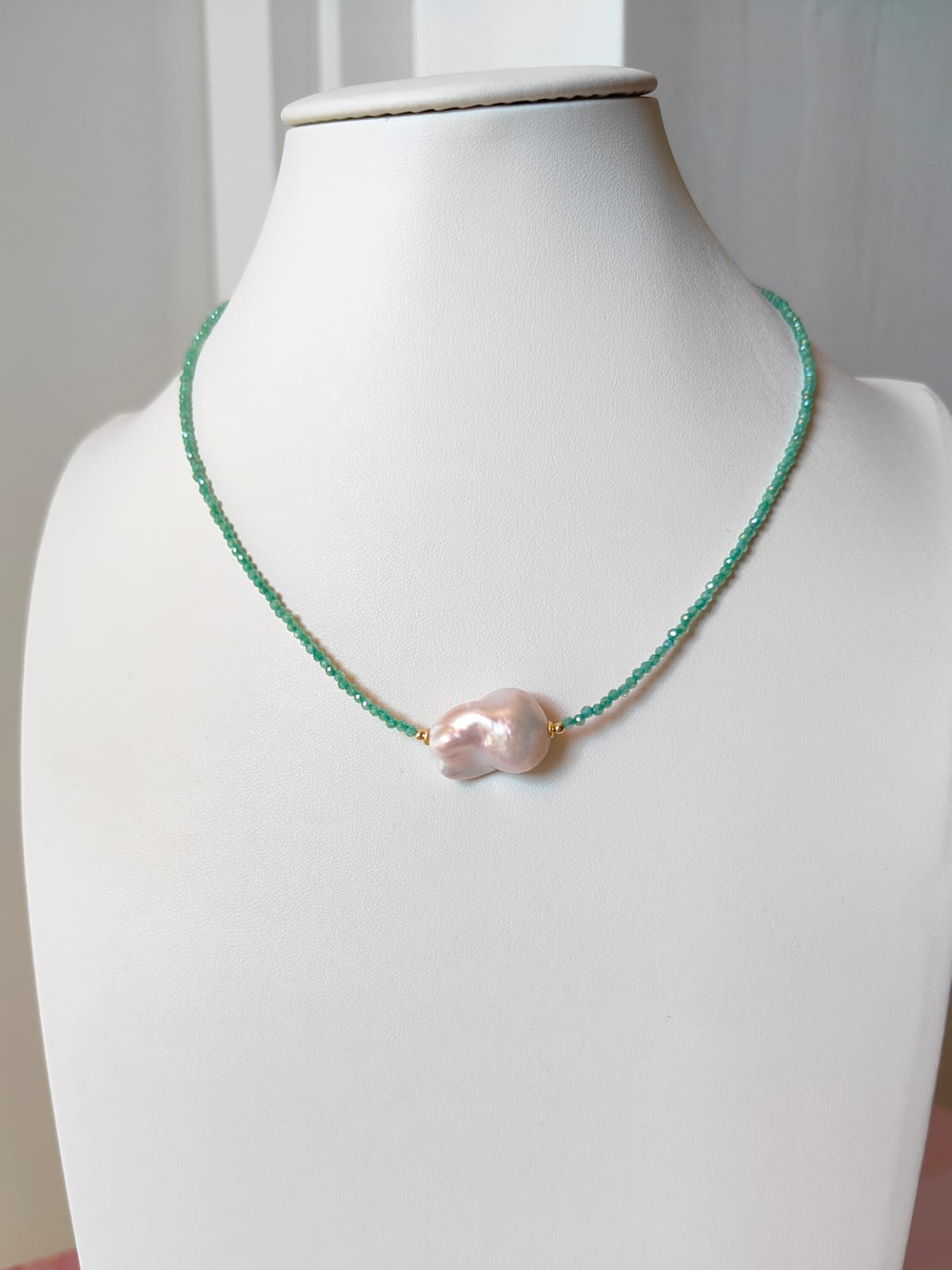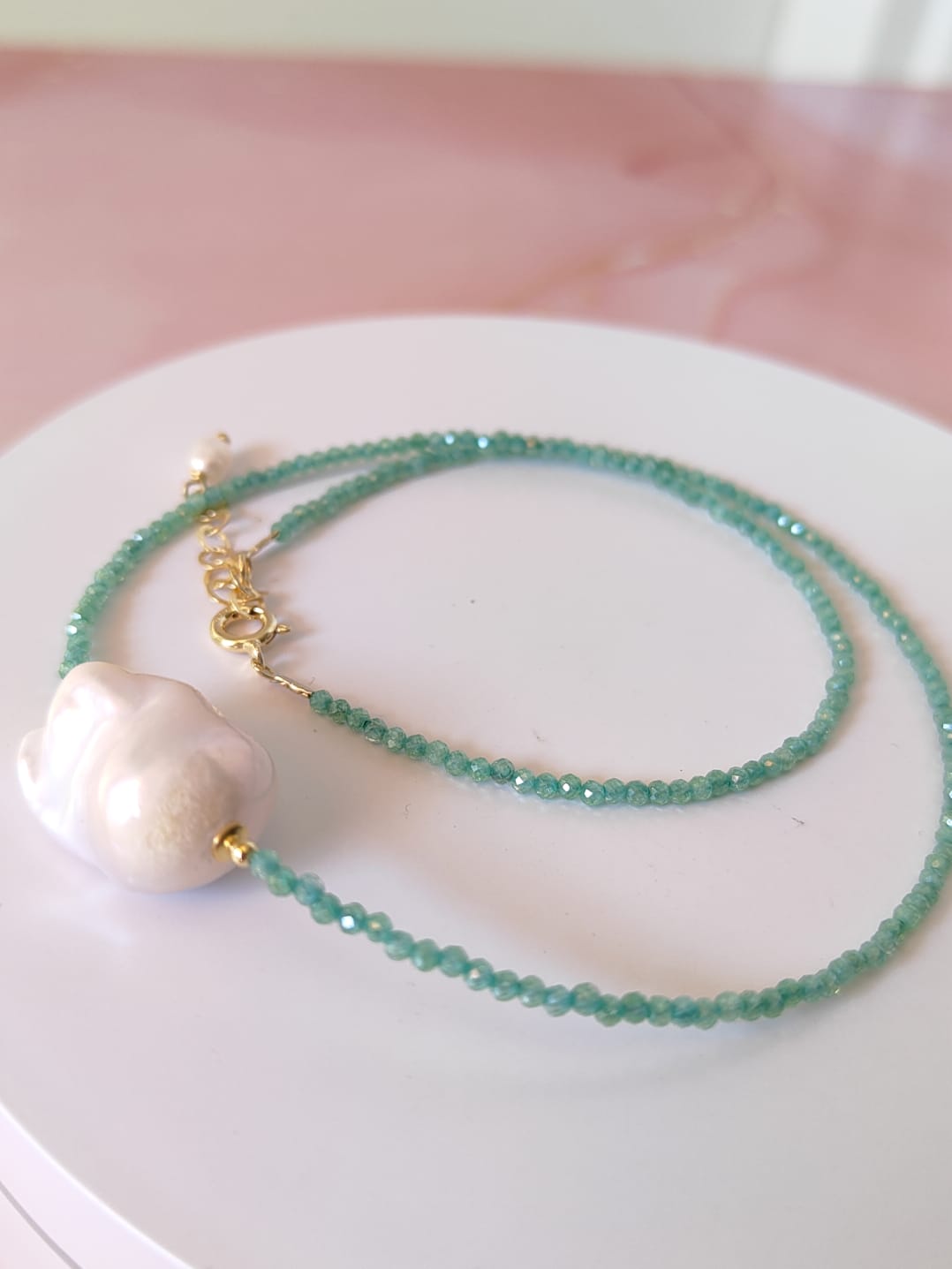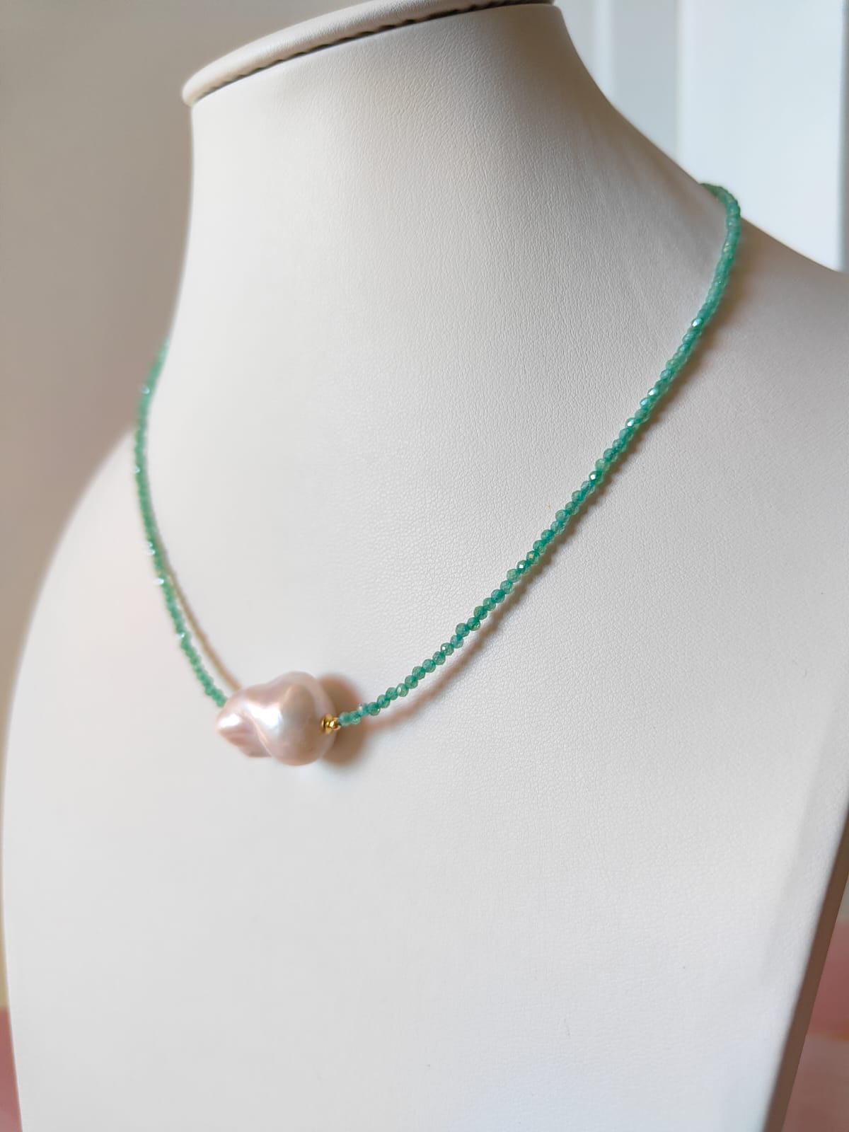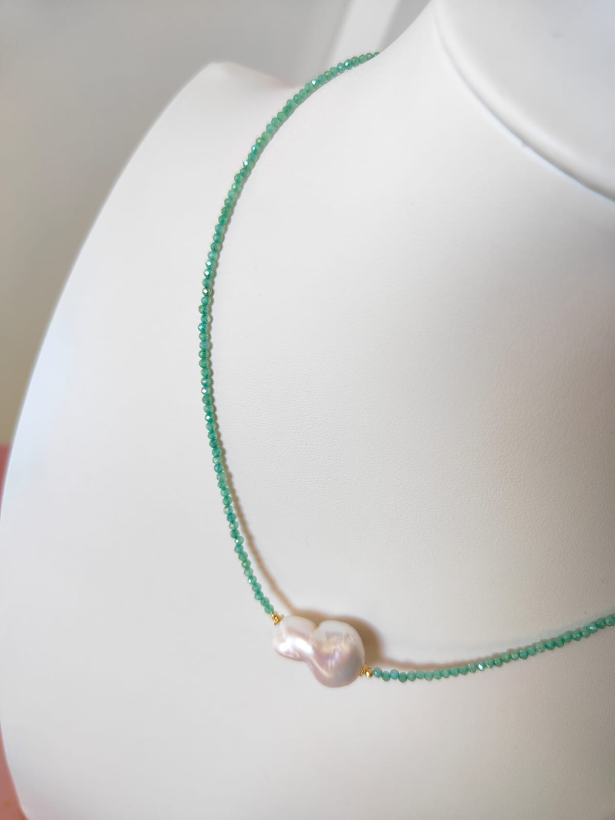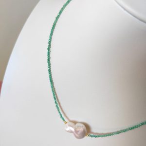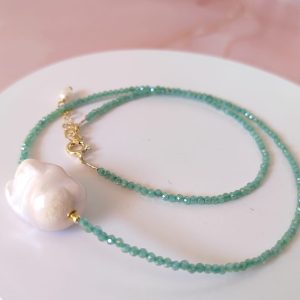 Materiali: zirconi verdi sfaccettati, perla barocca naturale d’acqua dolce, inserti in ottone dorato, componenti e chiusura in argento 925 placcato oro