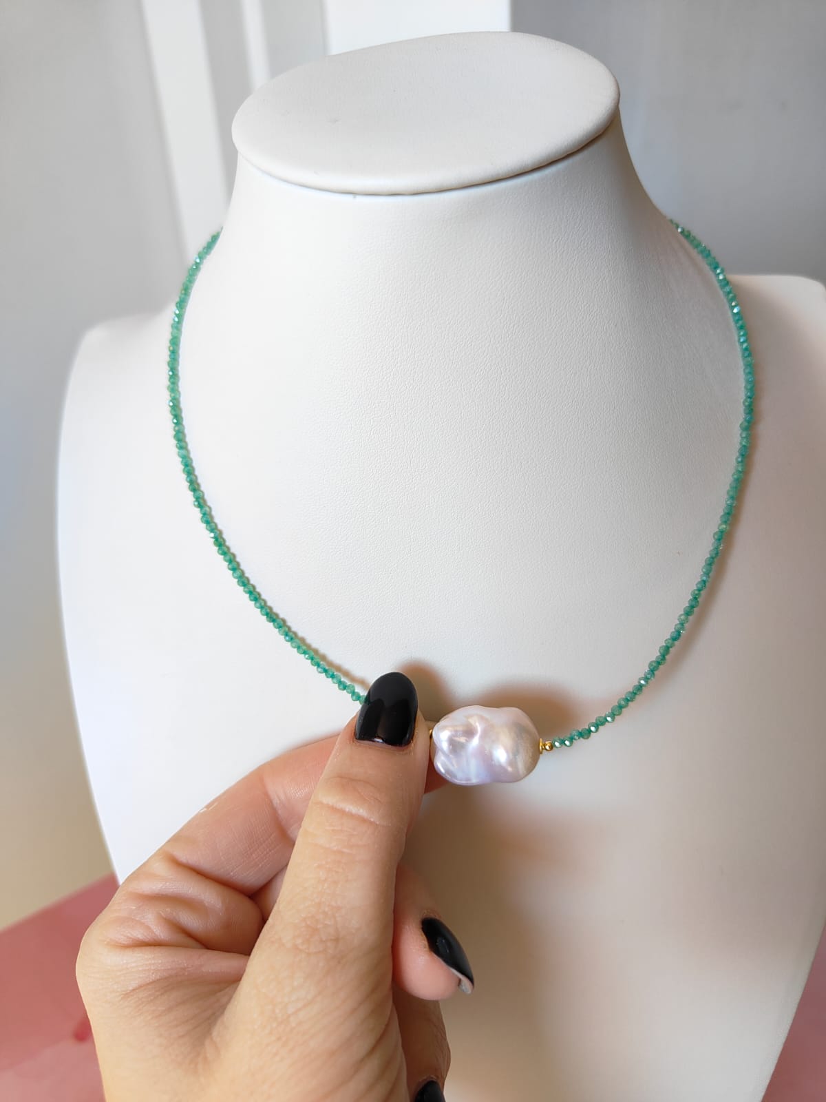 Il girocollo zirconi verdi e barocca può essere indossato singolarmente per un look minimal e sofisticato oppure abbinato ad altre collane per un layering elegante. Perfetto per eventi formali, cerimonie, serate o per aggiungere un accento prezioso a un outfit quotidiano. La sua versatilità lo rende un accessorio perfetto per chi ama gioielli essenziali ma con forte personalità.