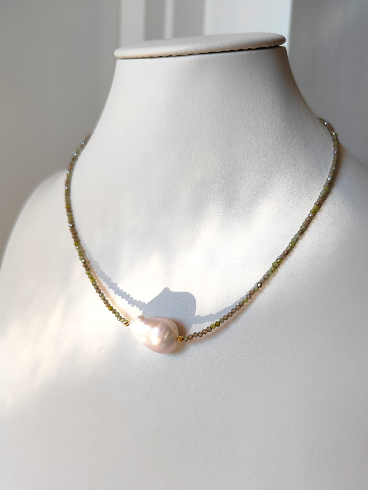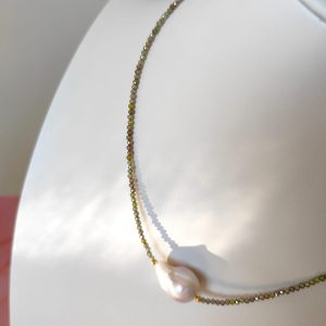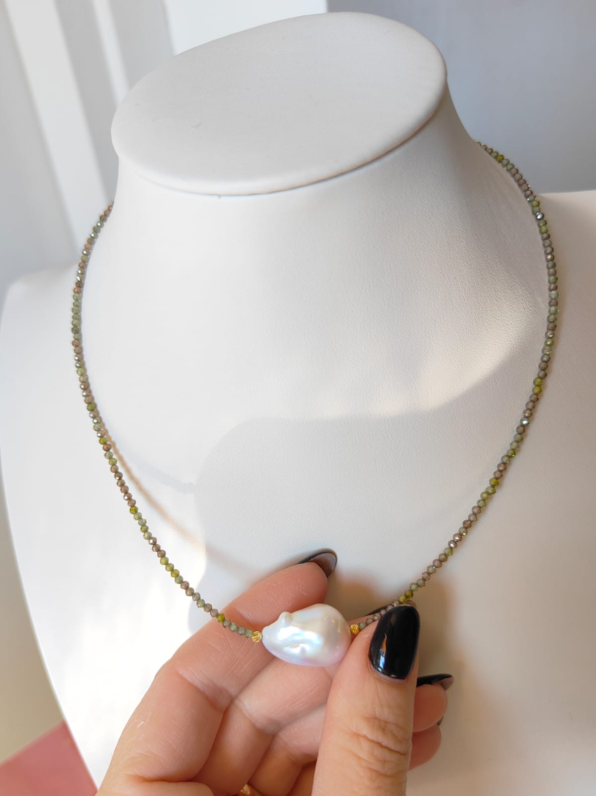 Il Girocollo Zirconi Verdi Perla nasce per chi ama la delicatezza dei toni naturali e l’eleganza senza eccessi. Le sfumature verdi degli zirconi, luminose ma sobrie, creano una collana versatile e facile da abbinare. Al centro, una perla barocca irregolare cattura la luce con un riflesso morbido e perlescente, diventando immediatamente il punto focale del gioiello.