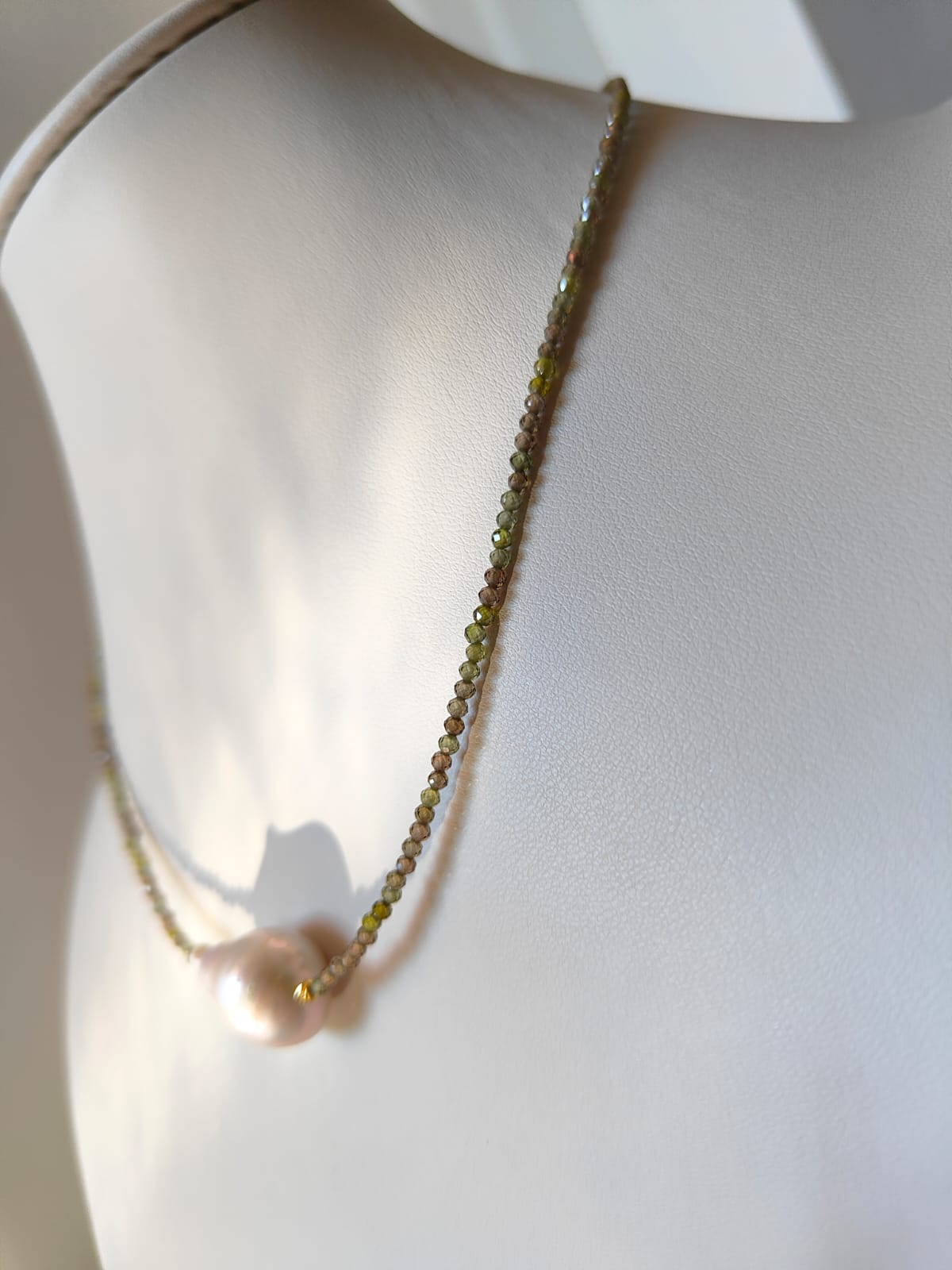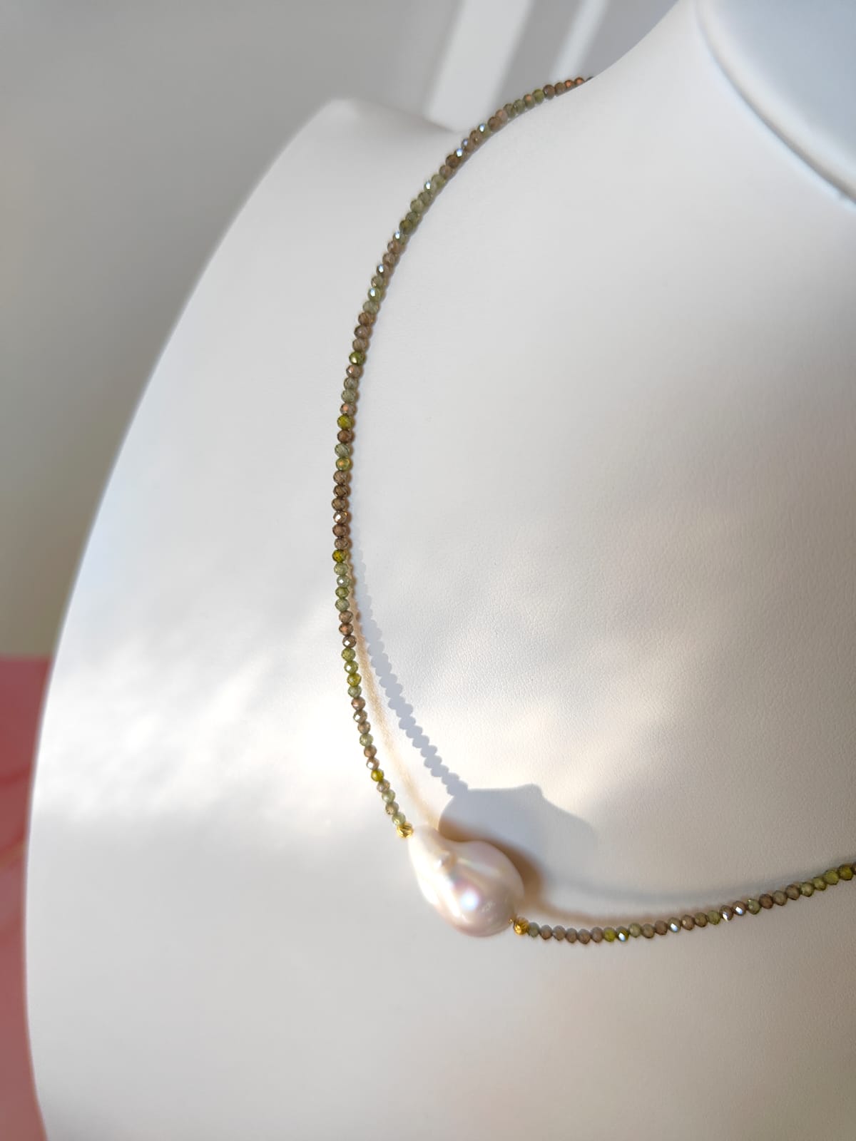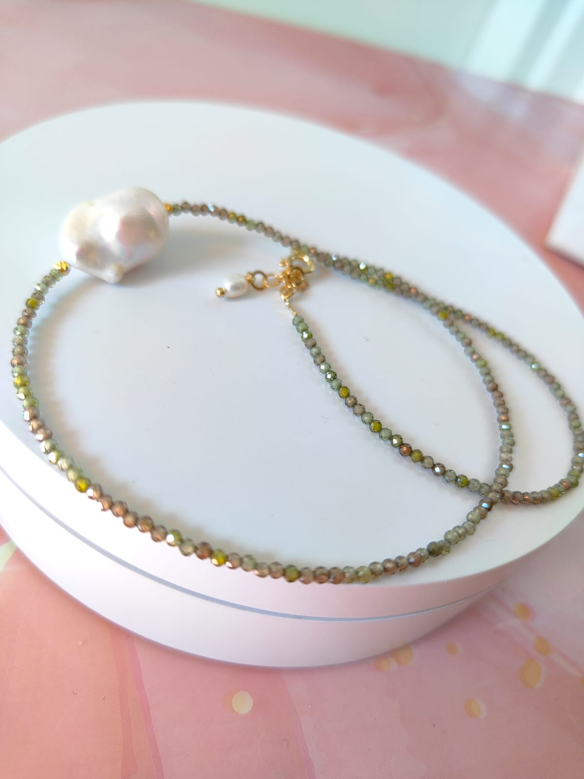 Gli zirconi naturali sfaccettati presentano nuance che spaziano dall’oliva al muschio fino a toni neutri terrosi. Di conseguenza, il girocollo può essere indossato sia con outfit quotidiani sia in abbinamento a gioielli più importanti. Inoltre, la perla centrale è arricchita da piccoli distanziatori in argento 925 placcato oro, che ne esaltano la lucentezza senza appesantire il design.