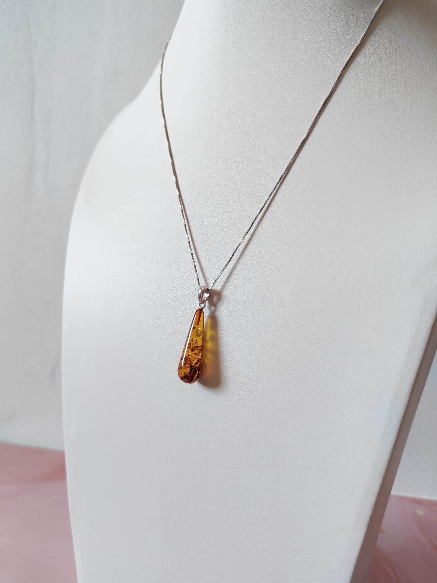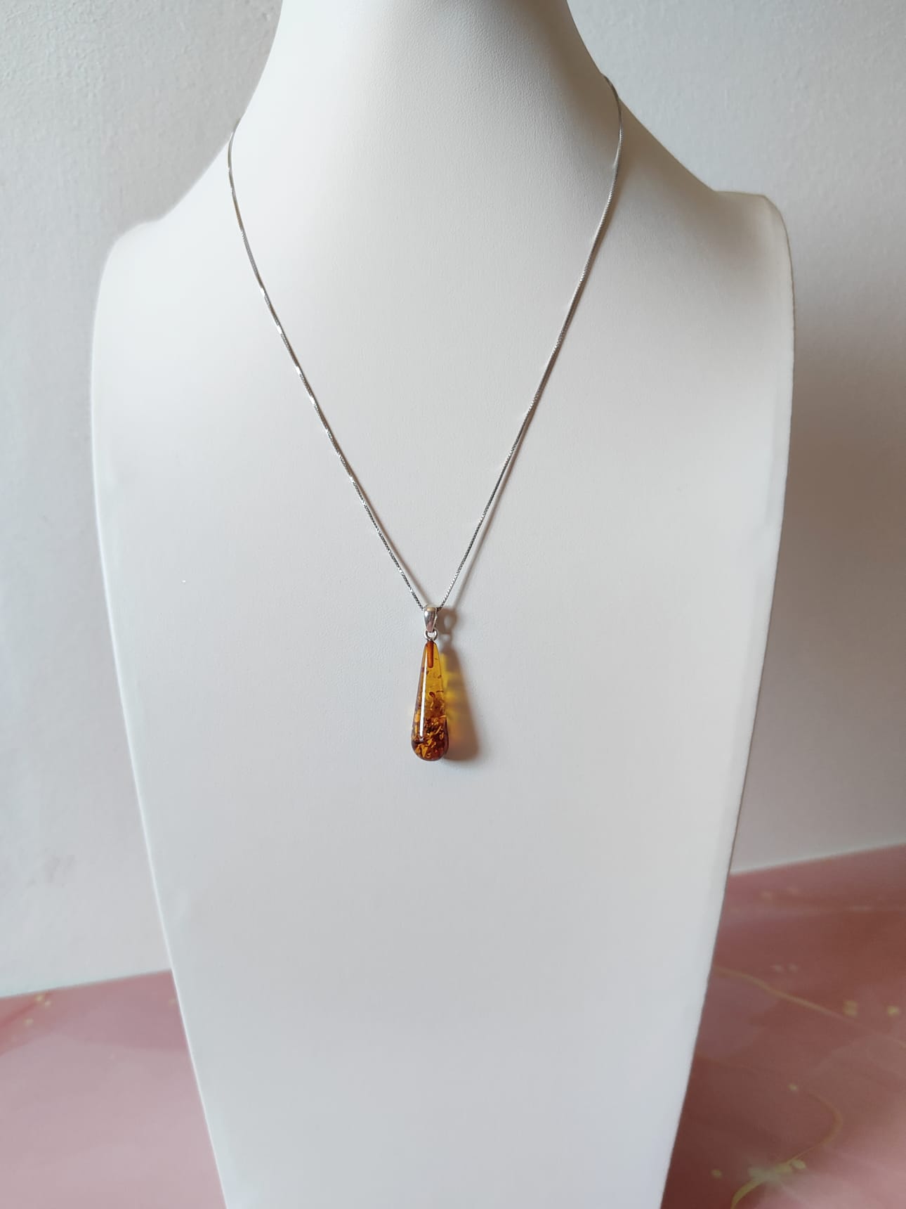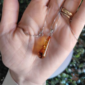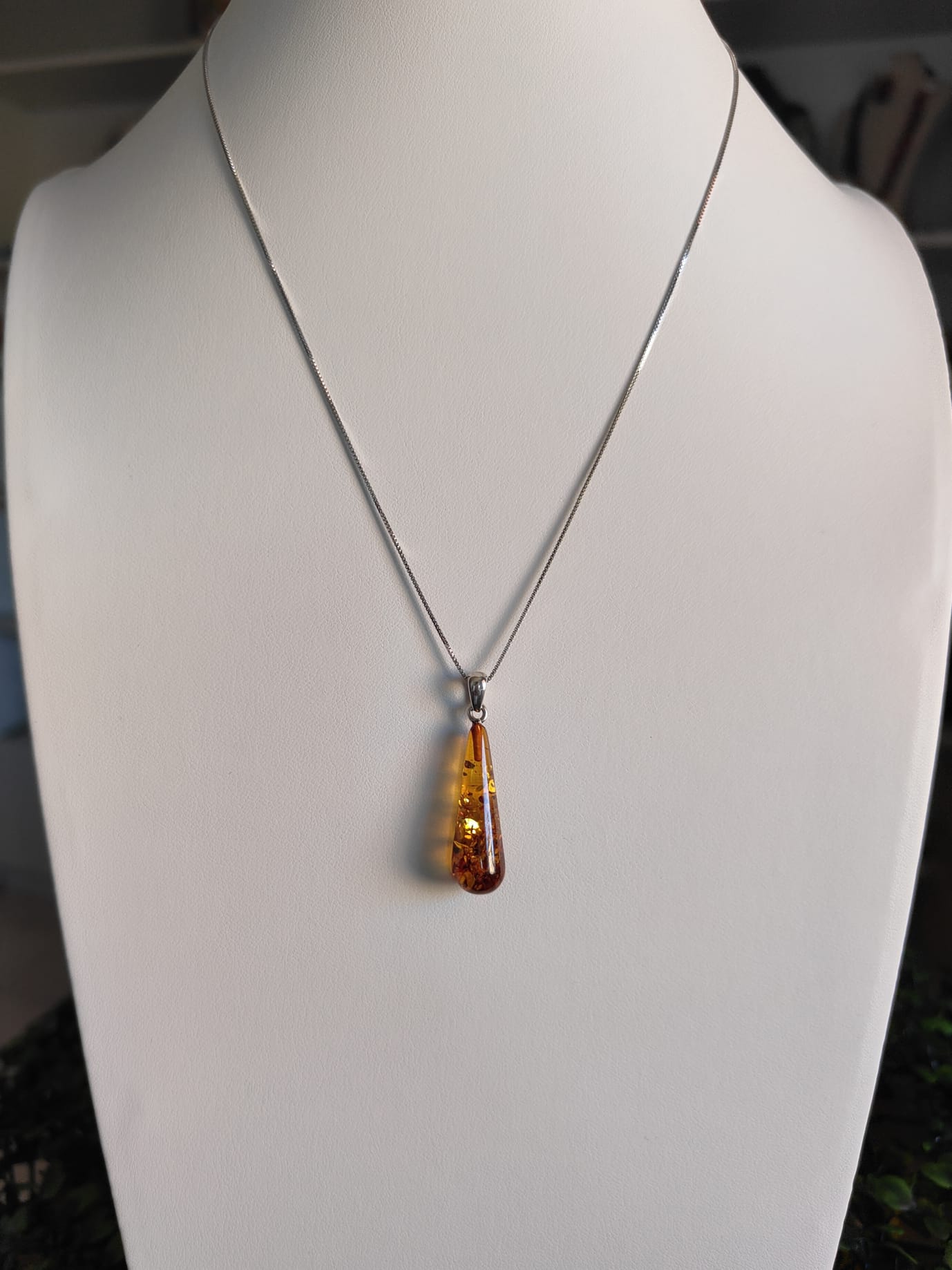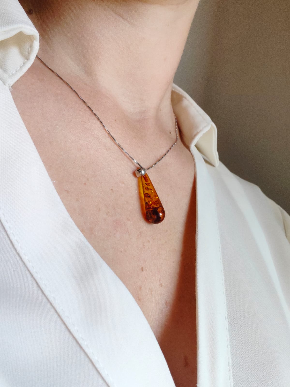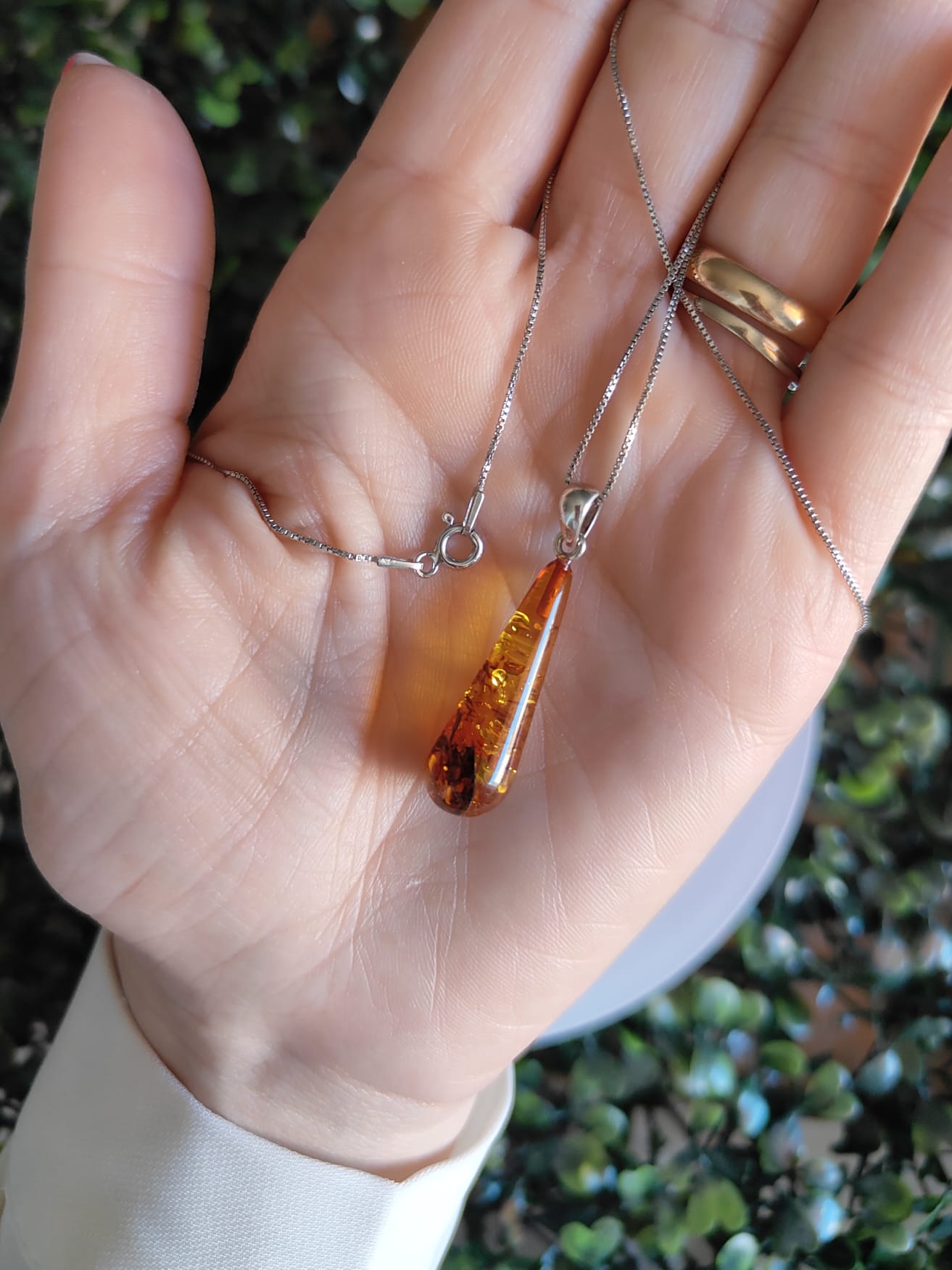 Il ciondolo è montato su una catena in argento 925 di 45 cm, leggera e confortevole da indossare ogni giorno. La goccia in ambra misura circa 3 cm e pesa 3 grammi: dimensioni perfette per farsi notare senza risultare eccessive. Grazie alla sua finitura accurata, il gioiello unisce la tradizione artigianale alla modernità dello stile.