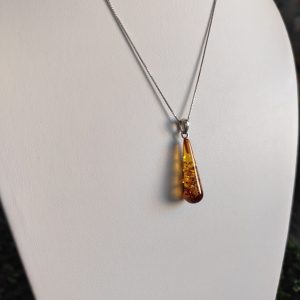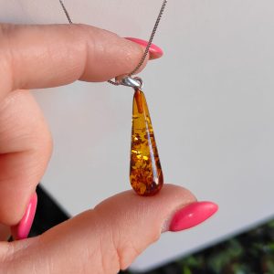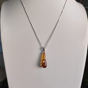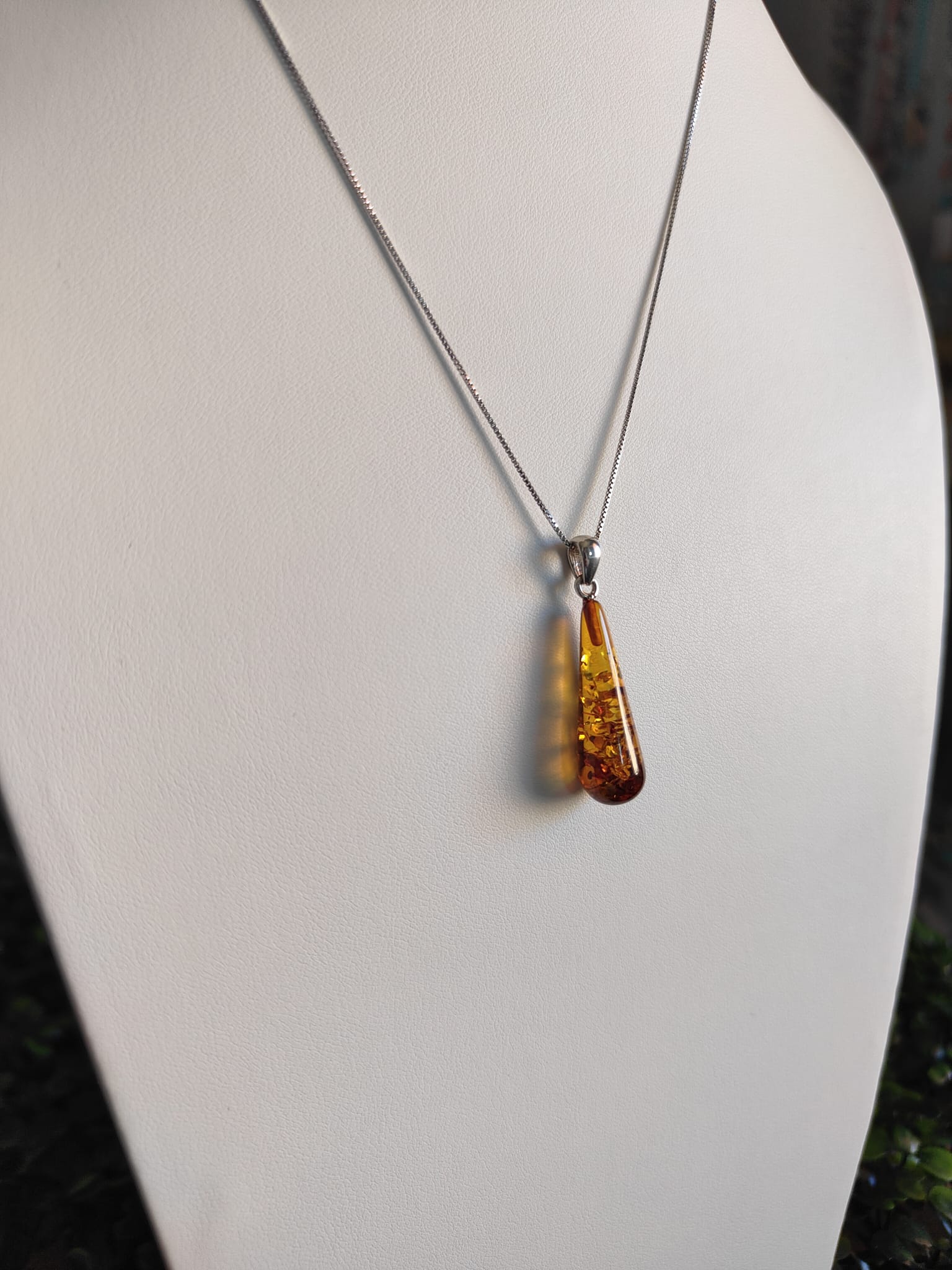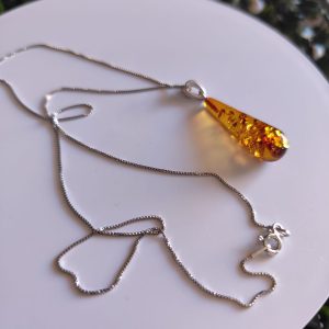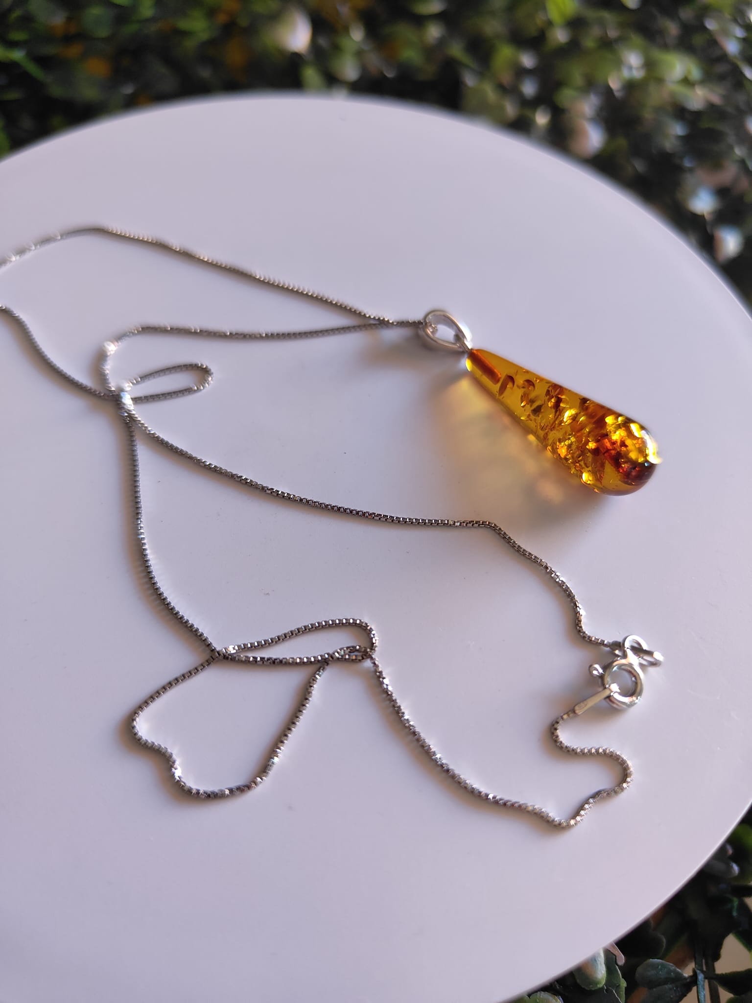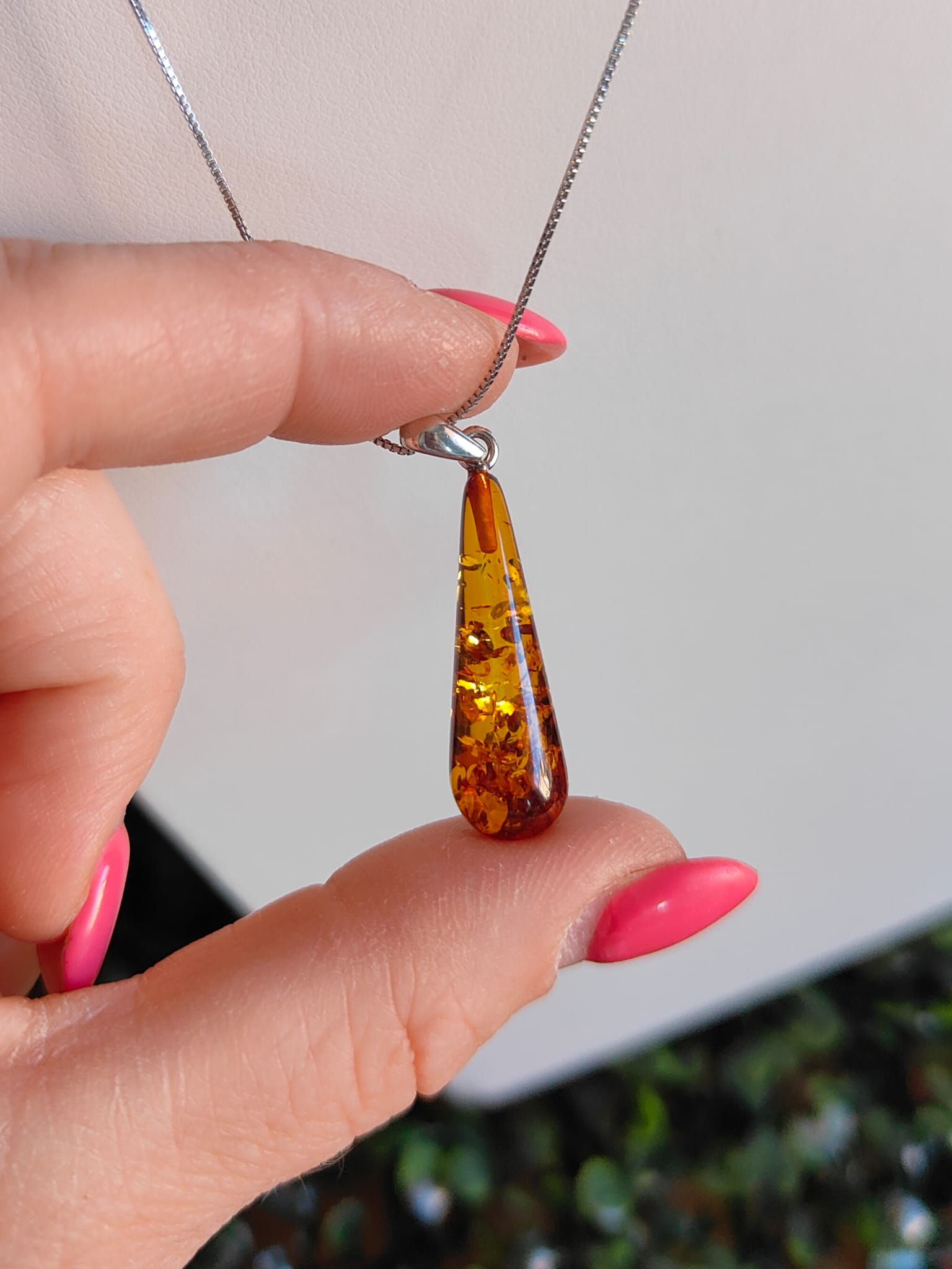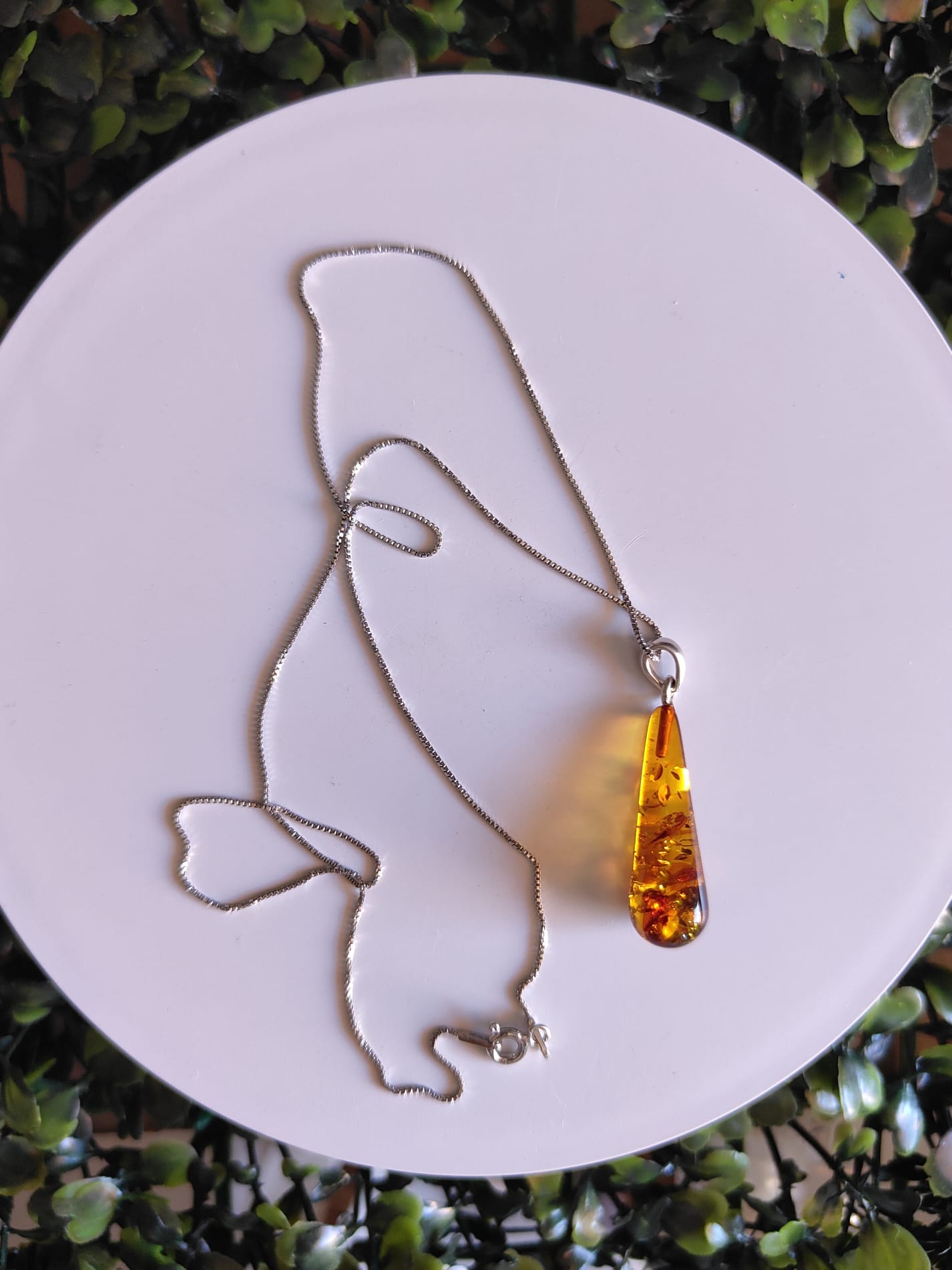 Il ciondolo è montato su una catena in argento 925 di 45 cm, leggera e confortevole da indossare ogni giorno. La goccia in ambra misura circa 3 cm e pesa 3 grammi: dimensioni perfette per farsi notare senza risultare eccessive. Grazie alla sua finitura accurata, il gioiello unisce la tradizione artigianale alla modernità dello stile.