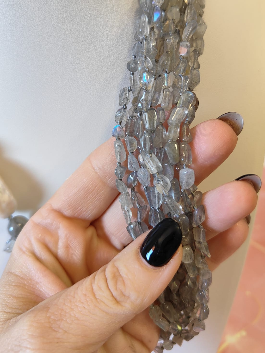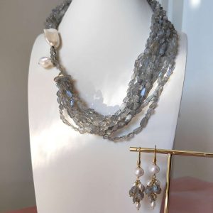 Labradorite E Perle Eleganza dà vita a un coordinato esclusivo, pensato per chi ama indossare gioielli che raccontano una storia di luce, movimento e preziosa artigianalità. Questo set comprende una collana multifilo dalla presenza scenografica e un paio di orecchini luminosi e armoniosi, acquistabili insieme oppure separatamente. Ogni elemento è studiato per creare un equilibrio raffinato tra il grigio cangiante della labradorite e la morbida luminosità delle perle naturali.