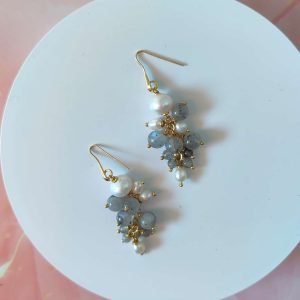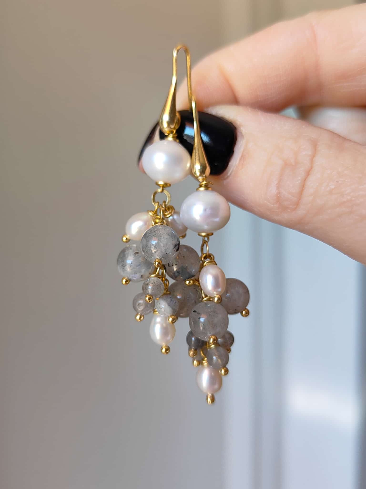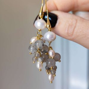 Gli orecchini presentano una monachella in argento 925 placcato oro e una cascata di piccole sfere di labradorite abbinate a perle naturali. Le dimensioni bilanciate e la combinazione di materiali li rendono ideali sia da soli che indossati con la collana. Sono leggeri, armoniosi e incredibilmente luminosi.