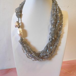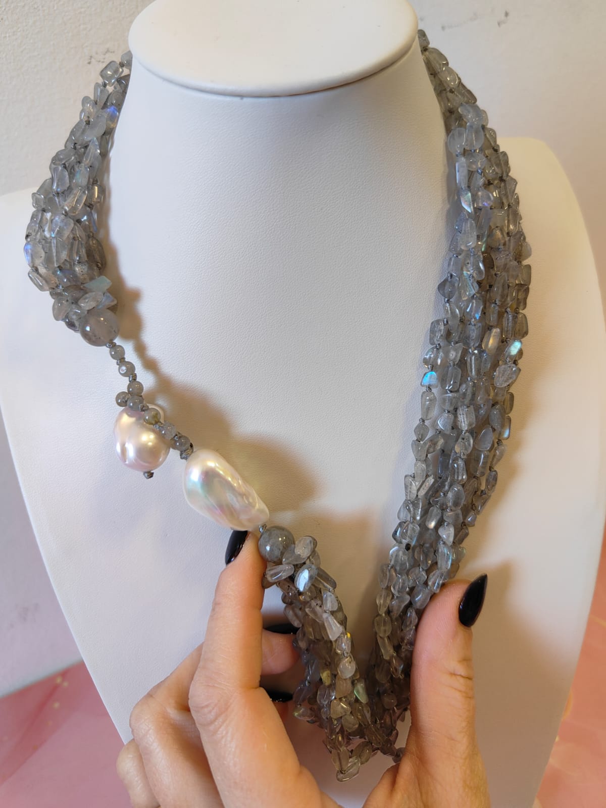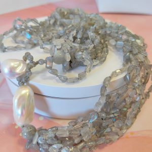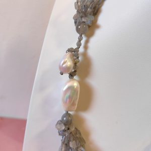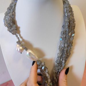 La collana è composta da numerosissimi fili di labradorite naturale dalla forma irregolare, ricca di riflessi blu e argentei. Le pietre si muovono con leggerezza, creando un fluire di luce unica quando vengono indossate. Il dettaglio più distintivo è la chiusura: realizzata con una grande perla barocca che funge da elemento decorativo e funzionale, rendendo il gioiello non solo prezioso, ma anche sorprendente nel design.