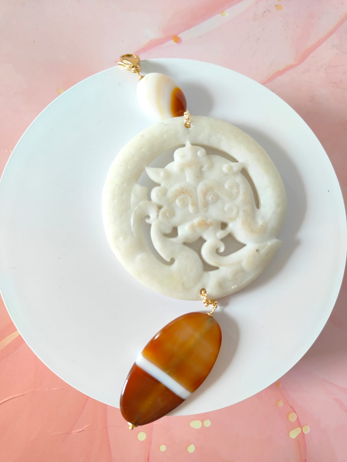 Sopra il mandala, una perla di agata striata dalle sfumature avorio e caramello introduce un contrasto raffinato, mentre nella parte inferiore un’imponente agata striata ovale, con la sua banda centrale bianca e i toni caldi del miele, aggiunge profondità e carattere alla composizione. Le venature naturali rendono ogni pietra unica, come un’impronta della natura stessa.