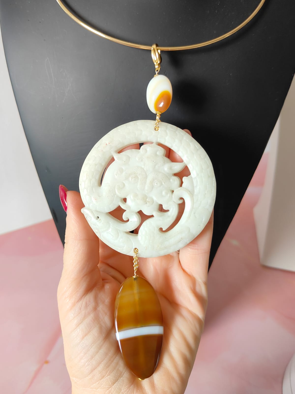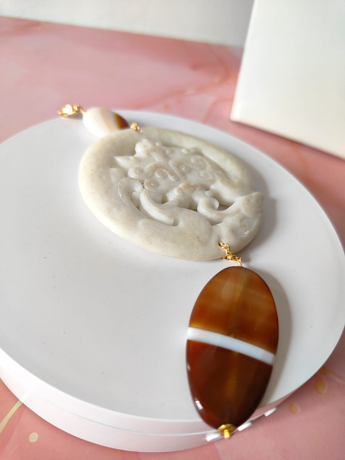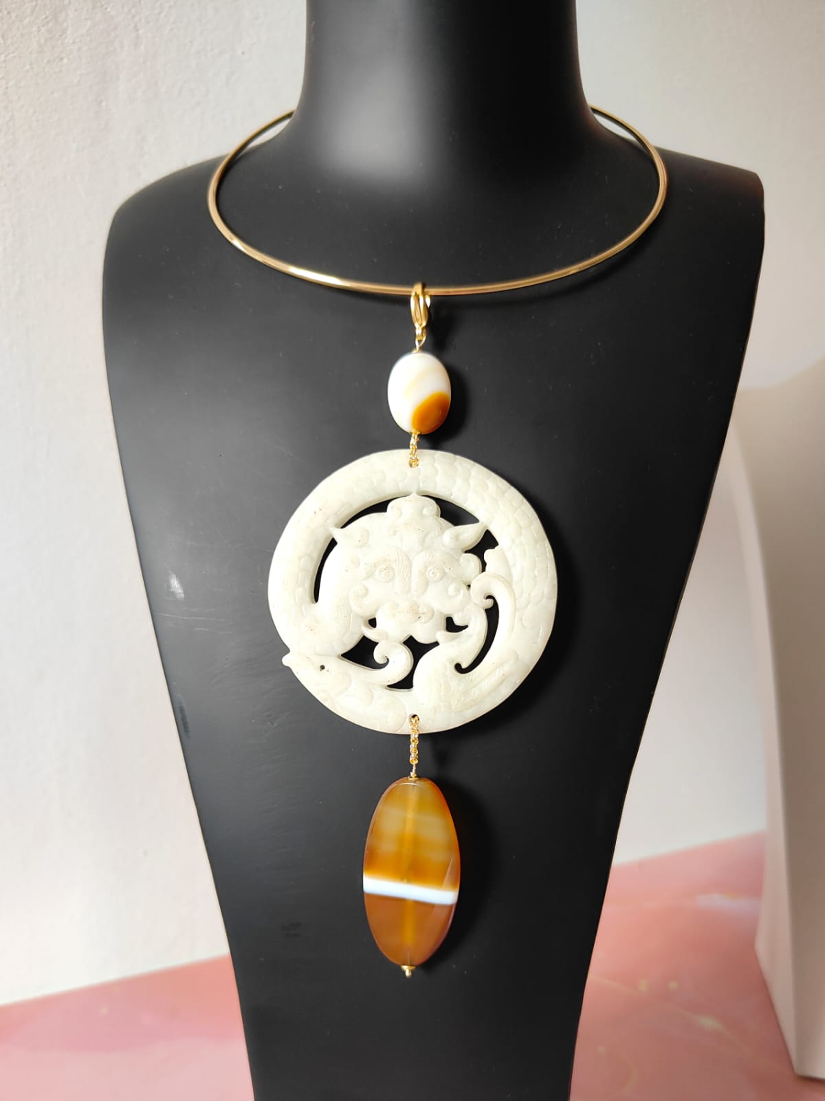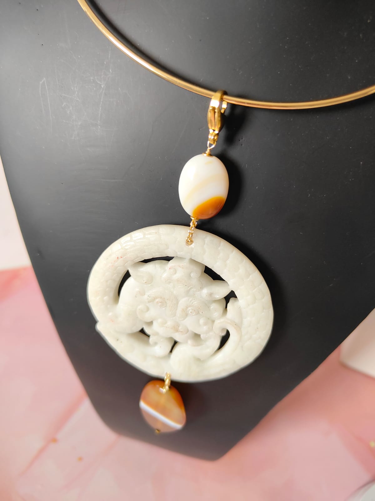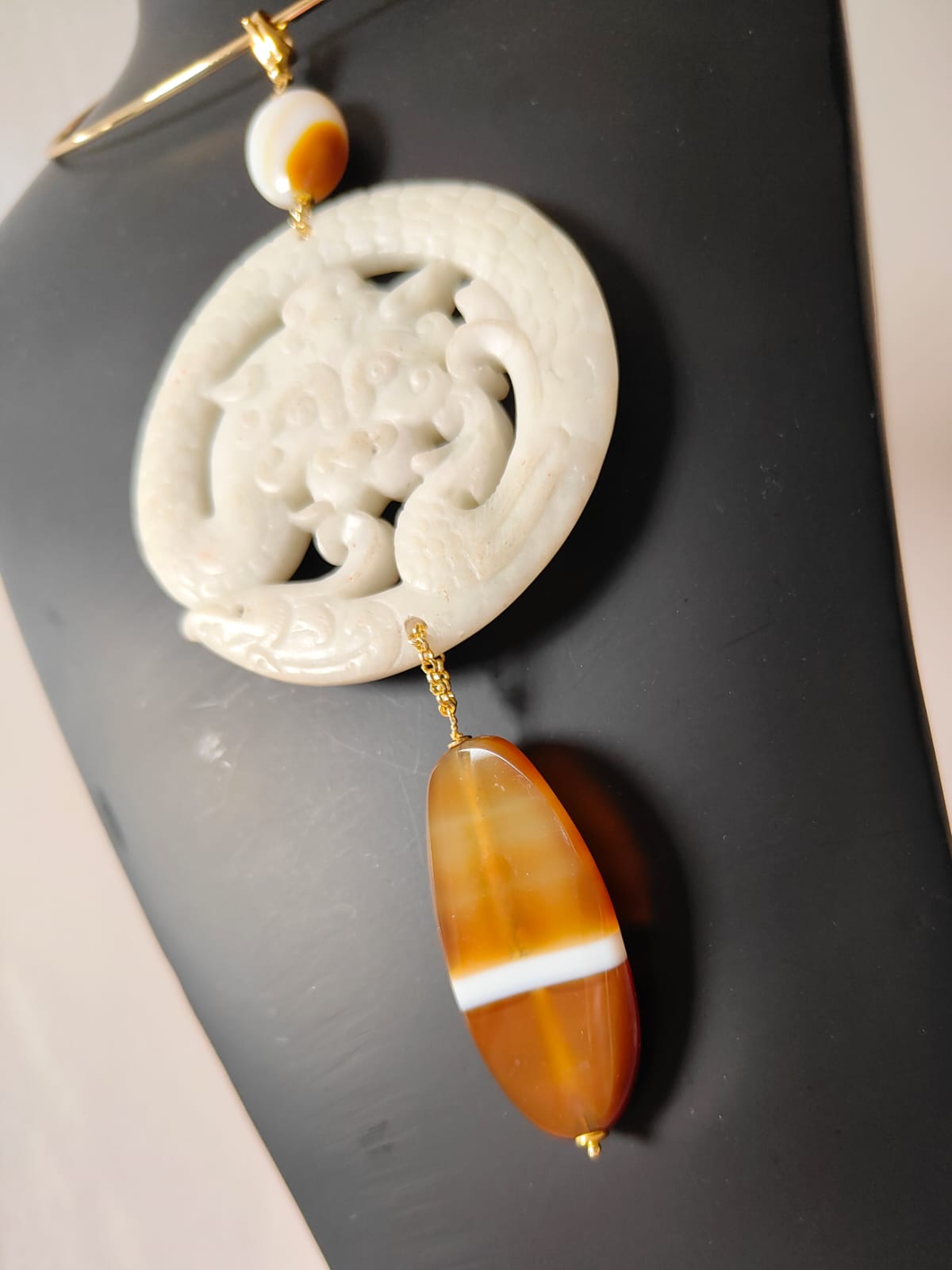 Materiali: giada antica bianca, agata striata naturale, componenti in acciaio dorato