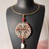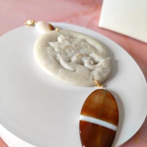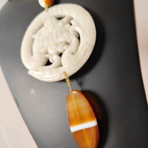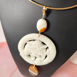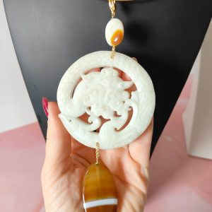 Il pendente centrale, scolpito in giada antica bianca, rappresenta un mandala simbolo di protezione e rinascita. Le linee sinuose e i motivi in rilievo evocano la ciclicità della vita, rendendo questo elemento non solo decorativo ma anche profondamente spirituale. La superficie opalescente della giada cattura la luce con delicatezza, donando un’eleganza naturale e sofisticata.