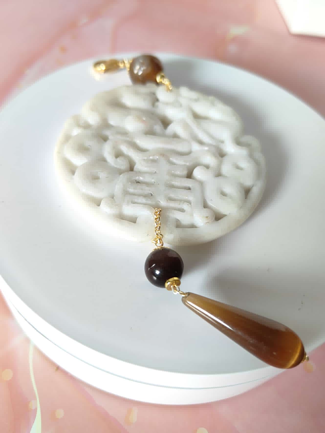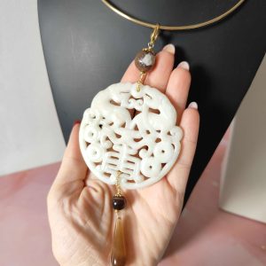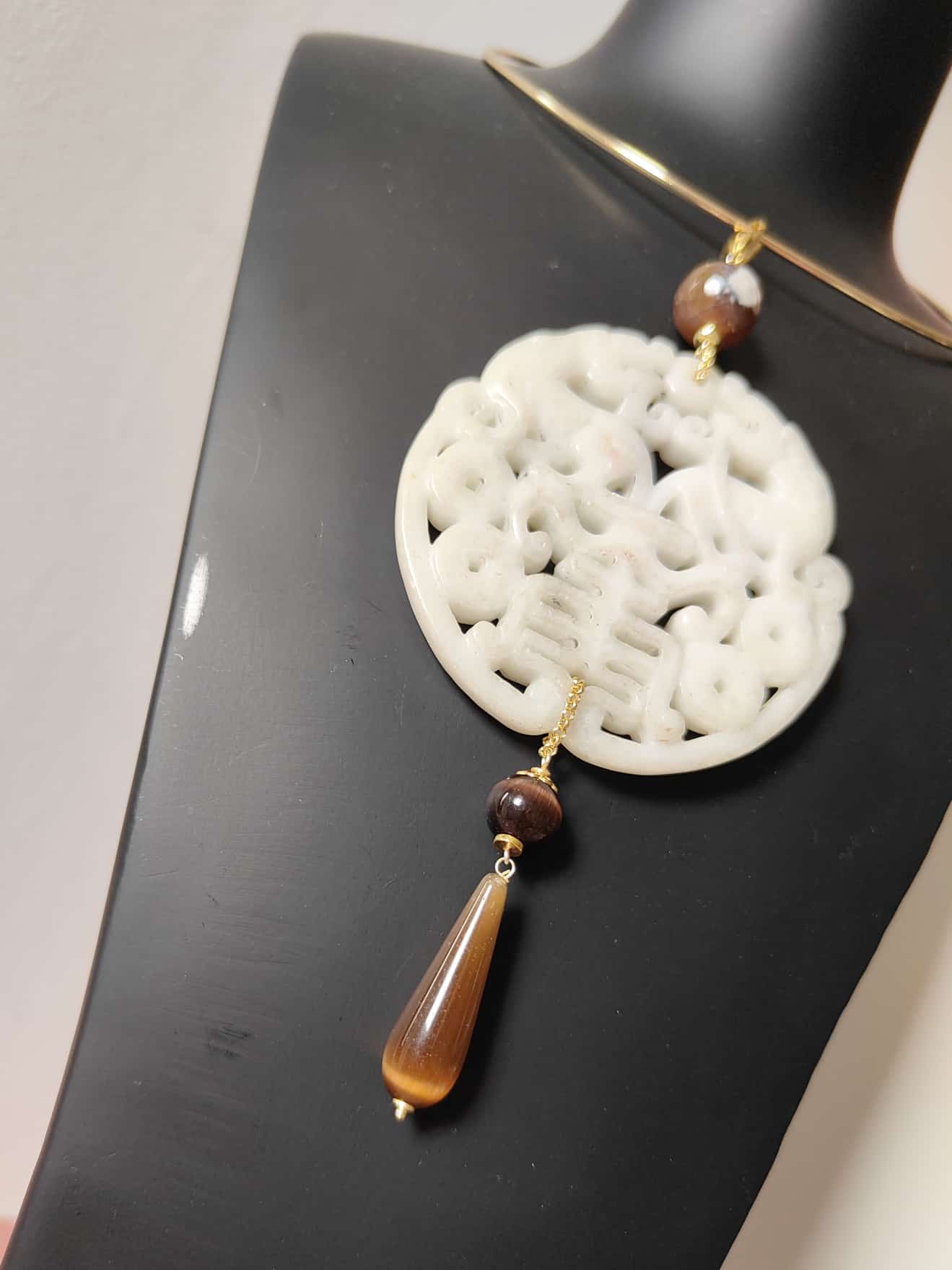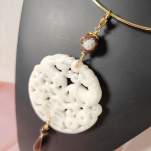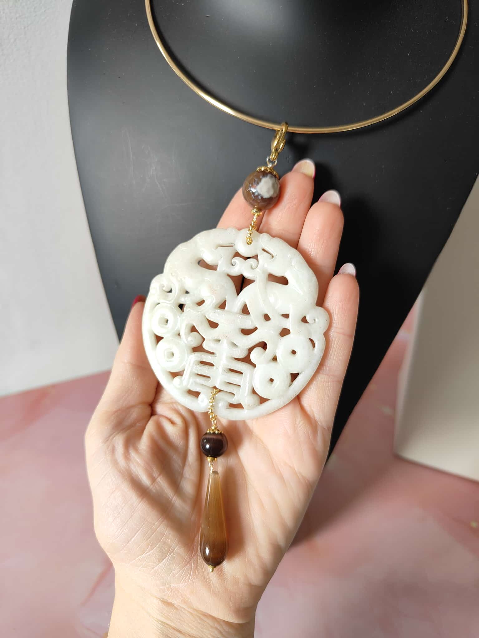 Il ciondolo principale è un mandala scolpito in giada antica color avorio, intagliato con motivi orientali di fortuna e prosperità. Le linee morbide e le sfumature chiare donano al pezzo un’aura delicata e spirituale, perfetta per chi ama la bellezza sobria e senza tempo.