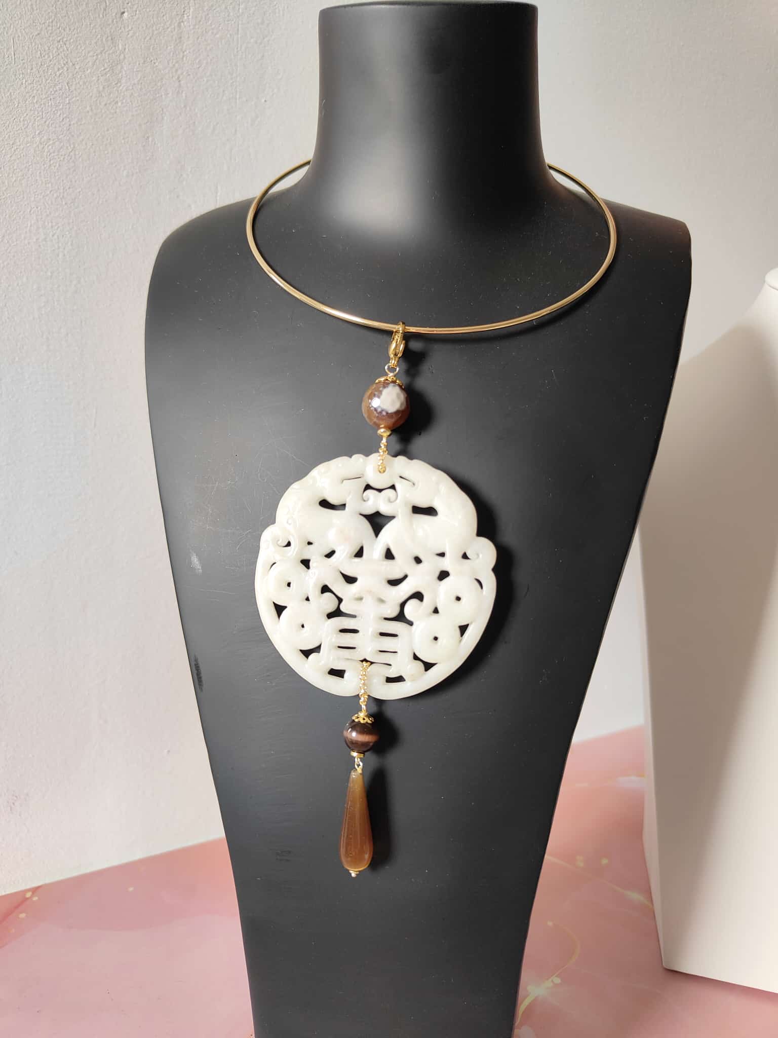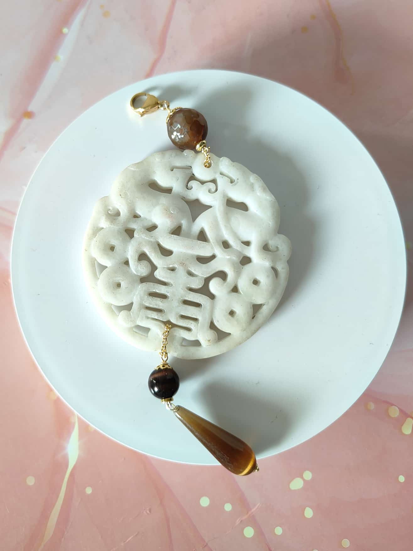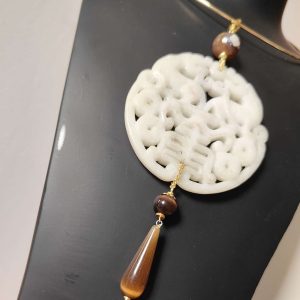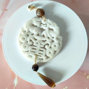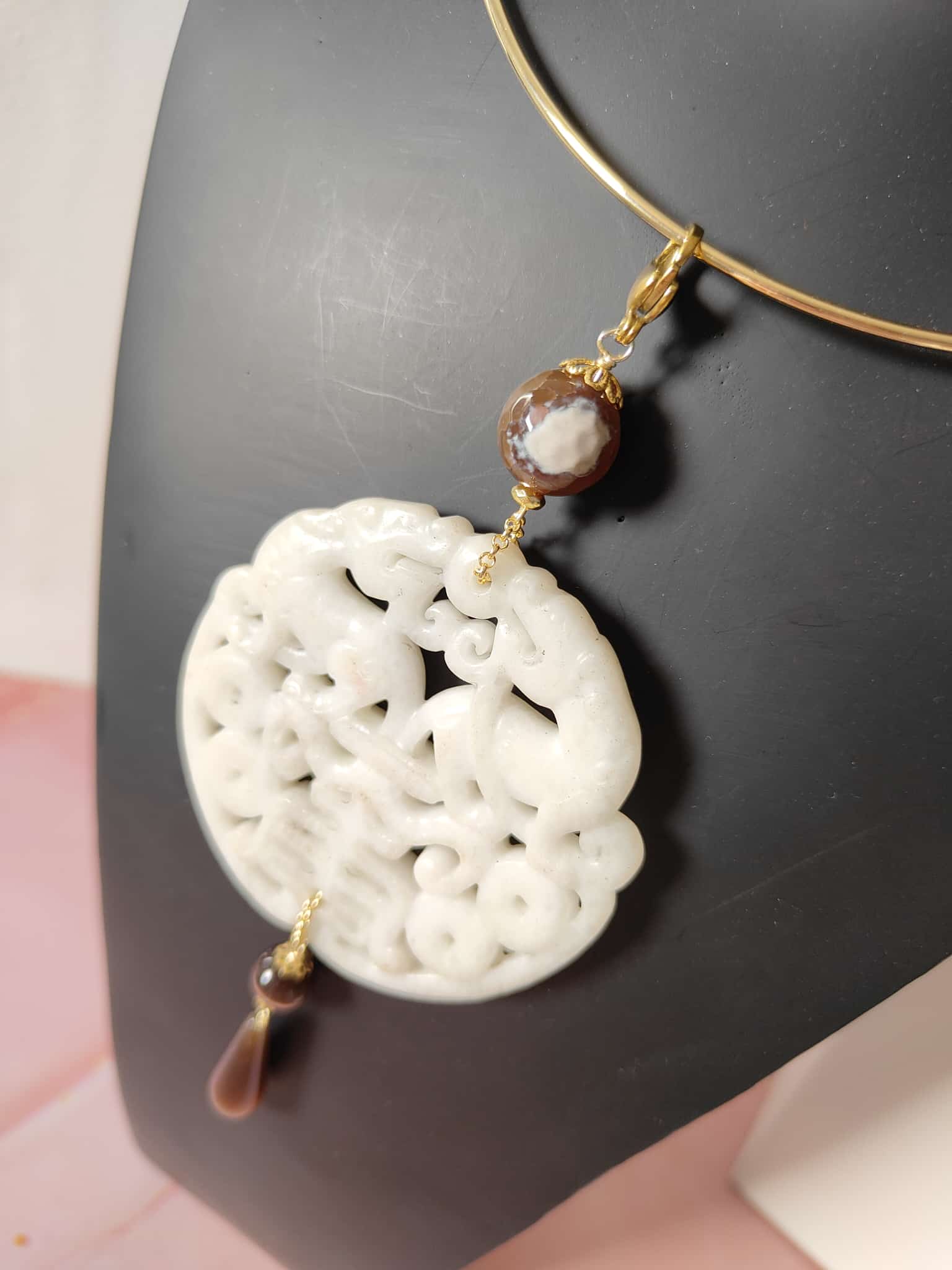 Il ciondolo principale è un mandala scolpito in giada antica color avorio, intagliato con motivi orientali di fortuna e prosperità. Le linee morbide e le sfumature chiare donano al pezzo un’aura delicata e spirituale, perfetta per chi ama la bellezza sobria e senza tempo.