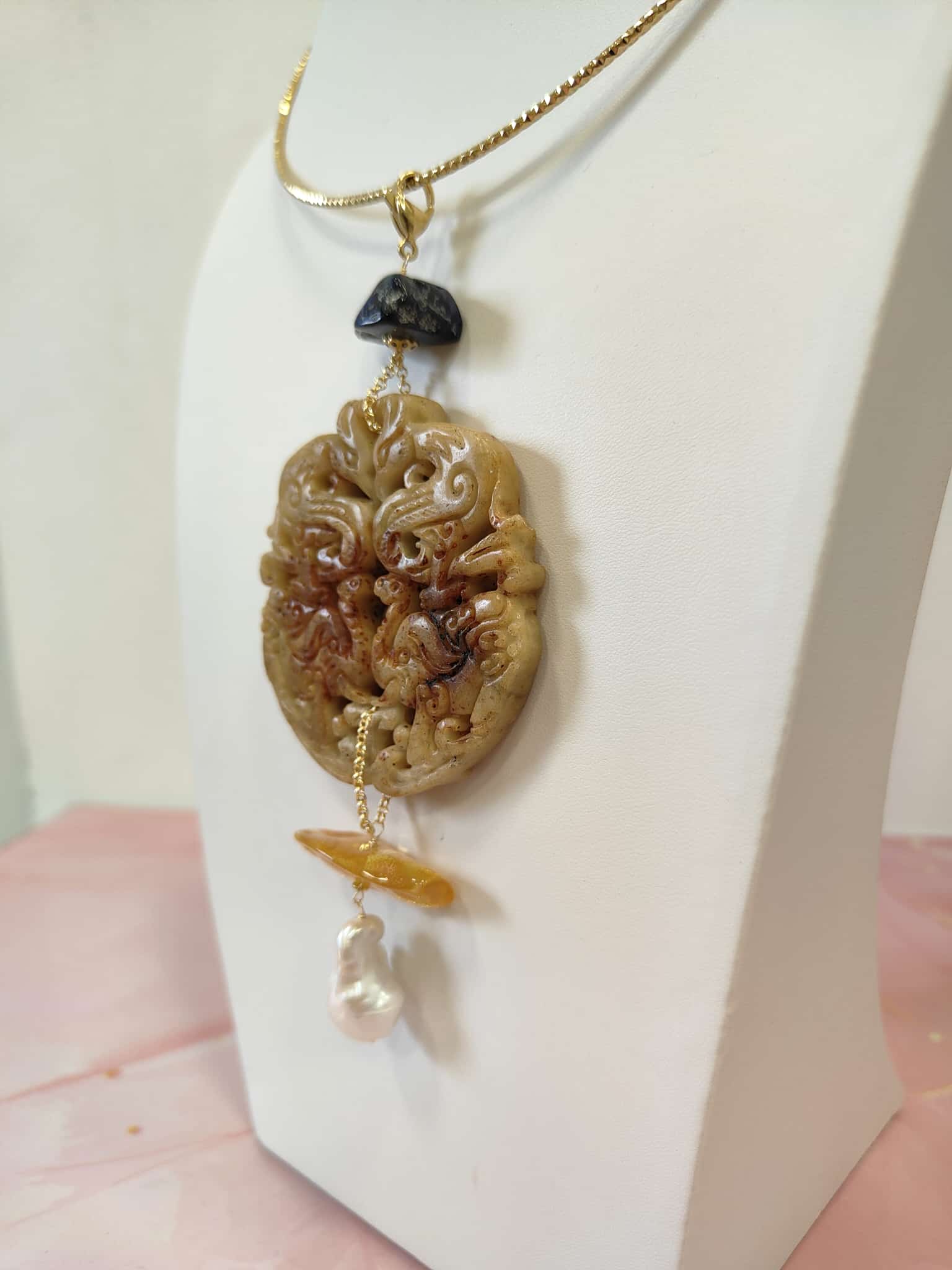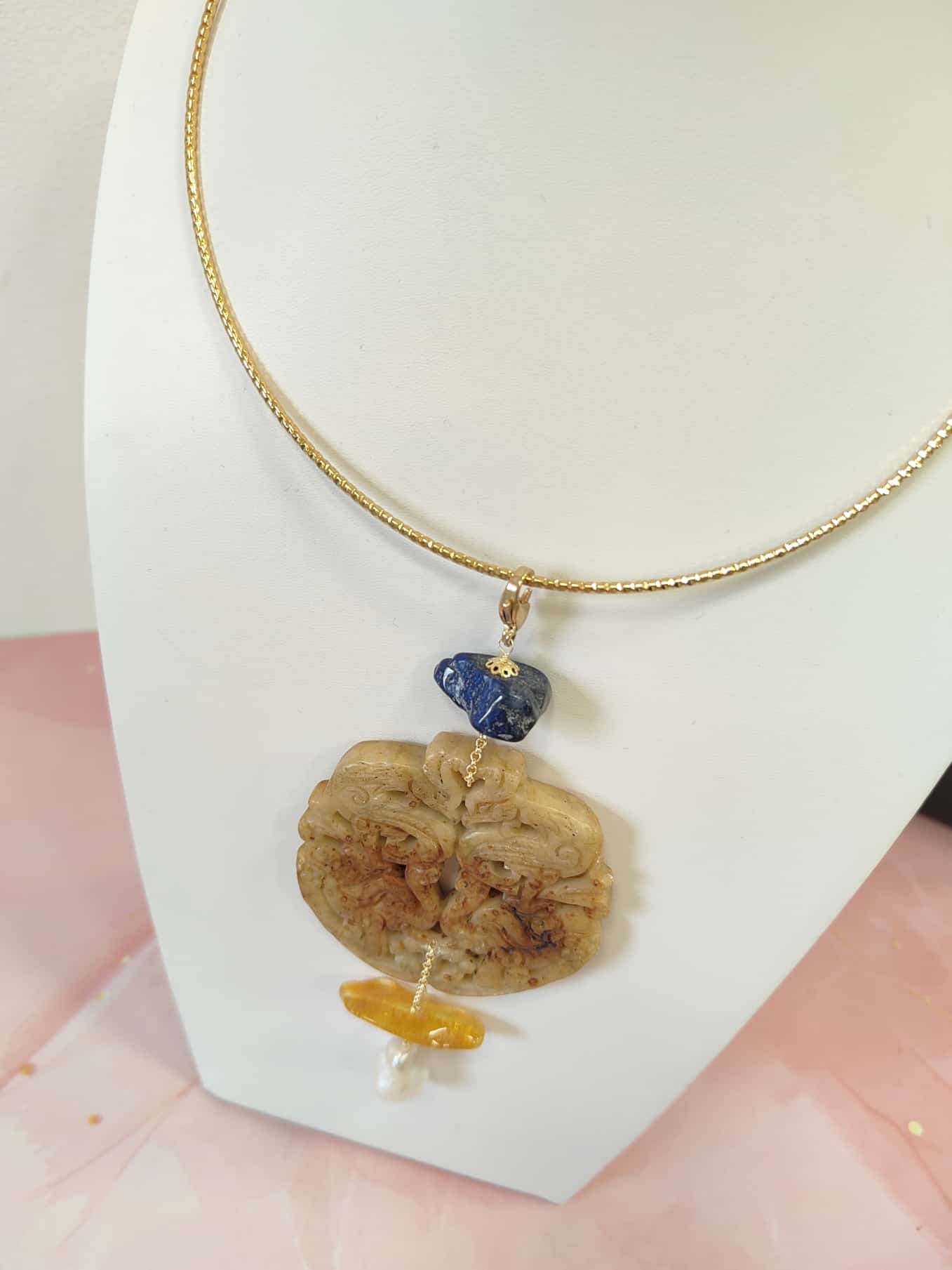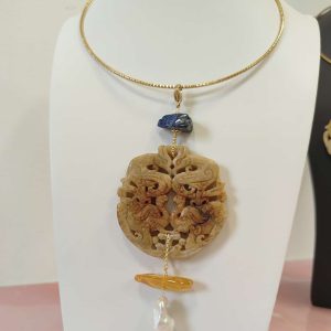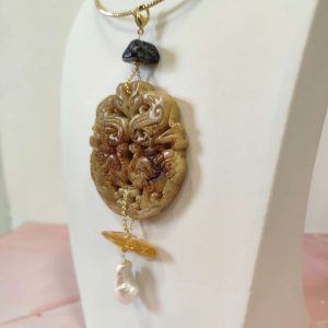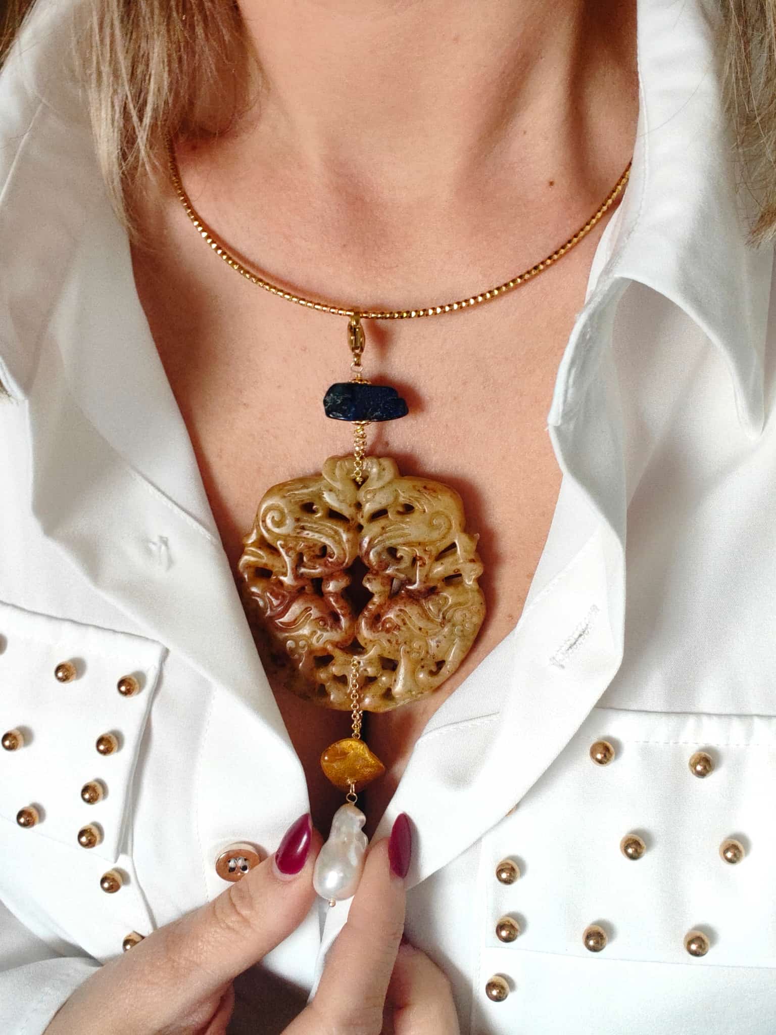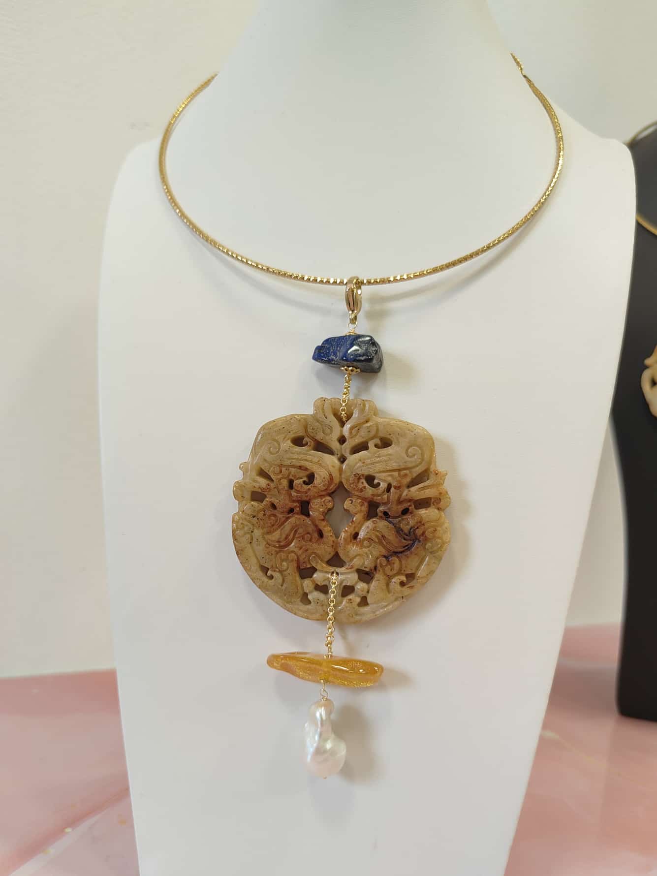 Materiali: giada antica, ambra baltica naturale, lapislazzuli grezzo, perla barocca, acciaio dorato