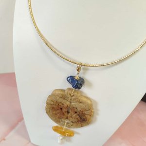 Ogni pietra è scelta con cura per la sua bellezza e il suo significato. La giada è simbolo di equilibrio e prosperità; l’ambra richiama il calore e la luce del sole; la perla rappresenta la purezza e la saggezza. Il lapis lazuli, con la sua energia celeste, aggiunge profondità e protezione. Insieme, creano un’armonia perfetta tra colore, forma e luce.